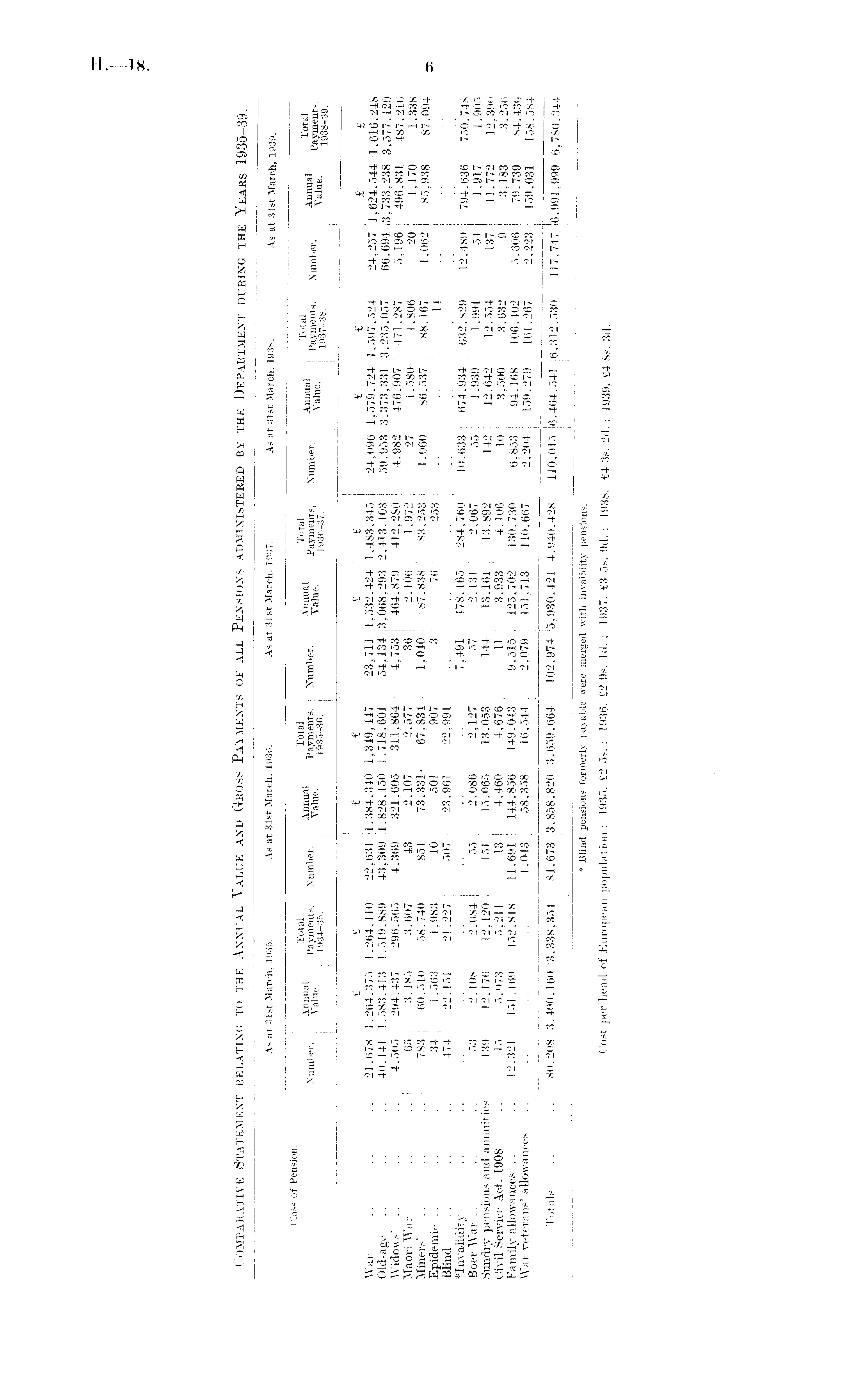 Comparative Statement relating to the Annual Value and Gross Payments of all Pensions administered by the Department during the Years 1935-39.