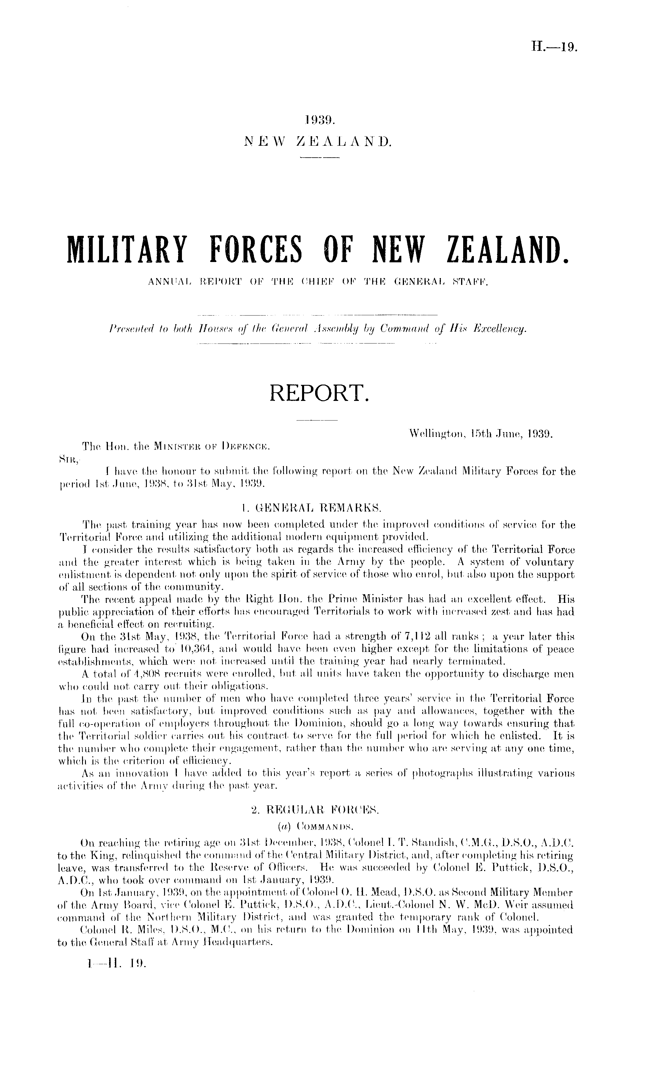 Wellington, 15th June, 1939. The Hon. the Minister of Defence. Sir, — I have the honour to submit the following report on the New Zealand Military Forces for the period Ist June, 1938, to 31st May, 1939. 1. GENERAL REMARKS. The past training year has now been completed under the improved conditions of service for the Territorial Force and utilizing the additional modern equipment provided. I consider the results satisfactory both as regards the increased efficiency of the Territorial Force and the greater interest which is being taken in the Army by the people. A system of voluntary enlistment is dependent not only upon the spirit of service of those who enrol, but also upon the support of all sections of the community. The recent appeal made by the Right Hon. the Prime Minister has had an excellent effect. His public appreciation of their efforts has encouraged Territorials to work with increased zest and has had a beneficial efEect on recruiting. On the 31st May, 1938, the Territorial Force had a strength of 7,112 all ranks ; a year later this figure had increased to 10,364, and would have been even higher except for the limitations of peace establishments, which were not increased until the training year had nearly terminated. A total of 4,808 recruits were enrolled, but all units have taken the opportunity to discharge men who could not carry out their obligations. In the past the number of men who have completed three years' service in the Territorial Force has not been satisfactory, but improved conditions such as pay and allowances, together with the full co-operation of employers throughout the Dominion, should go a long way towards ensuring that the Territorial soldier carries out his contract to serve for the full period for which he enlisted. It is the number who complete their engagement, rather than the number who are serving at any one time, which is the criterion of efficiency. As an innovation I have added to this year's report a series of photographs illustrating various activities of the Army during the past year. 2. REGULAR FORCES. (a) Commands. On reaching the retiring age on 31st December, 1938, Colonel I. T. Standish, C.M.G., D.5.0., A.D.C. to the King, relinquished the command of the Central Military District, and, after completing his retiring leave, was transferred to the Reserve of Officers. He was succeeded by Colonel E. Puttick, D.5.0., A.D.C., who took over command on Ist January, 1939. On Ist January, 1939, on the appointment of Colonel 0. H. Mead, D.S.O. as Second Military Member of the Army Board, vice Colonel E. Puttick, D.5.0., A.D.C., Lieut.-Colonel N. W. McD. Weir assumed command of the Northern Military District, and was granted the temporary rank of Colonel. Colonel R. Miles, D.5.0., M.C., on his return to the Dominion on I Ith May, 1939, was appointed to the General Staff at Army Headquarters,