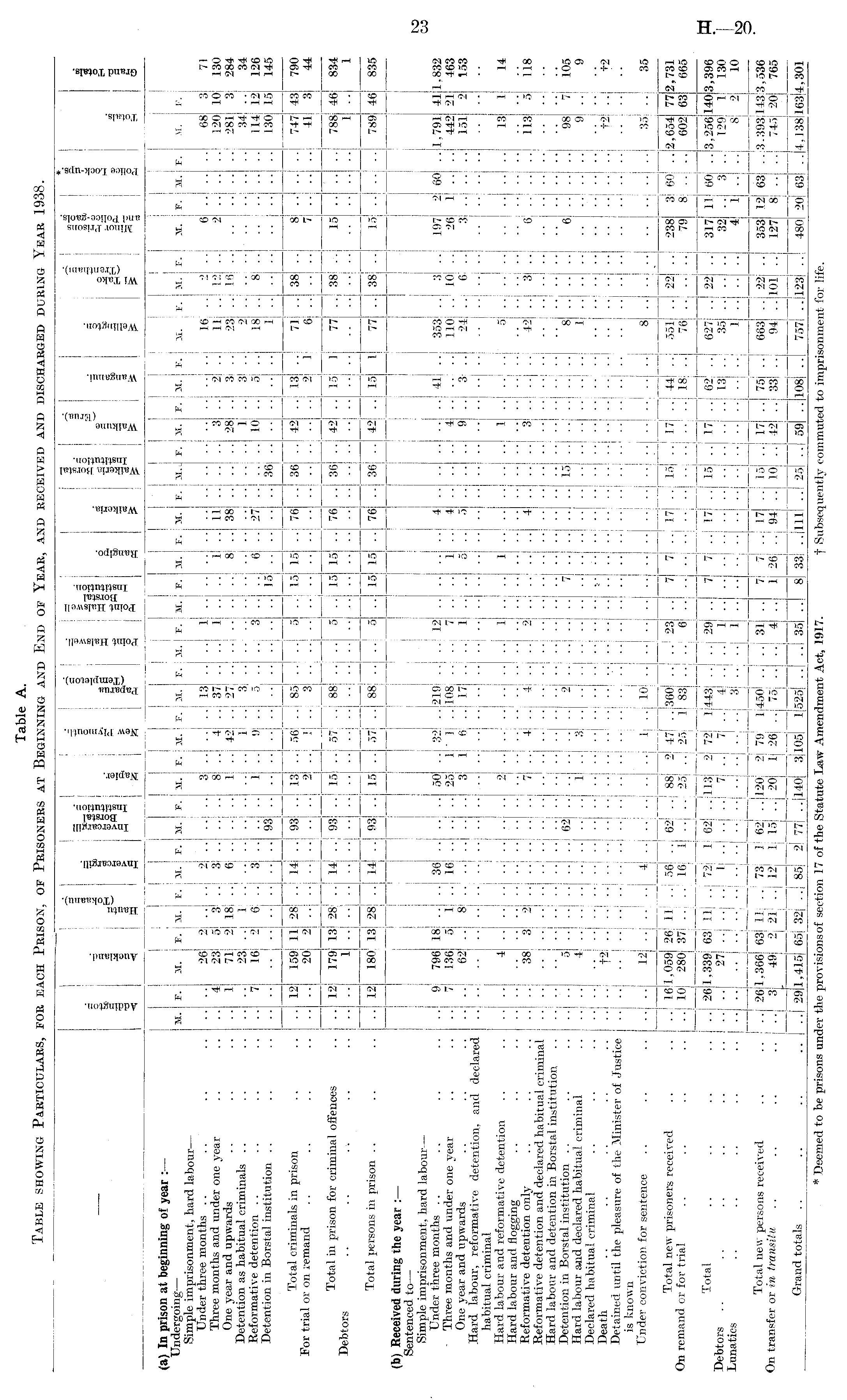 Table A. Table showing Particulars, for each Prison, of Prisoners at Beginning and End of Year, and received and discharged during Year 1938.
