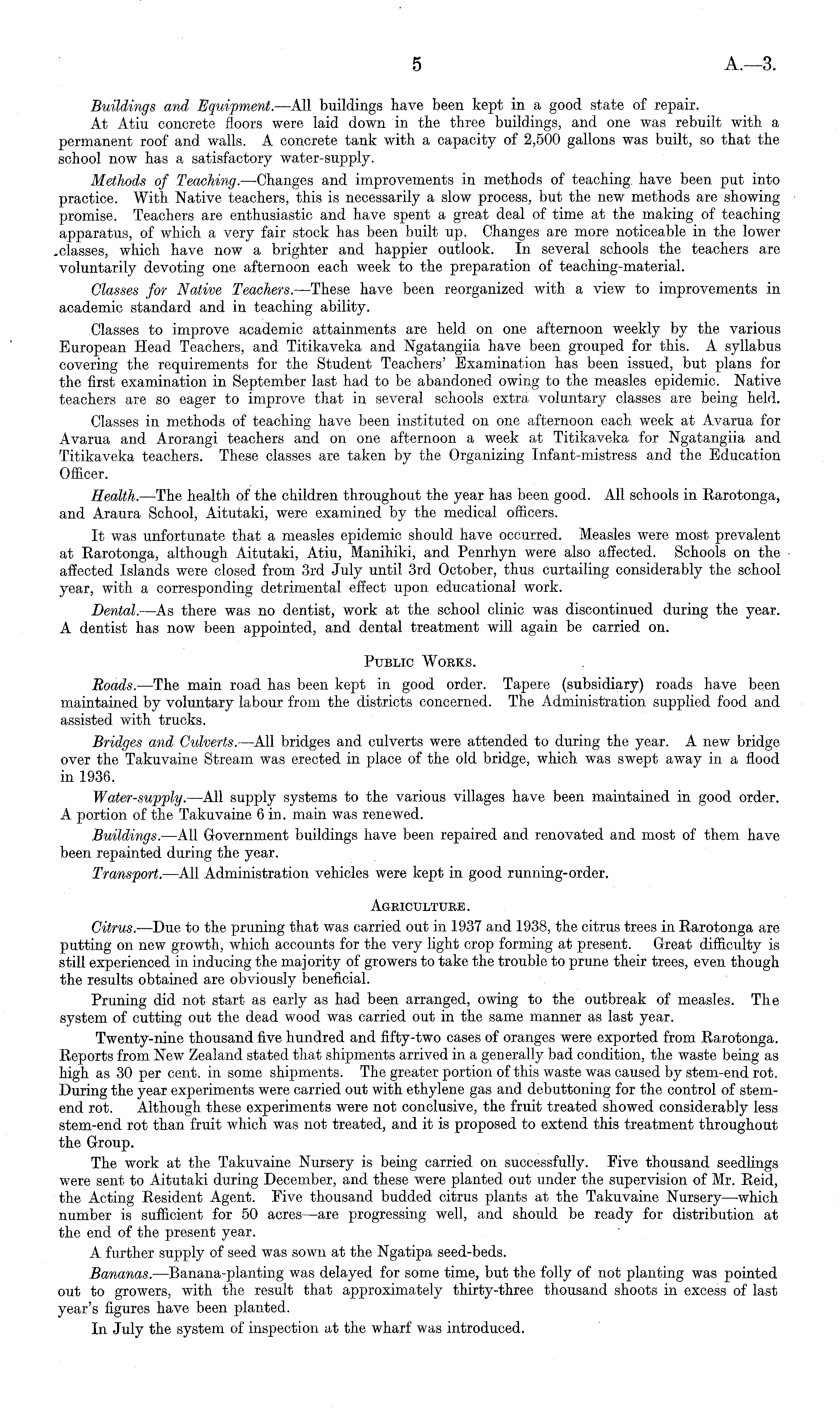 Buildings and Equipment. —All buildings have been kept in a good state of repair. At Atiu concrete floors were laid down in the three buildings, and one was rebuilt with a permanent roof and walls. A concrete tank with a capacity of 2,500 gallons was built, so that the school now has a satisfactory water-supply. Methods of Teaching. —Changes and improvements in methods of teaching, have been put into practice. With Native teachers, this is necessarily a slow process, but the new methods are showing promise. Teachers are enthusiastic and have spent a great deal of time at the making of teaching apparatus, of which a very fair stock has been built up. Changes are more noticeable in the lower .classes, which have now a brighter and happier outlook. In several schools the teachers are voluntarily devoting one afternoon each week to the preparation of teaching-material. Classes for Native Teachers. —These have been reorganized with a view to improvements in academic standard and in teaching ability. Classes to improve academic attainments are held on one afternoon weekly by the various European Head Teachers, and Titikaveka and Ngatangiia have been grouped for this. A syllabus covering the requirements for the Student Teachers' Examination has been issued, but plans for the first examination in September last had to be abandoned owing to the measles epidemic. Native teachers are so eager to improve that in several schools extra voluntary classes are being held. Classes in methods of teaching have been instituted on one afternoon each week at Avarua for Avarua and Arorangi teachers and on one afternoon a week at Titikaveka for Ngatangiia and Titikaveka teachers. These classes are taken by the Organizing Infant-mistress and the Education Officer. Health. —The health of the children throughout the year has been good. All schools in Rarotonga, and Araura School, Aitutaki, were examined by the medical officers. It was unfortunate that a measles epidemic should have occurred. Measles were most prevalent at Rarotonga, although Aitutaki, Atiu, Manihiki, and Penrhyn were also affected. Schools on the affected Islands were closed from 3rd July until 3rd October, thus curtailing considerably the school year, with a corresponding detrimental effect upon educational work. Dental. —As there was no dentist, work at the school clinic was discontinued during the year. A dentist has now been appointed, and dental treatment will again be carried on. Public Works. Roads. —The main road has been kept in good order. Tapere (subsidiary) roads have been maintained by voluntary labour from the districts concerned. The Administration supplied food and assisted with trucks. Bridges and Cidverts. —All bridges and culverts were attended to during the year. A new bridge over the Takuvaine Stream was erected in place of the old bridge, which was swept away in a flood in 1936. Water-supply. —All supply systems to the various villages have been maintained in good order. A portion of the Takuvaine 6 in. main was renewed. Buildings.—All Government buildings have been repaired and renovated and most of them have been repainted during the year. Transport.• —All Administration vehicles were kept in good running-order. Agriculture. Citrus. —Due to the pruning that was carried out in 1937 and 1938, the citrus trees in Rarotonga are putting on new growth, which accounts for the very light crop forming at present. Great difficulty is still experienced in inducing the majority of growers to take the trouble to prune their trees, even though the results obtained are obviously beneficial. Pruning did not start as early as had been arranged, owing to the outbreak of measles. The system of cutting out the dead wood was carried out in the same manner as last year. Twenty-nine thousand five hundred and fifty-two cases of oranges were exported from Rarotonga. Reports from New Zealand stated that shipments arrived in a generally bad condition, the waste being as high as 30 per cent, in some shipments. The greater portion of this waste was caused by stem-end rot. During the year experiments were carried out with ethylene gas and debuttoning for the control of stemend rot. Although these experiments were not conclusive, the fruit treated showed considerably less stem-end rot than fruit which was not treated, and it is proposed to extend this treatment throughout the Group. The work at the Takuvaine Nursery is being carried on successfully. Five thousand seedlings were sent to Aitutaki during December, and these were planted out under the supervision of Mr. Reid, the Acting Resident Agent. Five thousand budded citrus plants at the Takuvaine Nursery—which number is sufficient for 50 acres —are progressing well, and should be ready for distribution at the end of the present year. A further supply of seed was sown at the Ngatipa seed-beds. Bananas. —Banana-planting was delayed for some time, but the folly of not planting was pointed out to growers, with the result that approximately thirty-three thousand shoots in excess of last year's figures have been planted. In July the system of inspection at the wharf was introduced.