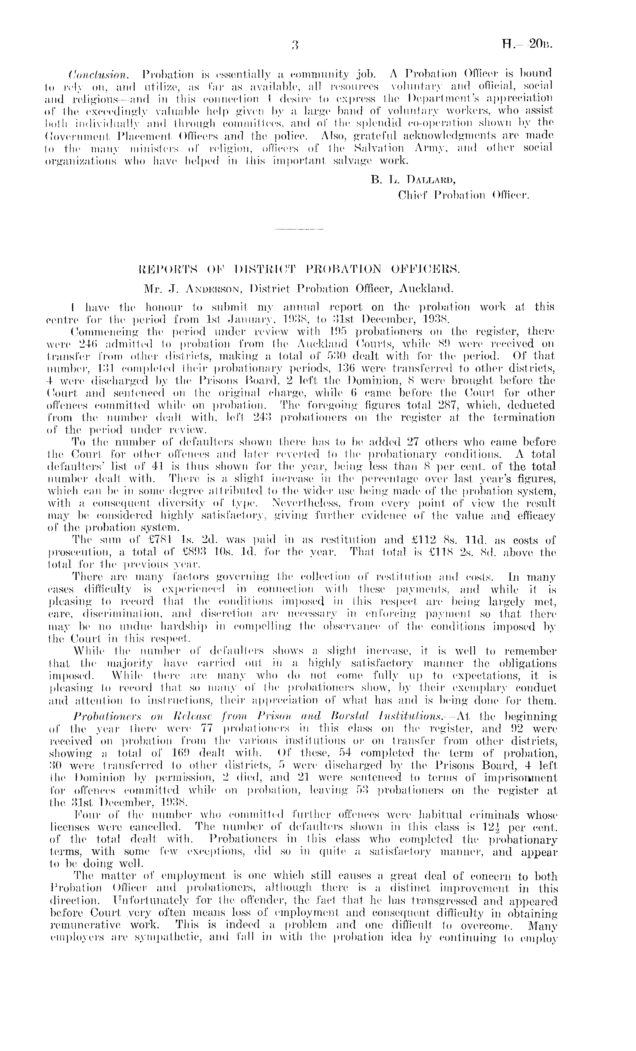 REPORTS OF DISTRICT PROBATION OFFICERS. Mr. J. Anderson, District Probation Officer, Auckland. I have the honour to submit my annual report on the probation work at this centre for the period from Ist January, 1938, to 31st December, 1938. Commencing the period under review with 195 probationers on the register, there were 246 admitted to probation from the Auckland Courts, while 89 were received on transfer from other districts, making a total of 530 dealt with for the period. Of that number, 131 completed their probationary periods, 136 were transferred to other districts, 4 were discharged by the Prisons Board, 2 left the Dominion, 8 were brought before the Court and sentenced on the original charge, while 6 came before the Court for other offences committed while on probation. The foregoing figures total 287, which, deducted from the number dealt; with, left 243 probationers on the register at the termination of the period under review. To the number of defaulters shown there has to be added 27 others who came before the Court for other offences and later reverted to the probationary conditions. A total defaulters' list of 41 is thus shown for the year, being less than 8 per cent, of the total number dealt with. There is a slight increase in the percentage over last year's figures, which can be in some degree attributed to the wider use being made of the probation system, with a consequent diversity of type. Nevertheless, from every point of view the result may be considered highly satisfactory, giving further evidence of the value and efficacy of the probation system. The sum of £781 Is. 2d. was paid in as restitution and £112 Bs. lid. as costs of prosecution, a total of £893 10s. Id. for the year. That total is £118 2s. Bd. above the total for the previous year. There are many factors governing the collection of restitution and costs. In many cases difficulty is experienced in connection with these payments, and while it is pleasing to record that the conditions imposed in this respect are being largely met, care, discrimination, and discretion are necessary in enforcing payment so that there may be no undue hardship in compelling the observance of the conditions imposed by the Court in this respect. While the number of defaulters shows a slight increase, it is well to remember that the majority have carried out in a highly satisfactory manner the obligations imposed. While there are many who do not come fully up to expectations, it is pleasing to record that so many of the probationers show, by their exemplary conduct and attention to instructions, their appreciation of what has and is being done for them. Probationers on. Release from, Prison and Borstal Institutions.—At the beginning of the year there were 77 probationers in this class on the register, and 92 were received on probation from the various institutions or on transfer from other districts, showing a total of 169 dealt with. Of these, 54 completed the term of probation, 30 were transferred to other districts, 5 were discharged by the Prisons Board, 4 left the Dominion by permission, 2 died, and 21 were sentenced to terms of imprisonment for offences committed while on probation, leaving 53 probationers on the register at the 31st December, 1938. Four of the number who committed further offences were habitual criminals whose licenses were cancelled. The number of defaulters shown in this class is 12| per cent, of the total dealt with. Probationers in this class who completed the probationary terms, with some few exceptions, did so in quite a satisfactory manner, and appear to be doing well. The matter of employment is one which still causes a great deal of concern to both Probation Officer and probationers, although there is a distinct improvement in this direction. Unfortunately for the offender, the fact that he has transgressed and appeared before Court very often means loss of employment and consequent difficulty in obtaining remunerative work. This is indeed a problem and one difficult to overcome. Many employers are sympathetic, and fall in with the probation idea by continuing to employ