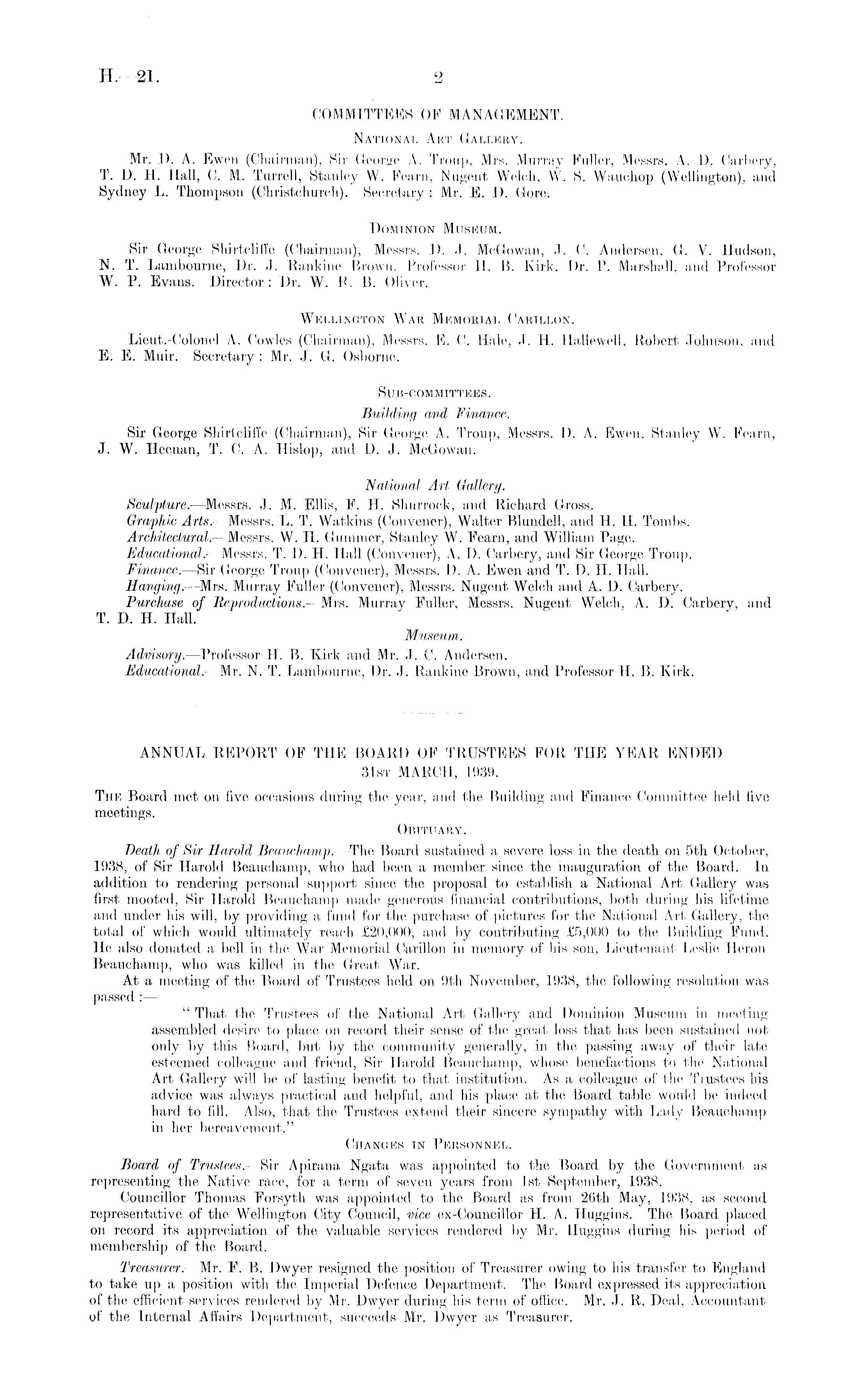 ANNUAL REPORT OF THE BOARD OF TRUSTEES FOR THE YEAR ENDED 31st MARCH, 1939. The Board met on five occasions daring the year, and the Building and Finance Committee held five meetings. Obituary. Death of Sir Harold Beauchamp.—'The Board sustained a severe loss in the death on sth October, 1938, of Sir Harold Beauchamp, who had been a member since the inauguration of the Board. In addition to rendering personal support since the proposal to establish a National Art Gallery was first mooted, Sir Harold Beauchamp made generous financial contributions, both during his lifetime and under his will, by providing a fund for the purchase of pictures for the National Art Gallery, the total of which would ultimately reach £20,000, and by contributing £5,000 to the Building Fund. He also donated a bell in the War Memorial Carillon in memory of his son, Lieutenant Leslie Heron Beauchamp, who was killed in the Great War. At a meeting of the Board of Trustees held on 9th November, 1938, the following resolution was passed : — " That the Trustees of the National Art Gallery and Dominion Museum in meeting assembled desire to place on record their sense of the great loss that has been sustained not only by this Board, but by the community generally, in the passing away of their late esteemed colleague and friend, Sir Harold Beauchamp, whose benefactions to the National Art Gallery will be of lasting benefit to that institution. As a colleague of the Trustees his advice was always practical and helpful, and his place at the Board table would be indeed hard to fill. Also, that the Trustees extend their sincere sympathy with Lady Beauchamp in her bereavement." Changes in Personnel. Board of Trustees. —Sir Apirana Ngata was appointed to the Board by the Government as representing the Native race, for a term of seven years from Ist September, 1938. Councillor Thomas Forsyth was appointed to the Board as from 26th May, 1938, as second representative of the Wellington City Council, vice ex-Councillor H. A. Huggins. The Board placed on record its appreciation of the valuable services rendered by Mr. Huggins during his period of membership of the Board. Treasurer.—Mr. F. B. Dwyer resigned the position of Treasurer owing to his transfer to England to take up a position with the Imperial Defence Department. The Board expressed its appreciation of the efficient services rendered by Mr. Dwyer during his term of office. Mr, J, R, Deal, Accountant of the Internal Affairs Department, succeeds Mr, Dwyer as Treasurer.