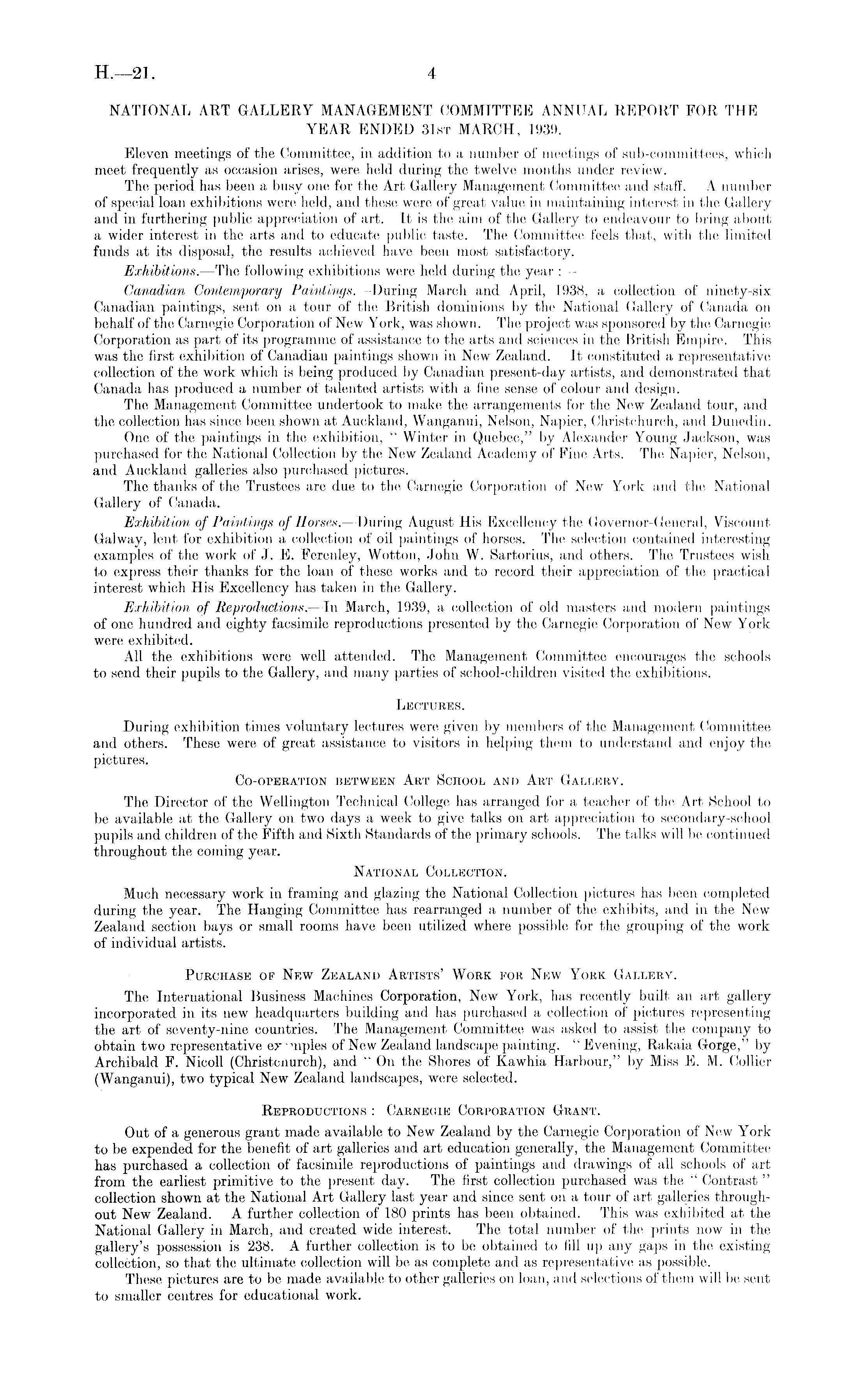 NATIONAL ART GALLERY MANAGEMENT COMMITTEE ANNUAL REPORT FOR THE YEAR ENDED 31st MARCH, 1939. Eleven meetings of the Committee, in addition to a number of meetings of sub-committees, which meet frequently as occasion arises, were held during the twelve months under review. The period has been a busy one for the Art Gallery Management Committee and staff. A number of special loan exhibitions were held, and these were of great value in maintaining interest in the Gallery and in furthering public appreciation of art. It is the aim of the Gallery to endeavour to bring about a wider interest in the arts and to educate public taste. The Committee feels that, with the limited funds at its disposal, the results achieved have been most satisfactory. Exhibitions. —The following exhibitions were held during the year : — Canadian Contemporary Paintings.—During March and April, 1938, a collection of ninety-six Canadian paintings, sent on a tour of the British dominions by the National Gallery of Canada on behalf of the Carnegie Corporation of New York, was shown. The project was sponsored by the Carnegie Corporation as part of its programme of assistance to the arts and sciences in the British Empire. This was the first exhibition of Canadian paintings shown in New Zealand. It constituted a representative collection of the work which is being produced by Canadian present-day artists, and demonstrated that Canada has produced a number of talented artists with a fine sense of colour and design. The Management Committee undertook to make the arrangements for the New Zealand tour, and the collection has since been shown at Auckland, Wanganui, Nelson, Napier, Christchurch, and Dunediu. One of the paintings in the exhibition, " Winter in Quebec," by Alexander Young Jackson, was purchased for the National Collection by the New Zealand Academy of Fine Arts. The Napier, Nelson, and Auckland galleries also purchased pictures. The thanks of the Trustees are due to the Carnegie Corporation of New York and the National Gallery of Canada. Exhibition of Paintings of Horses. —During August His Excellency the Governor-General, Viscount Galway, lent for exhibition a collection of oil paintings of horses. The selection contained interesting examples of the work of J. E. Ferenley, Wotton, John W. Sartorius, and others. The Trustees wish to express their thanks for the loan of these works and to record their appreciation of the practical interest which His Excellency has taken in the Gallery. Exhibition of Reproductions. —In March, 1939, a collection of old masters and modern paintings of one hundred and eighty facsimile reproductions presented by the Carnegie Corporation of New York were exhibited. All the exhibitions were well attended. The Management Committee encourages the schools to send their pupils to the Gallery, and many parties of school-children visited the exhibitions. Lectures. During exhibition times voluntary lectures were given by members of the Management Committee and others. These were of great assistance to visitors in helping them to understand and enjoy the pictures. Co-operation between Art School and Art Gallery. The Director of the Wellington Technical College has arranged for a teacher of the Art School to be available at the Gallery on two days a week to give talks on art appreciation to secondary-school pupils and children of the Fifth and Sixth Standards of the primary schools. The talks will be continued throughout the coming year. National Collection. Much necessary work in framing and glazing the National Collection pictures has been completed during the year. The Hanging Committee has rearranged a number of the exhibits, and in the New Zealand section bays or small rooms have been utilized where possible for the grouping of the work of individual artists. Purchase of New Zealand Artists' Work for New York Gallery. The International Business Machines Corporation, New York, has recently built an art gallery incorporated in its new headquarters building and has purchased a collection of pictures representing the art of seventy-nine countries. The Management Committee was asked to assist the company to obtain two representative examples of New Zealand landscape painting. " Evening, Rakaia Gorge," by Archibald F. Nicoll (Christcnurch), and " On the Shores of Kawhia Harbour," by Miss E. M. Collier (Wanganui), two typical New Zealand landscapes, were selected. Reproductions : Carnegie Corporation Grant. Out of a generous grant made available to New Zealand by the Carnegie Corporation of New York to be expended for the benefit of art galleries and art education generally, the Management Committee has purchased a collection of facsimile reproductions of paintings and drawings of all schools of art from the earliest primitive to the present day. The first collection purchased was the " Contrast " collection shown at the National Art Gallery last year and since sent on a tour of art galleries throughout New Zealand. A further collection of 180 prints has been obtained. This was exhibited at the National Gallery in March, and created wide interest. The total number of the prints now in the gallery's possession is 238. A further collection is to be obtained to fill up any gaps in the existing collection, so that the ultimate collection will be as complete and as representative as possible. These pictures are to be made available to other galleries on loan, and selections of them will be sent to smaller centres for educational work.