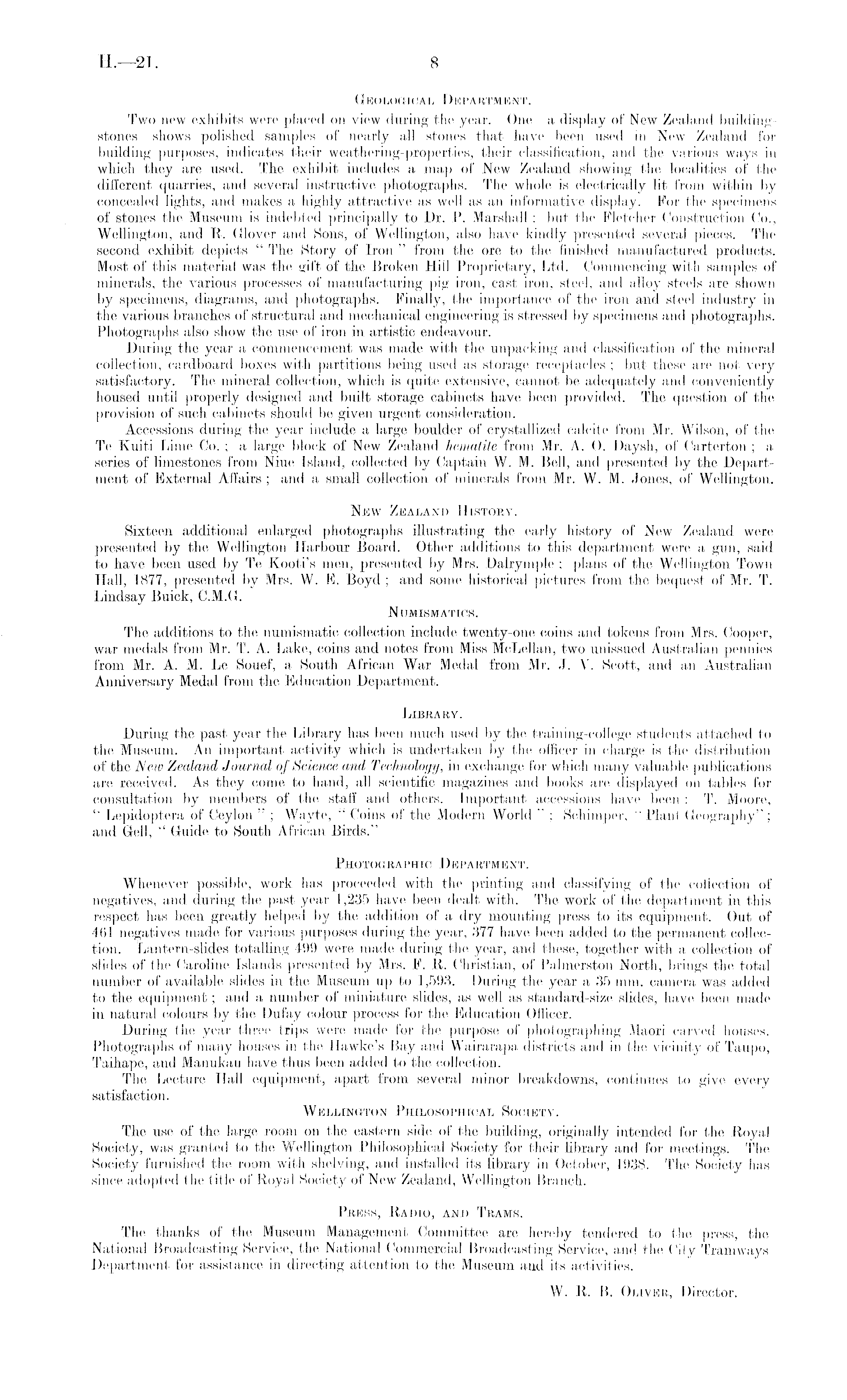 Geological Department. Two new exhibits were placed on view during the year. One—a display of New Zealand buildingstones —shows polished samples of nearly all stones that have been used in New Zealand for building purposes, indicates their weathering-properties, their classification, and the various ways in which they are used. The exhibit includes a map of New Zealand showing the localities of the different quarries, and several instructive photographs. The whole is electrically lit from within by concealed lights, and makes a highly attractive as well as an informative display. For the specimens of stones the Museum is indebted principally to Dr. P. Marshall; but the Fletcher Construction Co., Wellington, and R. Glover and Sons, of Wellington, also have kindly presented several pieces. The second exhibit depicts " The Story of Iron " from the ore to the finished manufactured products. Most of this material was the gift of the Broken Hill Proprietary, Ltd. Commencing with samples of minerals, the various processes of manufacturing pig iron, cast iron, steel, and alloy steels are shown by specimens, diagrams, and photographs. Finally, the importance of the iron and steel industry in the various branches of structural and mechanical engineering is stressed by specimens and photographs. Photographs also show the use of iron in artistic endeavour. During the year a commencement was made with the unpacking and classification of the mineral collection, cardboard boxes with partitions being used as storage receptacles ; but these are not very satisfactory. The mineral collection, which is quite extensive, cannot be adequately and conveniently housed until properly designed and built storage cabinets have been provided. The question of the provision of such cabinets should be given urgent consideration. Accessions during the year include a large boulder of crystallized calcite from Mr. Wilson, of the Te Kuiti Lime Co. ; a large block of New Zealand hematite from Mr. A. 0. Daysh, of Carterton ; a series of limestones from Niue Island, collected by Captain W. M. Bell, and presented by the Department of External Affairs ; and a small collection of minerals from Mr. W. M. Jones, of Wellington. New Zealand History. Sixteen additional enlarged photographs illustrating the early history of New Zealand were presented by the Wellington Harbour Board. Other additions to this department were a gun, said to have been used by Te Kooti's men, presented by Mrs. Dalrymple ; plans of the Wellington Town Hall, 1877, presented by Mrs. W. E. Boyd; and some historical pictures from the bequest of Mr. T. Lindsay Buick, C.M.G. Numismatics. The additions to the numismatic collection include twenty-one coins and tokens from M'rs. Cooper, war medals from Mr. T. A. Lake, coins and notes from Miss McLellan, two unissued Australian pennies from Mr. A. M. Le Souef, a South African War Medal from Mr. J. V. Scott, and an Australian Anniversary Medal from the Education Department. Library. During the past year the Library has been much used by the training-college students attached to the Museum. An important activity which is undertaken by the officer in charge is the distribution of the New Zealand Journal of Science and Technology, in exchange for which many valuable publications are received. As they come to hand, all scientific magazines and books are displayed on tables for consultation by members of the staff and others. Important accessions have been : T. Moore, " Lepidoptera of Ceylon " ; Wayte, " Coins of the Modern World " ; Schimper, " Plant Geography"; and Gell, " Guide to South African Birds." Photographic Depabtment. Whenever possible, work has proceeded with the printing and classifying of the collection of negatives, and during the past year 1,235 have been dealt with. The work of the department in this respect has been greatly helped by the addition of a dry mounting press to its equipment. Out of 461 negatives made for various purposes during the year, 377 have been added to the permanent collection. Lantern-slides totalling 499 were made during the year, and these, together with a collection of slides of the Caroline Islands presented by Mrs. F. R. Christian, of Palmerston North, brings the total number of available slides in the Museum up to 1,593. During the year a 35 mm. camera was added to the equipment; and a number of miniature slides, as well as standard-size slides, have been made in natural colours by the Dufay colour process for the Education Officer. During the year three trips were made for the purpose of photographing Maori carved houses. Photographs of many houses in the Hawke's Bay and Wairarapa districts and in the vicinity of Taupo, Taihape, and Manukau have thus been added to the collection. The Lecture Hall equipment, apart from several minor breakdowns, continues to give every satisfaction. Wellington Philosophical Society. The use of the large room on the eastern side of the building, originally intended for the Royal Society, was granted to the Wellington Philosophical Society for their library and for meetings. The Society furnished the room with shelving, and installed its library in October, 1938. The Society has since adopted the title of Royal Society of New Zealand, Wellington Branch. Peess, Radio, and Trams. The thanks of the Museum Management Committee are hereby tendered to the press, the National Broadcasting Service, the National Commercial Broadcasting Service, and the City Tramways Department for assistance in directing attention to the Museum and its activities. W. R. B. Oliver, Director.