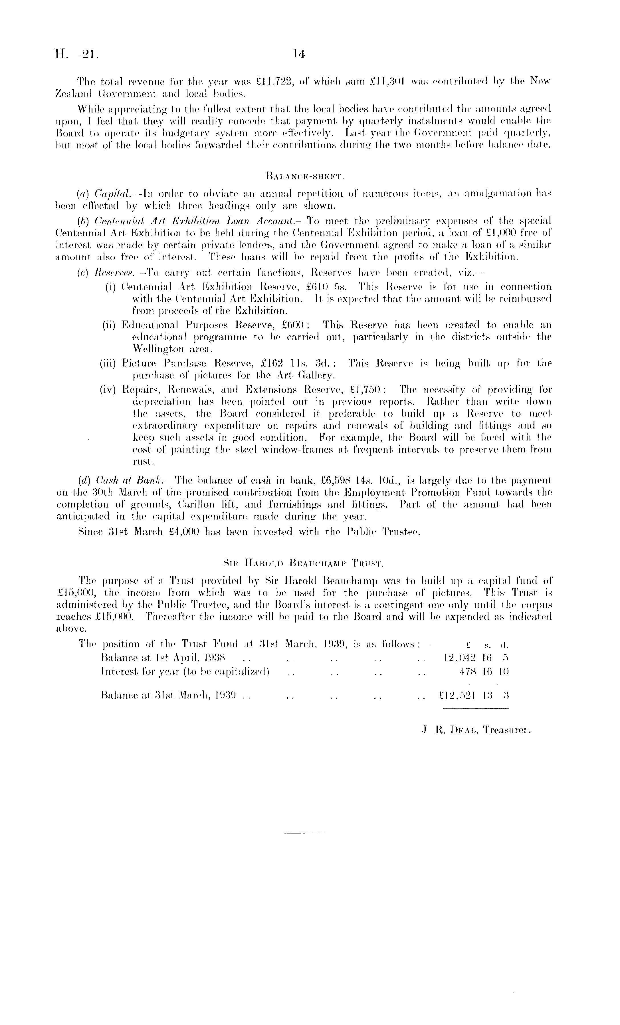 The total revenue for the year was £11,722, of which sum £11,301 was contributed by the New Zealand Government and local bodies. While appreciating to the fullest extent that the local bodies have contributed the amounts agreed upon, I feel that they will readily concede that payment by quarterly instalments would enable the Board to operate its budgetary system more effectively. Last year the Government paid quarterly, but most of the local bodies forwarded their contributions during the two months before balance date. Balance-sheet. (a) Capital.—ln order to obviate an annual repetition of numerous items, an amalgamation has been effected by which three headings only are shown. (b) Centennial Art Exhibition Loan Account. —To meet the preliminary expenses of the special Centennial Art Exhibition to be held during the Centennial Exhibition period, a loan of £1,000 free of interest was made by certain private lenders, and the Government agreed to make a loan of a similar amount also free of interest. These loans will be repaid from the profits of the Exhibition. (c) Reserves. —To carry out certain functions, Reserves have been created, viz.— (i) Centennial Art Exhibition Reserve, £610 ss. This Reserve is for use in connection with the Centennial Art Exhibition. It is expected that the amount will be reimbursed from proceeds of the Exhibition. (ii) Educational Purposes Reserve, £600 : This Reserve has been created to enable an educational programme to be carried out, particularly in the districts outside the Wellington area. (iii) Picture Purchase Reserve, £162 lis. 3d.: This Reserve is being built up for the purchase of pictures for the Art Gallery. (iv) Repairs, Renewals, and Extensions Reserve, £1,750 : The necessity of providing for depreciation has been pointed out in previous reports. Rather than write down the assets, the Board considered it preferable to build up a Reserve to meet extraordinary expenditure on repairs and renewals of building and fittings and so keep such assets in good condition. For example, the Board will be faced with the cost of painting the steel window-frames at frequent intervals to preserve them from rust. (d) Cash at Bank.—The balance of cash in bank, £6,598 14s. Iod., is largely due to the payment on the 30th March of the promised contribution from the Employment Promotion Fund towards the completion of grounds, Carillon lift, and furnishings and fittings. Part of the amount had been anticipated in the capital expenditure made during the year. Since 31st March £4,000 has been invested with the Public Trustee. Sir Harold Beauohamp Trust. The purpose of a Trust provided by Sir Harold Beauchamp was to build up a capital fund of £15,000, the income from which was to be used for the purchase of pictures. This- Trust is administered by the Public Trustee, and the Board's interest is a contingent one only until the corpus reaches £15,000. Thereafter the income will be paid to the Board and will be expended as indicated above. The position of the Trust Fund at 31st, March, 1939, is as follows :—- £ a. <1. Balance at Ist April, 1938 .. .. .. .. .. 12,042 16 5 Interest for year (to be capitalized) .. .. .. .. 478 16 10 Balance at 31st, March, 1939 . . .. .. .. .. £12,521 13 3 J R. Deal, Treasurer.