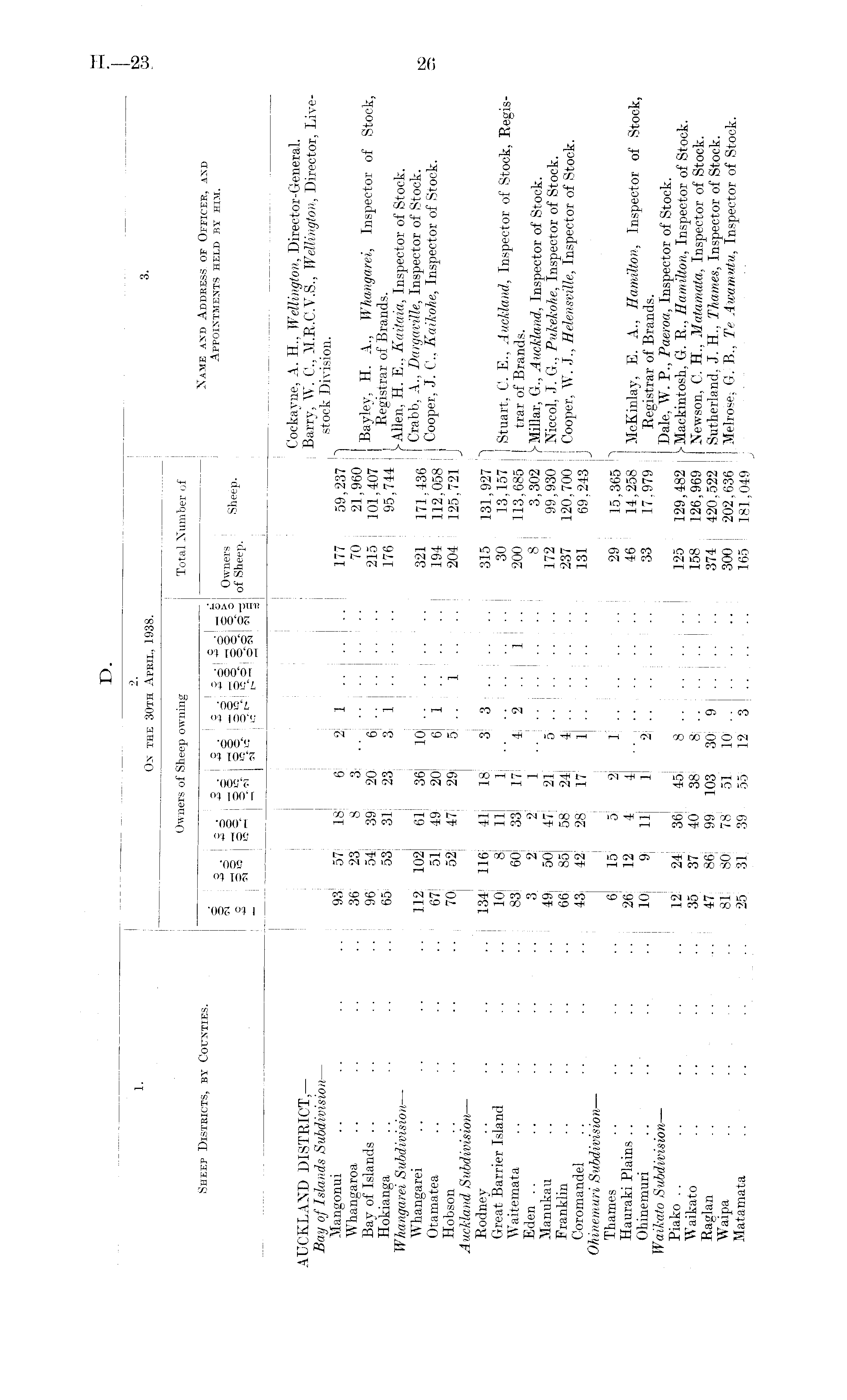 1. 2 - 1 o ON the 30TH APKIL, 1938. ; Owners of Sheep owning Total Number of Sheep Districts, by Counties. ~~ 1 j i j I I . Name and Address op Offices, and 1 ! 3 § °§ £g :§ :§ :§ -s ll Owner, , h Appointments held by him. 5 g§ IS 8S 81 || ®-g of Sheep. Sheep. r—i I—' "M iO 1 I 1 I * j i 4TTPKT AXTT) niy'l-RH'T ' Cockayne, A. H., Wellington, Director-General. AUCKLAND DISTRICT- : Barry, W. C., M.R.C.V.S., Wellington, Director, LiveBay oj Islands subdivision — stock Division Mangonui .. .. .. .. 93 57 18 6 2 1 177 59,237 "] Whangaroa .. .. .. . . : 36 23 8 3 70 21,960 I „ , „ . m Bay of Islands .. .. .. .. ! 96 54 39 20 6 215 101 407 I "W' 11 • A > Whangarei, Inspector of Stock, Hokianga .. .. .. .. 65 53 31 23 3 1 176 95J44 ! Registrar of Brands. Whangarei Subdivision — I I ' ' Allen, H. E., Kaitaia, Inspector of Stock. Whangarei .. .. . . .. 112 102 61 36 10 321 171 436 ! A -> Dargaville, Inspector of Stock. Otamatea .. .. .. . . 67 51 49 20 6 1 194 112 058 I Cooper, J. C., Kaikohe, Inspector of Stock. Hobson .. .. .. .. ! 70 52 47 29 5 .. 1 .. .. 204 125J21 j Auckland Subdivision— Rodney .. .. .. .. 134 116 41 18 3 3 315 131,927 H Great Barrier Island | 10 8 11 1 30 13 > 157 I Stuart, C. E., Auckland, Inspector of Stock, RegisWaitemata .. .. .. .. 83 60 33 17 4 2:.. l| .. 200, 113,685 | trar of Brands. • • ■■ i 3 2 1 .... | ; 8 j 3,302 >• Millar, G., Auckland, Inspector of Stock. .. .. .. .. 49 50 47 21 5 .. 172 99,930 | Niccol, J. G., Putcekohe, Inspector of Stock. iranklm .. .. .. .. 66 85 58 24 4 237 120,700 Cooper, W. J Hdensmlle, Inspector of Stock. Coromandel .. .. .. . . 43 42 28 17 1 131 69,243 J Ohinemuri Subdivision — Thames .. .. .. .. 6 15 5 2 J 29 15,365 ~ Hauraki Plains .. .. .. .. I 26 12 4 4 46 14,258 McKinlay, E. A., Hamilton, Inspector of Stock, Ohmemun .. .. .. 10 9 11 1 2 .. 33 17,979: Registrar of Brands. W<nkato Subdivision— ; Dale, W. P., Paeroa, Inspector of Stock. Jt 0 •• "• ■■ 24 36 45 8 .. j .. j .. .. ! 125 129,482 G. R., Hamilton, Inspector of Stock, u .uka to .. .. .. .. 35 37 40 38 8 .. .. j .. .. 158 126,969 Newson, C. H., Matamata, Inspector of Stock. ® a g lan ~-J 47 86 99 103 30 9 ..!.. ... 374 420,522 Sutherland, J. H., Thames, Inspector of Stock. aipa . . .. . .. 81 80| 78 51 10 ! .. .... .. j 300 202,636 : Melrose; G. B., Te Awamutu, Inspector of Stock. Matamata .. .. .. .. 25: 31; 39; 55 12 3 ..... ... 165 181,049