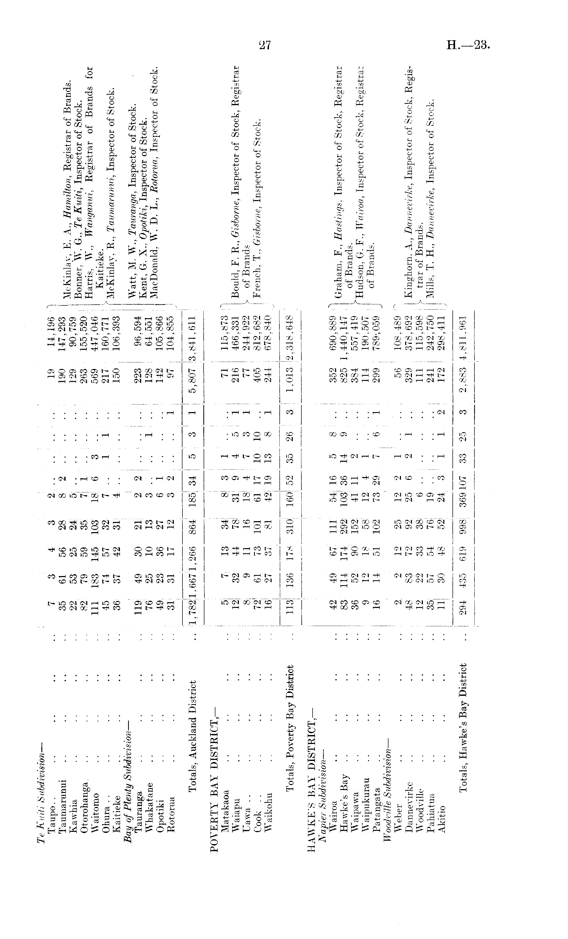 Te Kuiti Subdivision — Taupo.. i 7 3 4 3 2 .. 19 14,196 " Taumarunui .. .. .. .. 35 61 56 28 8 2 190 147,293 >. t- . t? a u u t> • t- t tj a „ , . „„ McKinlay, ft. A., Hamilton, Registrar of Brands. Kawhia .. .. .. .. 22 53 2d 24 5 129 90,759 t> w n /*> v ;■ t \ , , QO - a OK 7 , oc o i kk son Bonner, YY. G., Te Kutii, Inspector of Stock. Otorohanga .. .. .. .. 82 79 59 35 7 1 263 155,520 Harris W Warwanui Registrar of Brands for Waitomo .. .. .. .. Ill 183 145 103 18 6 3 .. .. 569 447,046 karris \\., Wanganui, Ke 0 istrar Ohura .. .. .. .. .. 45 74 57 32 7 .. 1 1 .. 217 160,771 Utt f r. t -t * <■ e* l Kaitieke 36 37 42 31 4 150 106! 393 McKmlay, R„ Taummunm, Inspector of Stock. Bay of Plenty Subdivision— w M w T Inspector of Stock SJJ-T » » » » 8 2.... .. 223 96,594 5ST :: :: :: :: 11 S » » I 'i :: . :: IS M.cD„n«id, «•. D . l.. m^tor» t s^k. Rotorua .. .. .. .. 31 31 17 12 3 2 .... 1 97 104,855 J Totals, Auckland District .. 1,7821,6671,266 864 185 34 5 3 1 5,807 3,841,611 POVERTY BAY DISTRICT Matakaoa .. .. .. .. 5 7 13 34 8 3 1.... 71 115,873 1 Waiapu .. .. .. .. 12 32 44 78 31 9 4 5 1 216 466,331 Bon Id, F. R., Gisborne, Inspector of Stock, Registrar Uawa .. .. .. .. .. 8 9 Hi 16 18 4 7 3 1 77 244,922 y of Brands Cook .. .. .. .. .. 72 61 73i 101 61 17 10 10 .. 405 812,682 i French, T., Gisborne, Inspector of Stock. Waikohu .. .. .. .. 16 27 37 81 42 19 13 8 1 244 678,840 ; | | Totals, Poverty Bay District 113 136 178j 310 160 52 35 26 3 1,013 2,318,648 HAWKE'S BAY DISTRICT — Napier Subdivision — Hawke's Bay " " !! 83 114 174 292 103 36 14 9 825 1,440SP Gra f h * m ' Inspector of Stock, Registrar Z aip T 3 o S 5 *2 S '1 ? " m iS' S? '"Hudson? G.F., Wairoa, Inspector of Stock, Registrar Waipukurau .. .. .. .. 9 12 18 58 12 4 1 114 190,507 I f r j 1 6 Patangata .. .. .. .. 16 14 51 102 73 29 7 6 1 299 789-, 059 J mantis. Woodville Subdivision — Weber .. .. .. .. 2 2 12 25 12 2 1 .. .. 56 108,489 Dannevirke .. .. .. .. 48 83 72 92 25 6 2 1 .. 329 378,692 j Kinghorn, A., Dannevirke, Inspector of Stock, RegisWoodville .. .. .. .. 12 22 33 38 6 Ill 115,598 y trar of Brands. Pahiatua .. .. .. .. 35 57 1 54 76 19 241 242,750 j Mills, T. H., Dannevirke, Inspector of Stock. Akitio .. .. .. •• 11 30 48: 52 24 3 1 1 2 172 298,411 J j J Totals, Hawke's Bay District .. 294' 435} 619 : 998 369107 33 25 3 2,883 4,811,961 i • ' I ' i i i l