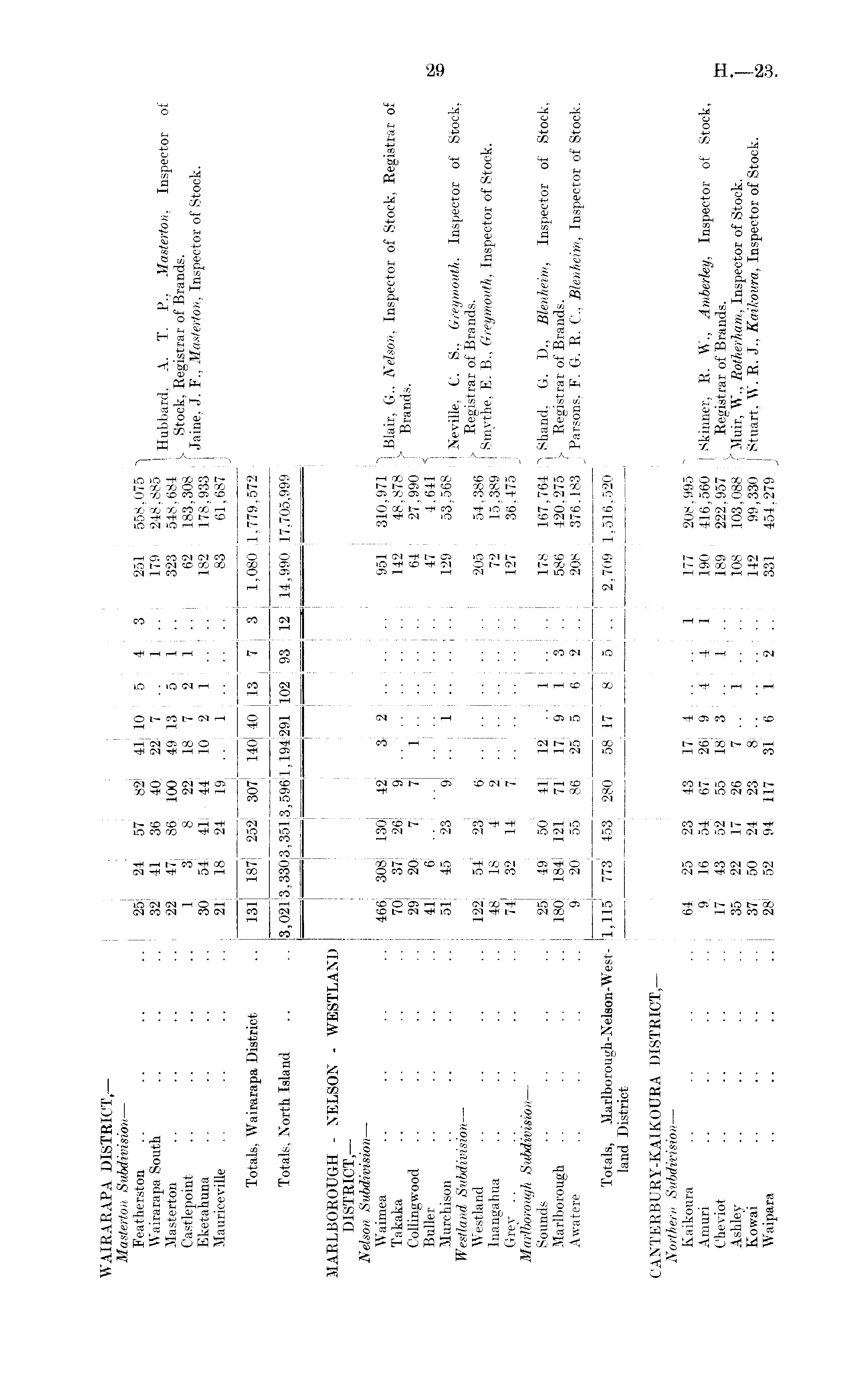 WAIRARAPA DISTRICT,— Masterton Subdivision — ■ Featherston .. .. .. .. 25 24; 57 82 41 10 5 4 3 251 558,075 h Wairarapa South .. .. .. 32 41 36 40 22 7 1 179 248,885 Hubbard \ T P Masterton InsDector of Masterton .. 22 47 86 100 49 13 5 1 .. 323 548,684 Hubbard A. I. P., Masterton, inspector ot Castlepoint .. .. .. .. 1 3 8 22 18 7 2 1 .. 62 183,308 Stoc k, Registrar of Brands. Eketahuna 30 54 41| 44 10 2 1 .. 182 178 Jame, J. F., Masterton, Inspector of Stock. Maurice ville .. .. .. .. 21 18 24 19 .. 1 83 61,687 j Totals, Wairarapa District .. 131 187 252 307 140 40 13 7 3 1,080 1,779,572 | Totals, North Island .. .. 3,0213,3303,3513,5961,194291 102 93 12 14,990 17,705,999 MARLBOROUGH - NELSON - WESTLAND DISTRICT,— Nelson Subdivision — Waimea .. .. .. .. 466 308 130 42 3 2 951 310,971 H w , T , t a . , . . f Takaka 70 37 26 9 142 48 >8 L B1 * lr ' G '> Ndson ' InR P ector of Stock ' Registrar of Collingwood .. .. .. .. 29 20 7 7 1 64 27,990 | ' a Buller .. ... .. .. 41 6 47 4,641 1 Murchison .. .. .. .. 51 45 23 9 1 129 j 53,568 I 1 -vr -n nan t 4- t i Westland Subdivision— Seville, C. S., Grey-mouth, Inspector of Stock, ft tyollU-flU' KJ tl/LnJuvU to HJIv -*-» • , n -p> -i Westland 122 54 23 6 205; 54,386 > Registrarof Brands. Inangahua 48 18 4 2 Smythe, E. B., Greymouth, Inspector of Stock. Grey .. .. .. .. .. 74 32 14; 7 127 36,475 Marlborough SubdivisionSounds .. .. .. .. 25 49 50j 41 12 .. 1 178 167,764 h Shand, G. D., Blenheim, Inspector of Stock, Marlborough .. .. .. .. 180 184 12l| 71 17 9 1 3 586 420,275 Registrar of Brands. Awatere .. .. .. .. 9 20 55; 86 25 5 6 2 208 j 376,183 j Parsons, F. G. R. C., Blenheim, Inspector of Stock. i | i I. | J Totals, Marlborough-Nelson-West- 1,115 773 453] 280 58 17 8 5 2,709 1,516,520 1 land District i . CANTERBURY-KAIKOURA DISTRICT,— Northern Subdivision — Kaikoura .. .. .. .. 64; 25! 23 43 17 4 j .. j .. | 1 177 208,995 Amuri .. .. .. .. 9 16| 54; 67 26 9 : 4 | 4 I 1 190 j 416,560 | Skinner, R. W., Amberley, Inspector of Stock, Cheviot .. .. .. .. 17 43; 52 ; 55 18 3 i .. I 1 .. 189 j 222,957 ( Registrar of Brands. Ashley .. .. .. .. 35 22 17 26 7 .. 1 108 103,088 fMuir, W., Rotherham, Inspector of Stock. Kowai .. .. .. .. 37 50! 24 23 8 .. j .. 142 99,330 | Stuart, W. R. J., Kaikoura, Inspector of Stock. Waipara .. .. .. .. 28 52 94! 117 31 6 1 2 .. 331 454,279 J
