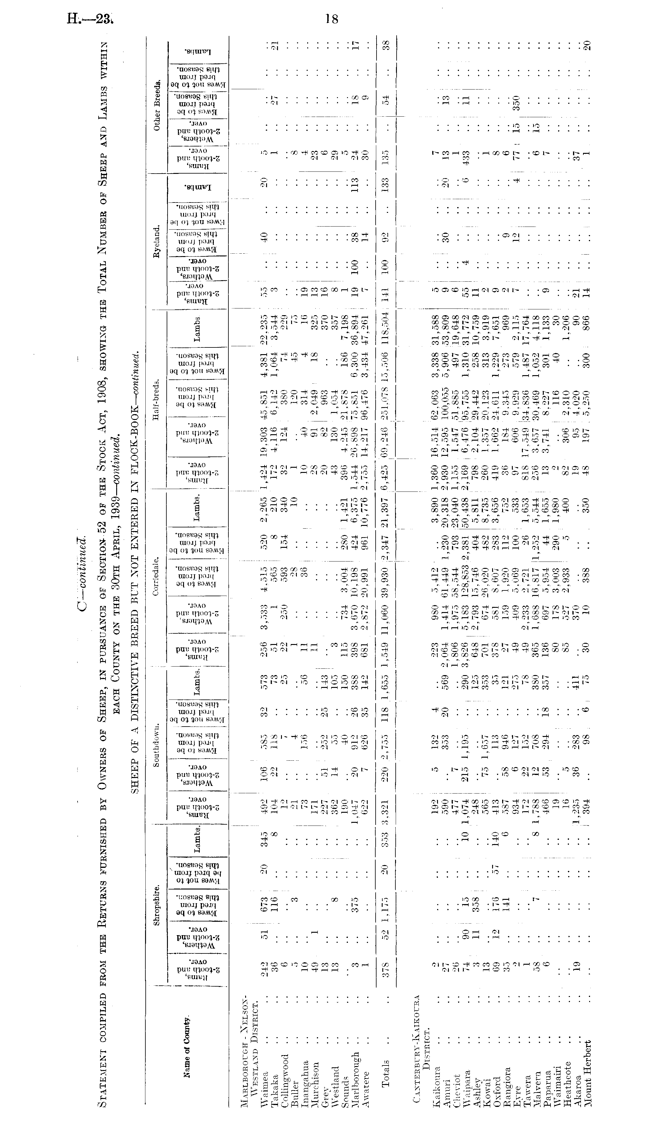 C—continued. Statement compiled from the Returns furnished by Owners of Sheep, in pursuance of Section 52 of the Stock Act, 1908, showing the Total Number of Sheep and Lambs within each County on the 30th April, 1939— continued. SHEEP OF A DISTINCTIVE BREED BUT NOT ENTERED IN FLOCK-BOOK— continued.