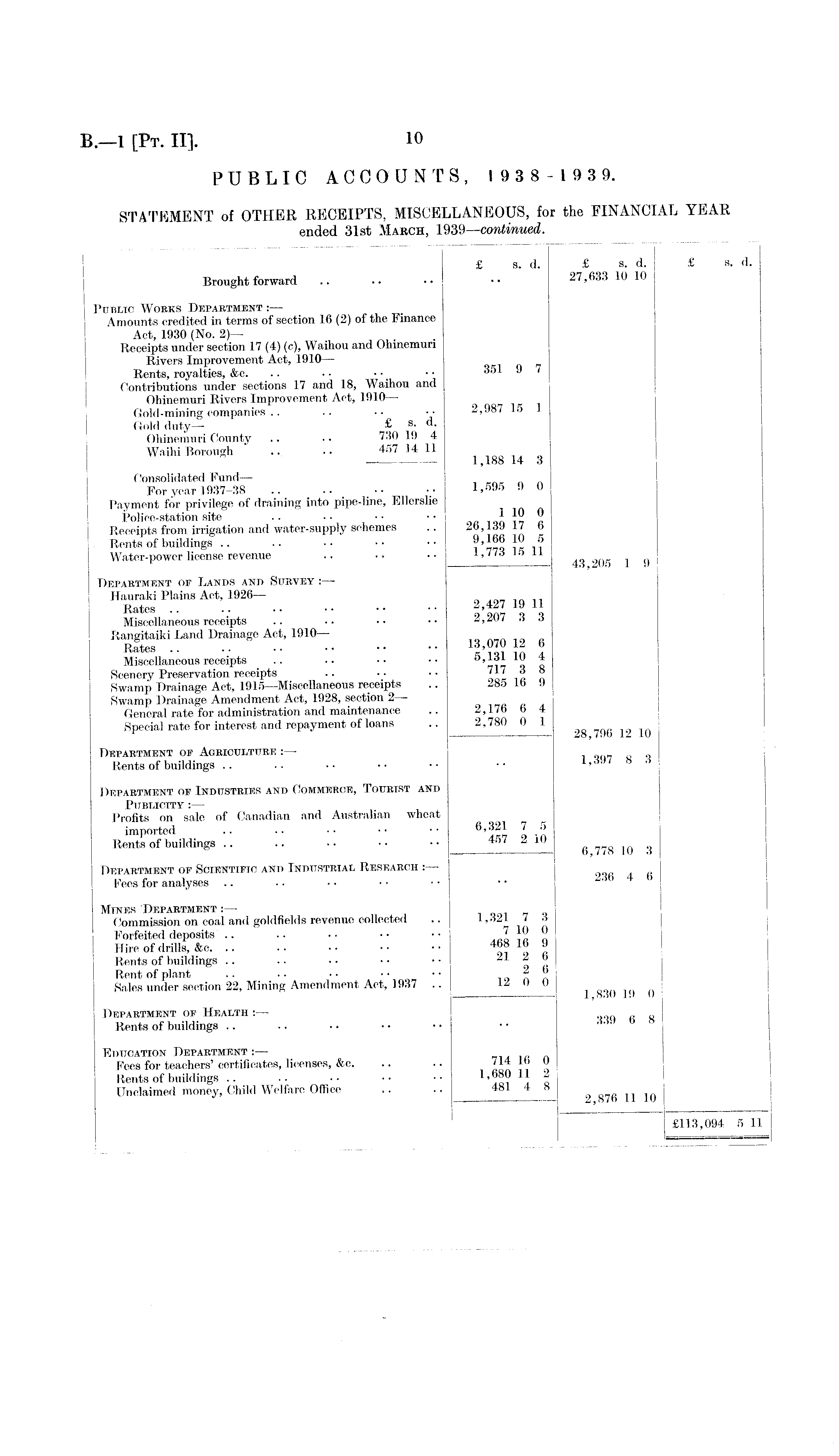 £ s. d. £ s. d. £ s. d. Brought forward •• 27,633 10 10 Public Wokks Department : — Amounts credited in terms of section 16 (2) of the Finance Act, 1930 (No. 2)— Receipts under section 17 (4) (c), Waihou and Ohinemuri Rivers Improvement Act, 1910 — Rents, royalties, &c. .. . • • • • • 351 9 7 Contributions under sections 17 and 18, Waihou and Ohinemuri Rivers Improvement Act, 1910 — Gold-mining companies .. .. ■■ •■ 2,987 16 1 Gold duty— £ s - d - Ohinemuri County .. .. 730 19 4 Waihi Borough .. .. 457 14 11 ___—_____-. i loo 14 o Consolidated Fund— For year 1937-38 .. .. •• •• 1,595 9 0 Payment for privilege of draining into pipe-line, Ellerslie Police-station site .. . • • ■ • • J |« *} Receipts from irrigation and water-supply schemes .. 2b, 139 17 b Rents of buildings , ®>lf \° 5 Water-power license revenue .. •■ •• i,ua io n . Department of Lands and Survey : — Hauraki Plains Act, 1926— Tinted .. ■• •• 2 » 427 19 U Kates .. .. ■• »'„, „ „ Miscellaneous receipts .. .. •• •• z,zu/ .> a Rangitaiki Land Drainage Act, 1910 — D,tp, .. .. .. la,070 12 b Miscellaneous receipts .. .. •• •• 7V7 Q s Scenery Preservation receipts .. •• •• 1 A t Swamp Drainage Act, 1915—Miscellaneous receipts .. 285 Ib W Swamp Drainage Amendment Act, 1928, section 2— General rate for administration and maintenance .. 2,176 b 4 Special rate for interest and repayment of loans .. 2,780 0 1 Department of Agriculture :— Rents of buildings •• 1,397 8 3 Department of Industries and Commerce, Tourist and Publicity : — Profits on sale of Canadian and Australian wheat imported .. .. ■■ •• •• 6 >321 7 5 Rents of buildings 457 2 i0 6 778 10 3 Department of Scientific and Industrial Research :— Fees for analyses .. .. ■ • • • • • ■ • Mines Department : — Commission on coal and goldfields revenue collected .. I,.121 7 I Forfeited deposits .. .. .. •• •• J 2 J Hire of drills, &e o? o e Rents of buildings .. .. •• •• •• or Rent of plant .. •• •• •• •• ionn Sales under section 22, Mining Amendment Act, 1937 .. 12 0 0 Department of Health : — Rents of buildings •■ '" 9 b * Education Department :— Fees for teachers' certificates, licenses, &e. .. .. 714 It) U Rents of buildings 'it? 1 a Unclaimed money, Child Welfare Office .. .. *»1 4 8 2 876 1110 £113,094 5 11