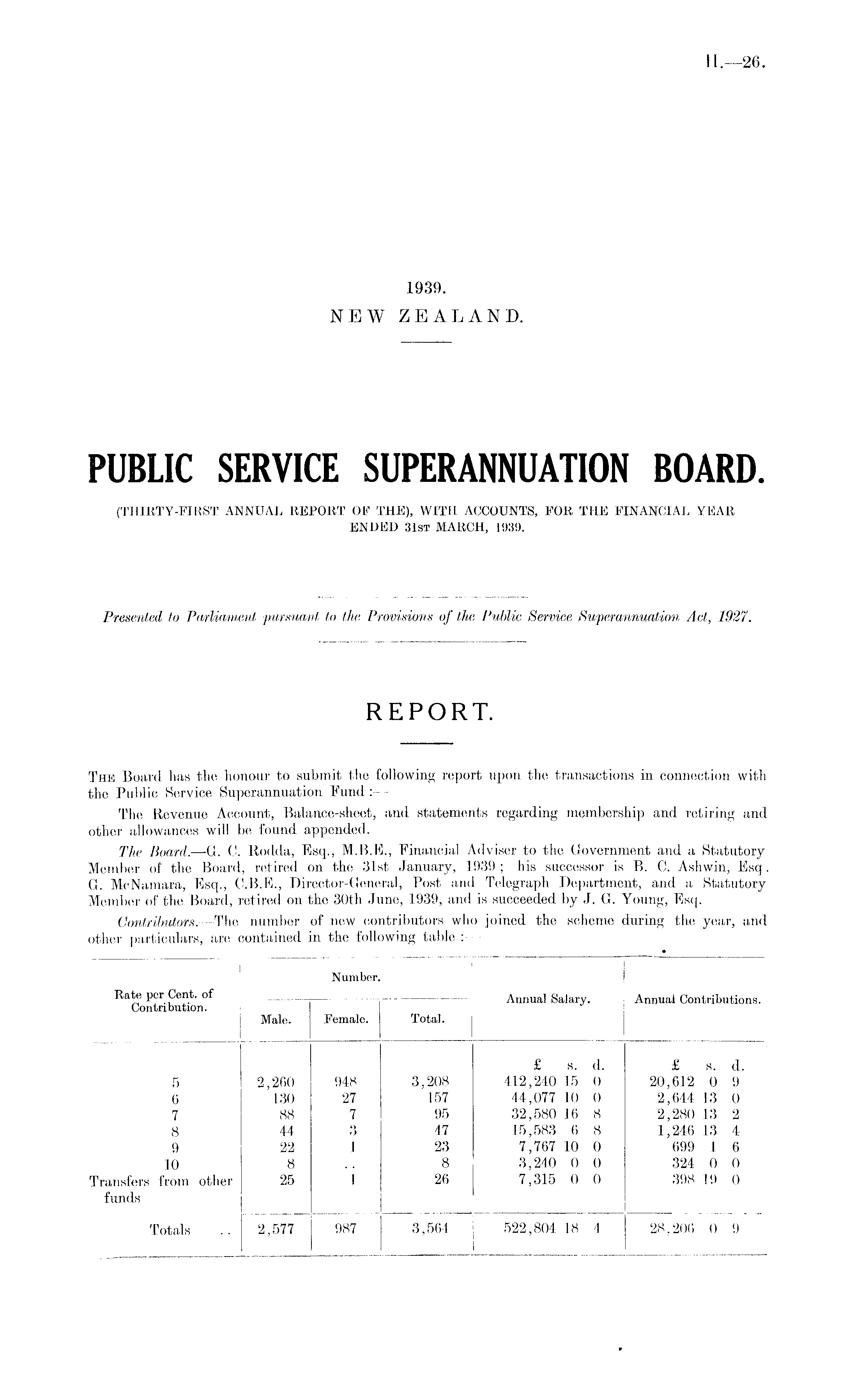 The Board has the honour to submit the following report upon the transactions in connection with the Public Service Superannuation Fund : — The Revenue Account, Balance-sheet, and statements regarding membership and retiring and other allowances will be found appended. The Board. —G. C. Rodda, Esq., M.8.8., Financial Adviser to the Government and a Statutory Member of the Board, retired on the 31st January, 1939 ; his successor is B. C. Ashwin, Esq. G. McNamara, Esq., C.8.E., Director-General, Post and Telegraph Department, and a Statutory Member of the Board, retired on the 30th June, 1939, and is succeeded by J. G. Young, Esq. Contributors. —The number of new contributors who joined the scheme during the year, and other particulars, are contained in the following table : —