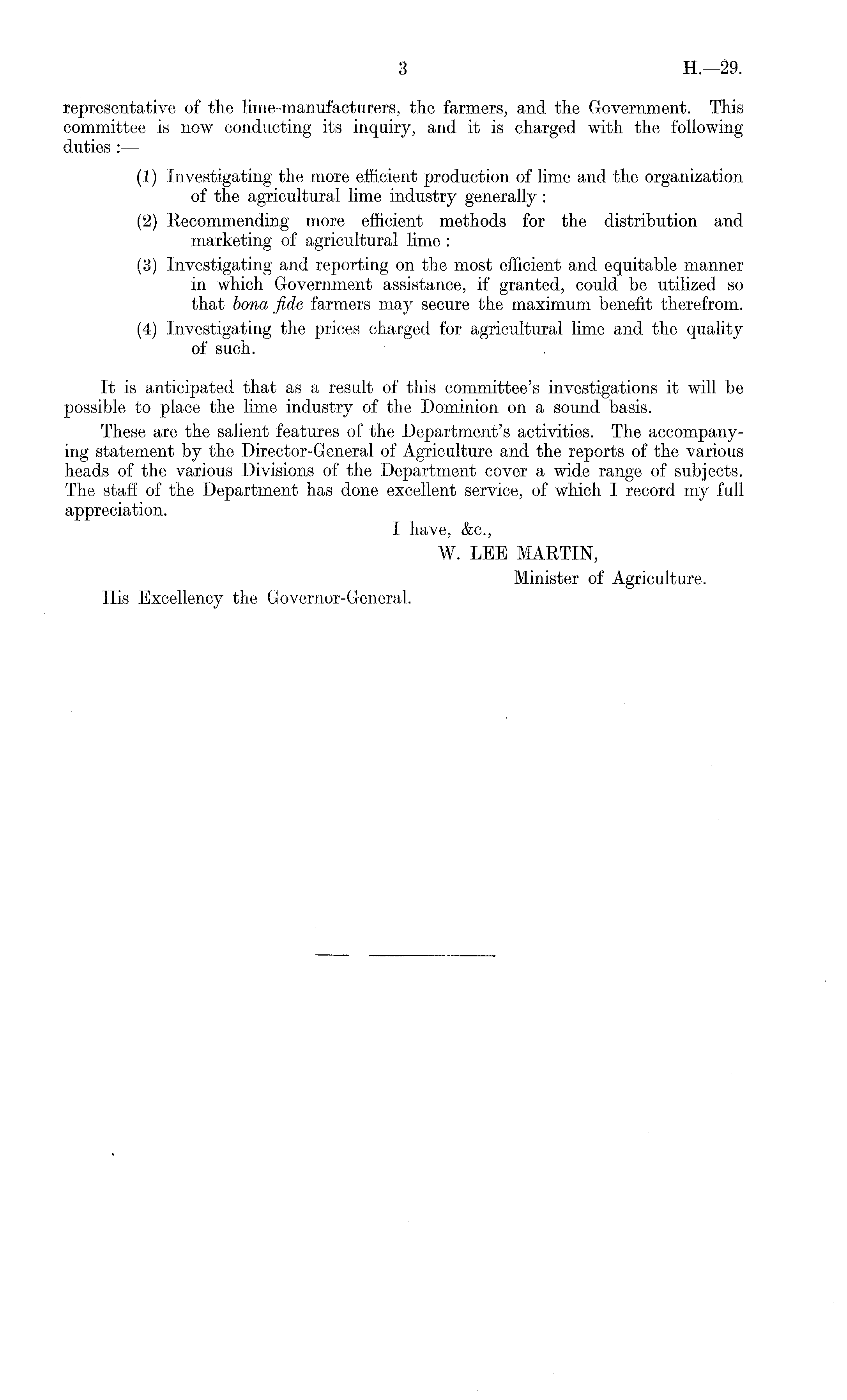 representative of the lime-manufacturers, the farmers, and the Government. This committee is now conducting its inquiry, and it is charged with the following duties : — (1) Investigating the more efficient production of lime and the organization of the agricultural lime industry generally: (2) Recommending more efficient methods for the distribution and marketing of agricultural lime : (3) Investigating and reporting on the most efficient and equitable manner in which Government assistance, if granted, could be utilized so that bona fide farmers may secure the maximum benefit therefrom. (4) Investigating the prices charged for agricultural lime and the quality of such. It is anticipated that as a result of this committee's investigations it will be possible to place the lime industry of the Dominion on a sound basis. These are the salient features of the Department's activities. The accompanying statement by the Director-General of Agriculture and the reports of the varioiis heads of the various Divisions of the Department cover a wide range of subjects. The staff of the Department has done excellent service, of which I record my full appreciation. I have, &c., W. LEE MARTIN, Minister of Agriculture. His Excellency the Governor-General.