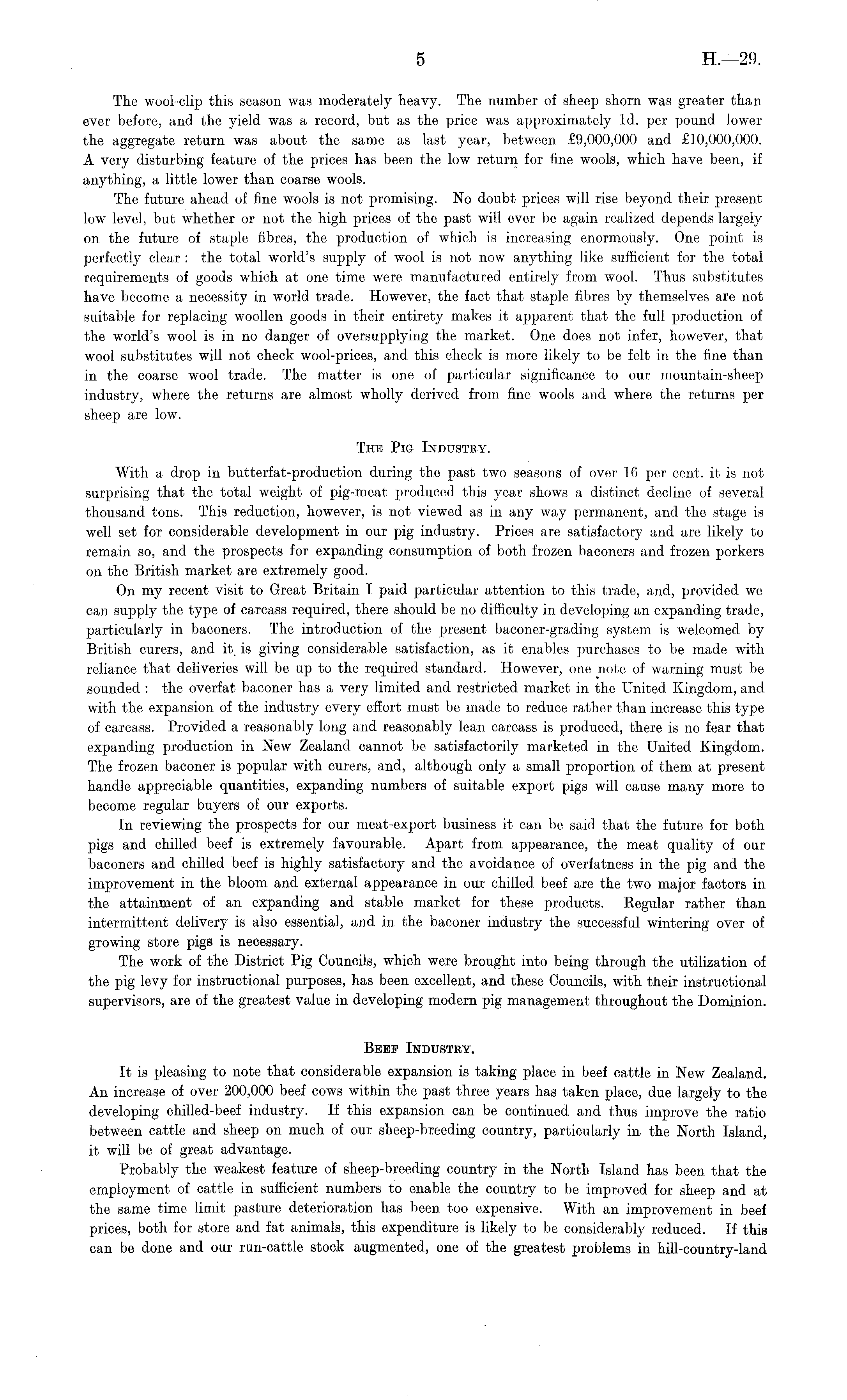 The wool-clip this season was moderately heavy. The number of sheep shorn was greater than ever before, and the yield was a record, but as the price was approximately Id. per pound lower the aggregate return was about the same as last year, between £9,000,000 and £10,000,000. A very disturbing feature of the prices has been the low return for fine wools, which have been, if anything, a little lower than coarse wools. The future ahead of fine wools is not promising. No doubt prices will rise beyond their present low level, but whether or not the high prices of the past will ever be again realized depends largely on the future of staple fibres, the production of which is increasing enormously. One point is perfectly clear : the total world's supply of wool is not now anything like sufficient for the total requirements of goods which at one time were manufactured entirely from wool. Thus substitutes have become a necessity in world trade. However, the fact that staple fibres by themselves are not suitable for replacing woollen goods in their entirety makes it apparent that the full production of the world's wool is in no danger of oversupplying the market. One does not infer, however, that wool substitutes will not check wool-prices, and this check is more likely to be felt in the fine than in the coarse wool trade. The matter is one of particular significance to our mountain-sheep industry, where the returns are almost wholly derived from fine wools and where the returns per sheep are low. The Pig Industry. With, a drop in butterfat-production. during the past two seasons of over 16 per cent, it is not surprising that the total weight of pig-meat produced this year shows a distinct decline of several thousand tons. This reduction, however, is not viewed as in any way permanent, and the stage is well set for considerable development in our pig industry. Prices are satisfactory and are likely to remain so, and the prospects for expanding consumption of both frozen baconers and frozen porkers on the British market are extremely good. On my recent visit to Great Britain I paid particular attention to this trade, and, provided we can supply the type of carcass required, there should be no difficulty in developing an expanding trade, particularly in baconers. The introduction of the present baconer-grading system is welcomed by British curers, and it. is giving considerable satisfaction, as it enables purchases to be made with reliance that deliveries will be up to the required standard. However, one note of warning must be sounded : the overfat baconer has a very limited and restricted market in the United Kingdom, and with the expansion of the industry every effort must be made to reduce rather than increase this type of carcass. Provided a reasonably long and reasonably lean carcass is produced, there is no fear that expanding production in New Zealand cannot be satisfactorily marketed in the United Kingdom. The frozen baconer is popular with curers, and, although only a small proportion of them at present handle appreciable quantities, expanding numbers of suitable export pigs will cause many more to become regular buyers of our exports. In reviewing the prospects for our meat-export business it can be said that the future for both pigs and chilled beef is extremely favourable. Apart from appearance, the meat quality of our baconers and chilled beef is highly satisfactory and the avoidance of overfatness in the pig and the improvement in the bloom and external appearance in our chilled beef are the two major factors in the attainment of an expanding and stable market for these products. Regular rather than intermittent delivery is also essential, and in the baconer industry the successful wintering over of growing store pigs is necessary. The work of the District Pig Councils, which were brought into being through the utilization of the pig levy for instructional purposes, has been excellent, and these Councils, with their instructional supervisors, are of the greatest value in developing modern pig management throughout the Dominion. Beep Industey. It is pleasing to note that considerable expansion is taking place in beef cattle in New Zealand. An increase of over 200,000 beef cows within the past three years has taken place, due largely to the developing chilled-beef industry. If this expansion can be continued and thus improve the ratio between cattle and sheep on much of our sheep-breeding country, particularly in the North Island, it will be of great advantage. Probably the weakest feature of sheep-breeding country in the North Island has been that the employment of cattle in sufficient numbers to enable the country to be improved for sheep and at the same time limit pasture deterioration has been too expensive. With an improvement in beef prices, both for store and fat animals, this expenditure is likely to be considerably reduced. If this can be done and our run-cattle stock augmented, one of the greatest problems in hill-country-land