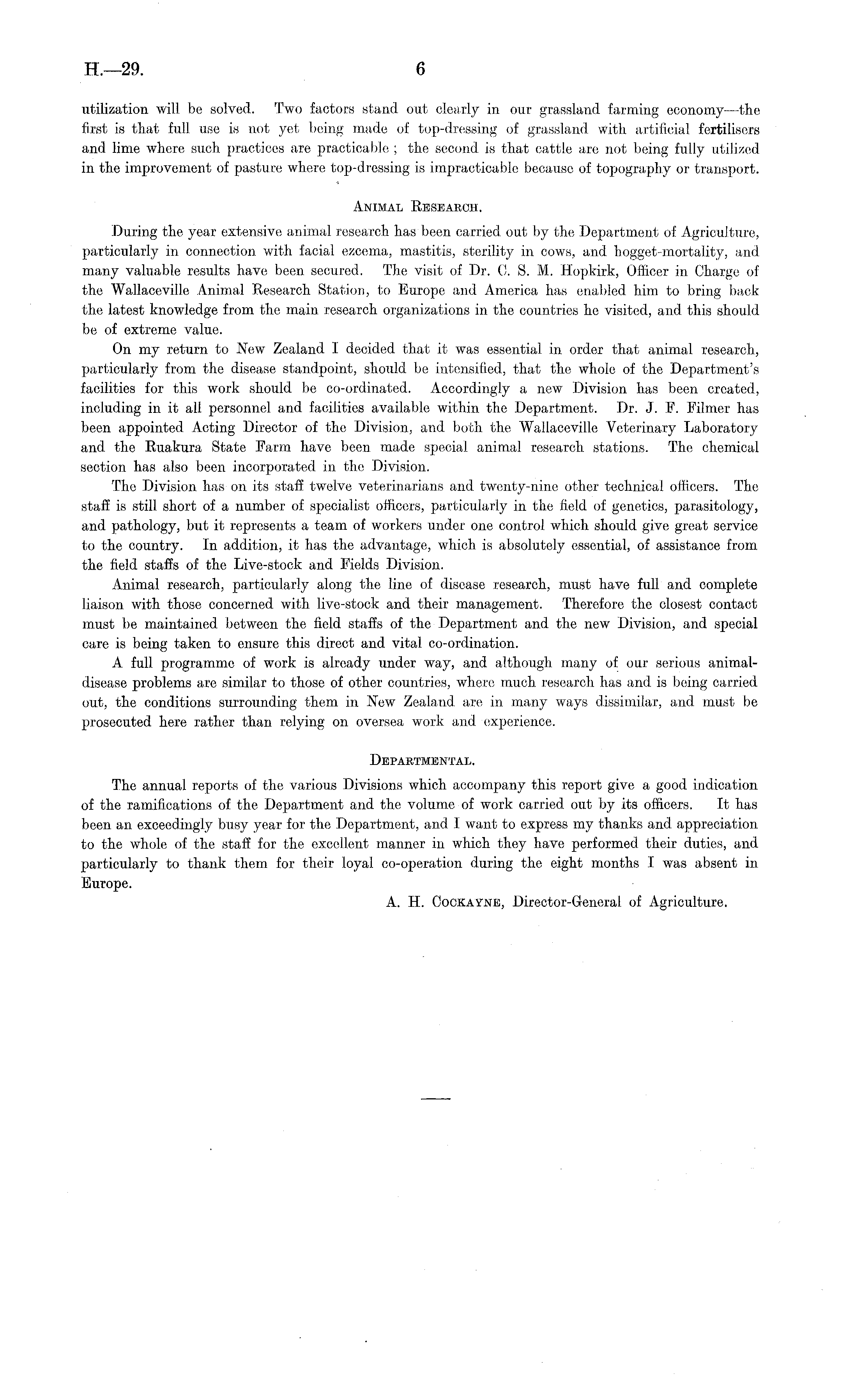 utilization will be solved. Two factors stand out clearly in our grassland farming economy —the first is that full use is not yet being made of top-dressing of grassland with artificial fertilisers and lime where such practices are practicable ; the second is that cattle are not being fully utilized in the improvement of pasture where top-dressing is impracticable because of topography or transport. Animal Research. During the year extensive animal research has been carried out by the Department of Agriculture, particularly in connection with facial ezcema, mastitis, sterility in cows, and bogget-mortality, and many valuable results have been secured. The visit of Dr. 0. S. M. Hopkirk, Officer in Charge of the Wallaceville Animal Research Station, to Europe and America has enabled him to bring back the latest knowledge from the main research organizations in the countries he visited, and this should be of extreme value. On my return to New Zealand I decided that it was essential in order that animal research, particularly from the disease standpoint, should be intensified, that the whole of the Department's facilities for this work should be co-ordinated. Accordingly a new Division has been created, including in it all personnel and facilities available within the Department. Dr. J. F. Filmer has been appointed Acting Director of the Division, and both the Wallaceville Veterinary Laboratory and the Ruakura State Farm have been made special animal research stations. The chemical section has also been incorporated in the Division. The Division has on its staff twelve veterinarians and twenty-nine other technical officers. The staff is still short of a number of specialist officers, particularly in the field of genetics, parasitology, and pathology, but it represents a team of workers under one control which should give great service to the country. In addition, it has the advantage, which is absolutely essential, of assistance from the field staffs of the Live-stock and Fields Division. Animal research, particularly along the line of disease research, must have full and complete liaison with those concerned with live-stock and their management. Therefore the closest contact must be maintained between the field staffs of the Department and the new Division, and special care is being taken to ensure this direct and vital co-ordination. A full programme of work is already under way, and although many of our serious animaldisease problems are similar to those of other countries, where much research has and is being carried out, the conditions surrounding them in New Zealand are in many ways dissimilar, and must be prosecuted here rather than relying on oversea work and experience. Departmental. The annual reports of the various Divisions which accompany this report give a good indication of the ramifications of the Department and the volume of work carried out by its officers. It has been, an exceedingly busy year for the Department, and I want to express my thanks and appreciation to the whole of the staff for the excellent manner in which they have performed their duties, and particularly to thank them for their loyal co-operation during the eight months I was absent in Europe. A. H. Cockayne, Director-General of Agriculture.