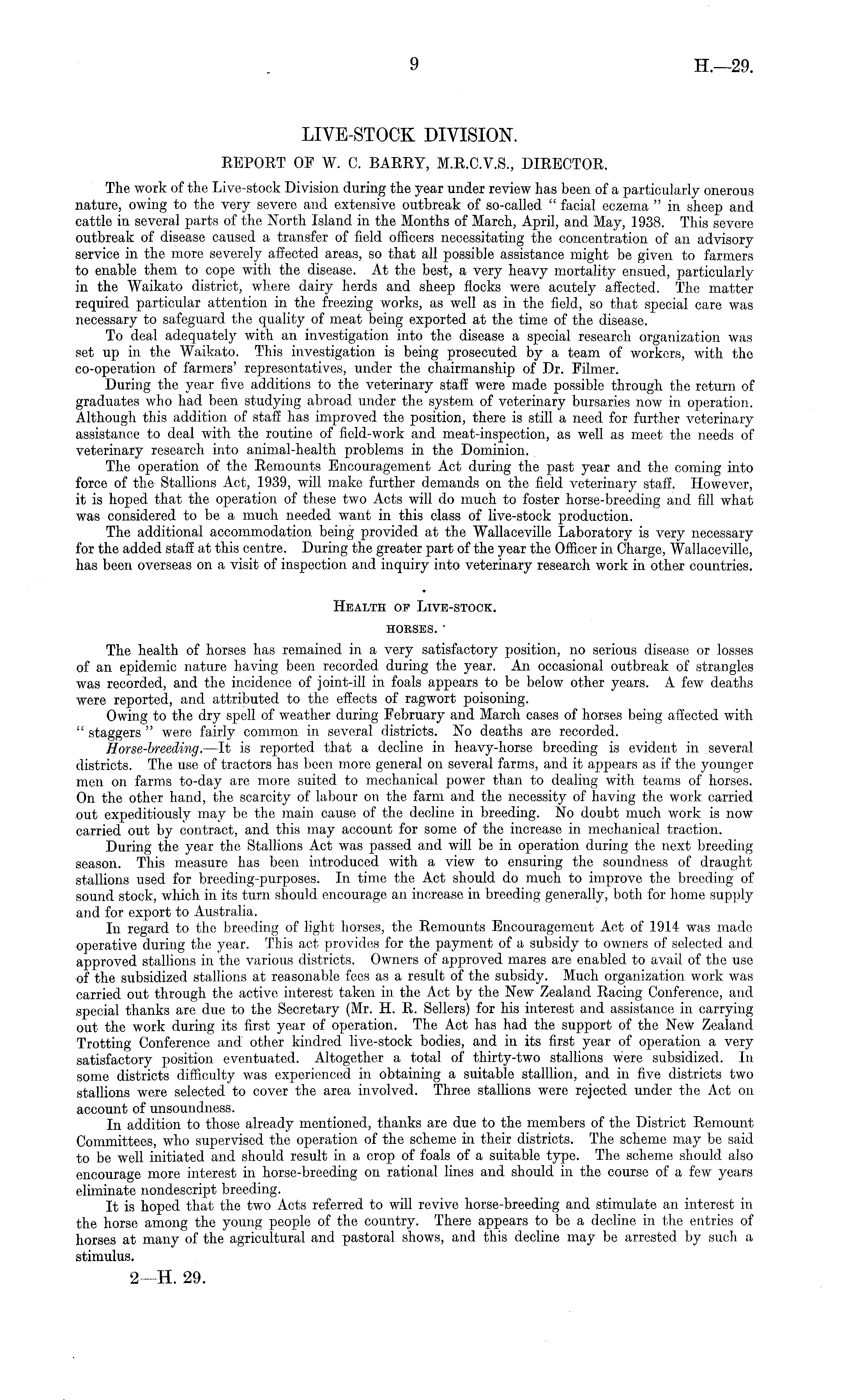 LIVE-STOCK DIVISION. REPORT OF W. C. BARRY, M.R.C.V.S., DIRECTOR. The work of the Live-stock Division during the year under review has been of a particularly onerous nature, owing to the very severe and extensive outbreak of so-called " facial eczema " in sheep and cattle in several parts of the North Island in the Months of March, April, and May, 1938. This severe outbreak of disease caused a transfer of field officers necessitating the concentration of an advisory service in the more severely affected areas, so that all possible assistance might be given to farmers to enable them to cope with the disease. At the best, a very heavy mortality ensued, particularly in the Waikato district, where dairy herds and sheep flocks were acutely affected. The matter required particular attention in the freezing works, as well as in the field, so that special care was necessary to safeguard the quality of meat being exported at the time of the disease. To deal adequately with an investigation into the disease a special research organization was set up in the Waikato. This investigation is being prosecuted by a team of workers, with the co-operation of farmers' representatives, under the chairmanship of Dr. Filmer. During the year five additions to the veterinary staff were made possible through the return of graduates who had been studying abroad under the system of veterinary bursaries now in operation. Although this addition of staff has improved the position, there is still a need for further veterinary assistance to deal with the routine of field-work and meat-inspection, as well as meet the needs of veterinary research into animal-health problems in the Dominion. The operation of the Remounts Encouragement Act during the past year and the coming into force of the- Stallions Act, 1939, will make further demands on the field veterinary staff. However, it is hoped that the operation of these two Acts will do much to foster horse-breeding and fill what was considered to be a much needed want in this class of live-stock production. The additional accommodation being provided at the Wallaceville Laboratory is very necessary for the added staff at this centre. During the greater part of the year the Officer in Charge, Wallaceville, has been overseas on a visit of inspection and inquiry into veterinary research work in other countries. Health of Live-stock. HORSES. ' The health of horses has remained in a very satisfactory position, no serious disease or losses of an epidemic nature having been recorded during the year. An occasional outbreak of strangles was recorded, and the incidence of joint-ill in foals appears to be below other years. A few deaths were reported, and attributed to the effects of ragwort poisoning. Owing to the dry spell of weather during February and March cases of horses being affected with " staggers " were fairly common in several districts. No deaths are recorded. Horse-breeding.—lt is reported that a decline in heavy-horse breeding is evident in several districts. The use of tractors has been more general on several farms, and it appears as if the younger men on farms to-day are more suited to mechanical power than to dealing with teams of horses. On the other hand, the scarcity of labour on the farm and the necessity of having the work carried out expeditiously may be the main cause of the decline in breeding. No doubt much work is now carried out by contract, and this may account for some of the increase in mechanical traction. During the year the Stallions Act was passed and will be in operation during the next breeding season. This measure has been introduced with a view to ensuring the soundness of draught stallions used for breeding-purposes. In time the Act should do much to improve the breeding of sound stock, which in its turn should encourage an increase in breeding generally, both for home supply and for export to Australia. In regard to the breeding of light horses, the Remounts Encouragement Act of 1914 was made operative during the year. This act provides for the payment of a subsidy to owners of selected and approved stallions in the various districts. Owners of approved mares are enabled to avail of the use of the subsidized stallions at reasonable fees as a result of the subsidy. Much organization work was carried out through the active interest taken in the Act by the New Zealand Racing Conference, and special thanks are due to the Secretary (Mr. H. R. Sellers) for his interest and assistance in carrying out the work during its first year of operation. The Act has had the support of the New Zealand Trotting Conference and other kindred live-stock bodies, and in its first year of operation a very satisfactory position eventuated. Altogether a total of thirty-two stallions were subsidized. In some districts difficulty was experienced in obtaining a suitable stalllion, and in five districts two stallions were selected to cover the area involved. Three stallions were rejected under the Act on account of unsoundness. In addition to those already mentioned, thanks are due to the members of the District Remount Committees, who supervised the operation of the scheme in their districts. The scheme may be said to be well initiated and should result in a crop of foals of a suitable type. The scheme should also encourage more interest in horse-breeding on rational lines and should in the course of a few years eliminate nondescript breeding. It is hoped that the two Acts referred to will revive horse-breeding and stimulate an interest in the horse among the young people of the country. There appears to be a decline in the entries of horses at many of the agricultural and pastoral shows, and this decline may be arrested by such a stimulus.