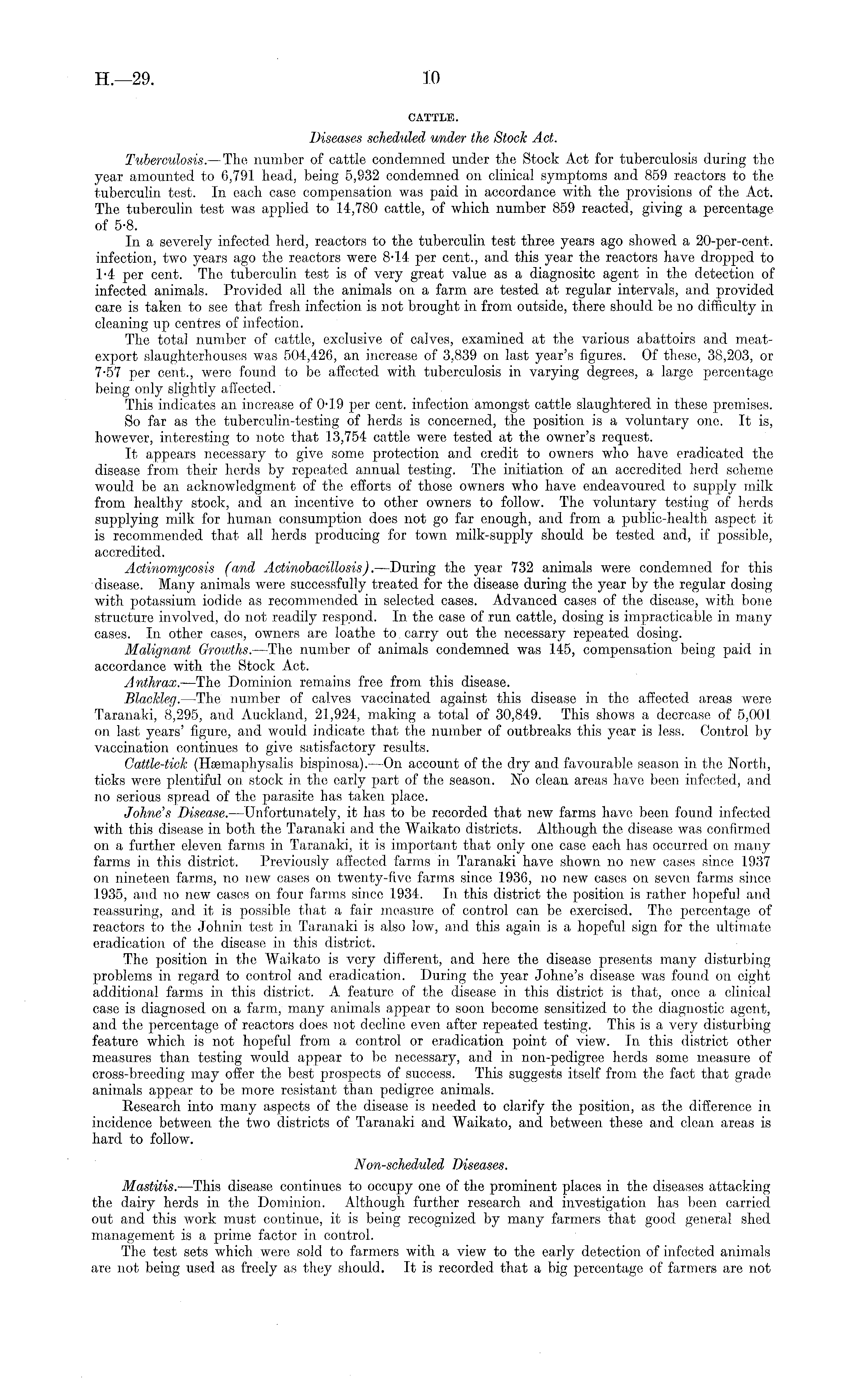 CATTLE. Diseases scheduled under the Stock Act. Tuberculosis. — The number of cattle condemned under the Stock Act for tuberculosis during the year amounted to 6,791 head, being 5,932 condemned on clinical symptoms and 859 reactors to the tuberculin test. In each case compensation was paid in accordance with the provisions of the Act. The tuberculin test was applied to 14,780 cattle, of which number 859 reacted, giving a percentage of 5-8. In a severely infected herd, reactors to the tuberculin test three years ago showed a 20-per-cent. infection, two years ago the reactors were 8-14 per cent., and this year the reactors have dropped to 1-4 per cent. The tuberculin test is of very great value as a diagnositc agent in the detection of infected animals. Provided all the animals on a farm are tested at regular intervals, and provided care is taken to see that fresh infection is not brought in from outside, there should be no difficulty in cleaning up centres of infection. The total number of cattle, exclusive of calves, examined at the various abattoirs and meatexport slaughterhouses was 504,426, an increase of 3,839 on last year's figures. Of these, 38,203, or 7-57 per cent., were found to be affected with tuberculosis in varying degrees, a large percentage being only slightly affected. This indicates an increase of 0-19 per cent, infection amongst cattle slaughtered in these premises. So far as the tuberculin-testing of herds is concerned, the position is a voluntary one. It is, however, interesting to note that 13,754 cattle were tested at the owner's request. It appears necessary to give some protection and credit to owners who have eradicated the disease from their herds by repeated annual testing. The initiation of an accredited herd scheme would be an acknowledgment of the efforts of those owners who have endeavoured to supply milk from healthy stock, and an incentive to other owners to follow. The voluntary testing of herds supplying milk for human consumption does not go far enough, and from a public-health aspect it is recommended that all herds producing for town milk-supply should be tested and, if possible, accredited. Actinomycosis (and Actinobacillosis). —During the year 732 animals were condemned for this disease. Many animals were successfully treated for the disease during the year by the regular dosing with potassium iodide as recommended in selected cases. Advanced cases of the disease, with bone structure involved, do not readily respond. In the case of run cattle, dosing is impracticable in many cases. In other cases, owners are loathe to carry out the necessary repeated dosing. Malignant Growths. —The number of animals condemned was 145, compensation being paid in accordance with the Stock Act. Anthrax. —The Dominion remains free from this disease. Blackleg.—The number of calves vaccinated against this disease in the affected areas were Taranaki, 8,295, and Auckland, 21,924, making a total of 30,849. This shows a decrease of 5,001 on last years' figure, and would indicate that the number of outbreaks this year is less. Control by vaccination continues to give satisfactory results. Cattle-ticlc (Hsemaphysalis bispinosa). —On account of the dry and favourable season in the North, ticks were plentiful on stock in the early part of the season. No clean areas have been infected, and no serious spread of the parasite has taken place. Johne's Disease. —Unfortunately, it has to be recorded that new farms have been found infected with this disease in both the Taranaki and the Waikato districts. Although the disease was confirmed on a further eleven farms in Taranaki, it is important that only one case each has occurred on many farms in this district. Previously affected farms in Taranaki have shown no new cases since 1937 on nineteen farms, no new cases on twenty-five farms since 1936, no new cases on seven farms since 1935, and no new cases on four farms since 1934. In this district the position is rather hopeful and reassuring, and it is possible that a fair measure of control can be exercised. The percentage of reactors to the Johnin test in Taranaki is also low, and this again is a hopeful sign for the ultimate eradication of the disease in this district. The position in the Waikato is very different, and here the disease presents many disturbing problems in regard to control and eradication. During the year Johne's disease was found on eight additional farms in this district. A feature of the disease in this district is that, once a clinical case is diagnosed on a farm, many animals appear to soon become sensitized to the diagnostic agent, and the percentage of reactors does not decline even after repeated testing. This is a very disturbing feature which is not hopeful from a control or eradication point of view. In this district other measures than testing would appear to be necessary, and in non-pedigree herds some measure of cross-breeding may offer the best prospects of success. This suggests itself from the fact that grade animals appear to be more resistant than pedigree animals. Research into many aspects of the disease is needed to clarify the position, as the difference in incidence between the two districts of Taranaki and Waikato, and between these and clean areas is hard to follow. Non-scheduled Diseases. Mastitis. —This disease continues to occupy one of the prominent places in the diseases attacking the dairy herds in the Dominion. Although further research and investigation has been carried out and this work must continue, it is being recognized by many farmers that good general shed management is a prime factor in control. The test sets which were sold to farmers with a view to the early detection of infected animals are not being used as freely as they should. It is recorded that a big percentage of farmers are not