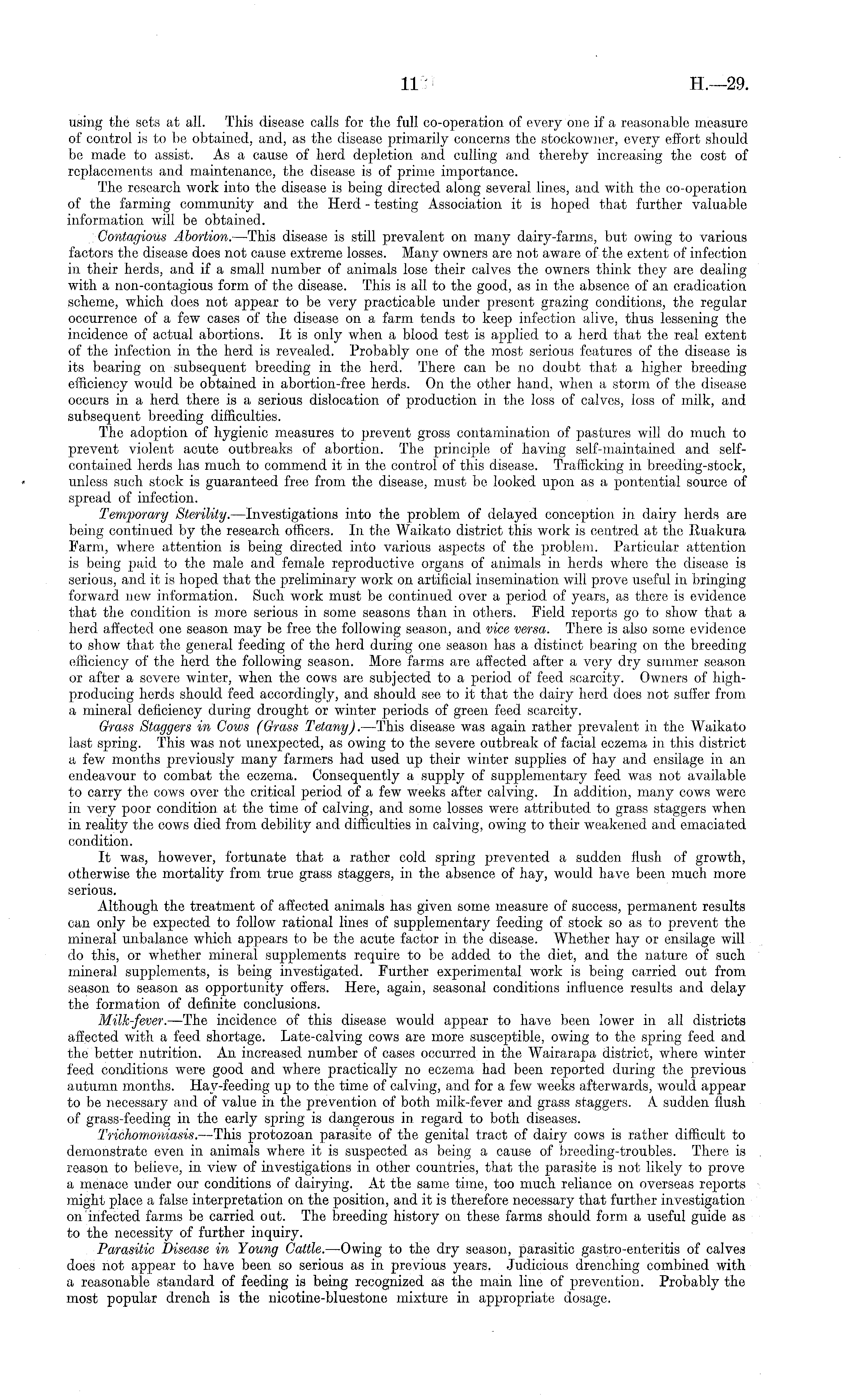 using the sets at all. This disease calls for the full co-operation of every one if a reasonable measure of control is to be obtained, and, as the disease primarily concerns the stockowner, every effort should be made to assist. As a cause of herd depletion and culling and thereby increasing the cost of replacements and maintenance, the disease is of prime importance. The research work into the disease is being directed along several lines, and with the co-operation of the farming community and the Herd - testing Association it is hoped that further valuable information will be obtained. Contagious Abortion.—This disease is still prevalent on many dairy-farms, but owing to various factors the disease does not cause extreme losses. Many owners are not aware of the extent of infection in their herds, and if a small number of animals lose their calves the owners think they are dealing with a non-contagious form of the disease. This is all to the good, as in the absence of an eradication scheme, which does not appear to be very practicable under present grazing conditions, the regular occurrence of a few cases of the disease on a farm tends to keep infection alive, thus lessening the incidence of actual abortions. It is only when a blood test is applied to a herd that the real extent of the infection in the herd is revealed. Probably one of the most serious features of the disease is its bearing on subsequent breeding in the herd. There can be no doubt that a higher breeding efficiency would be obtained in abortion-free herds. On the other hand, when a storm of the disease occurs in a herd there is a serious dislocation of production in the loss of calves, loss of milk, and subsequent breeding difficulties. The adoption of hygienic measures to prevent gross contamination of pastures will do much to prevent violent acute outbreaks of abortion. The principle of having self-maintained and selfcontained herds has much to commend it in the control of this disease. Trafficking in breeding-stock, unless such stock is guaranteed free from the disease, must be looked upon as a pontential source of spread of infection. Temporary Sterility.—lnvestigations into the problem of delayed conception in dairy herds are being continued by the research officers. In the Waikato district this work is centred at the Ruakura Farm, where attention is being directed into various aspects of the problem. Particular attention is being paid to the male and female reproductive organs of animals in herds where the disease is serious, and it is hoped that the preliminary work on artificial insemination will prove useful in bringing forward new information. Such work must be continued over a period of years, as there is evidence that the condition is more serious in some seasons than in others. Field reports go to show that a herd affected one season may be free the following season, and vice versa. There is also some evidence to show that the general feeding of the herd during one season has a distinct bearing on the breeding efficiency of the herd the following season. More farms are affected after a very dry summer season or after a severe winter, when the cows are subjected to a period of feed scarcity. Owners of highproducing herds should feed accordingly, and should see to it that the dairy herd does not suffer from a mineral deficiency during drought or winter periods of green feed scarcity. Grass Staggers in Cows (Grass Tetany).—This disease was again rather prevalent in the Waikato last spring. This was not unexpected, as owing to the severe outbreak of facial eczema in this district a few months previously many farmers had used up their winter supplies of hay and ensilage in an endeavour to combat the eczema. Consequently a supply of supplementary feed was not available to carry the cows over the critical period of a few weeks after calving. In addition, many cows were in very poor condition at the time of calving, and some losses were attributed to grass staggers when in reality the cows died from debility and difficulties in calving, owing to their weakened and emaciated condition. It was, however, fortunate that a rather cold spring prevented a sudden flush of growth, otherwise the mortality from true grass staggers, in the absence of hay, would have been much more serious. Although the treatment of affected animals has given some measure of success, permanent results can only be expected to follow rational lines of supplementary feeding of stock so as to prevent the mineral unbalance which appears to be the acute factor in. the disease. Whether hay or ensilage will do this, or whether mineral supplements require to be added to the diet, and the nature of such mineral supplements, is being investigated. Further experimental work is being carried out from season to season as opportunity offers. Here, again, seasonal conditions influence results and delay the formation of definite conclusions. Milk-fever. —The incidence of this disease would apjjear to have been lower in all districts affected with a feed shortage. Late-calving cows are more susceptible, owing to the spring feed and the better nutrition. An increased number of cases occurred in the Wairarapa district, where winter feed conditions were good and where practically no eczema had been reported during the previous autumn months. Hav-feeding up to the time of calving, and for a few weeks afterwards, would appear to be necessary and of value in the prevention of both milk-fever and grass staggers. A sudden flush of grass-feeding in the early spring is dangerous in regard to both diseases. Trichomoniasis. —This protozoan parasite of the genital tract of dairy cows is rather difficult to demonstrate even in animals where it is suspected as being a cause of breeding-troubles. There is reason to believe, in view of investigations in other countries, that the parasite is not likely to prove a menace under our conditions of dairying. At the same time,
