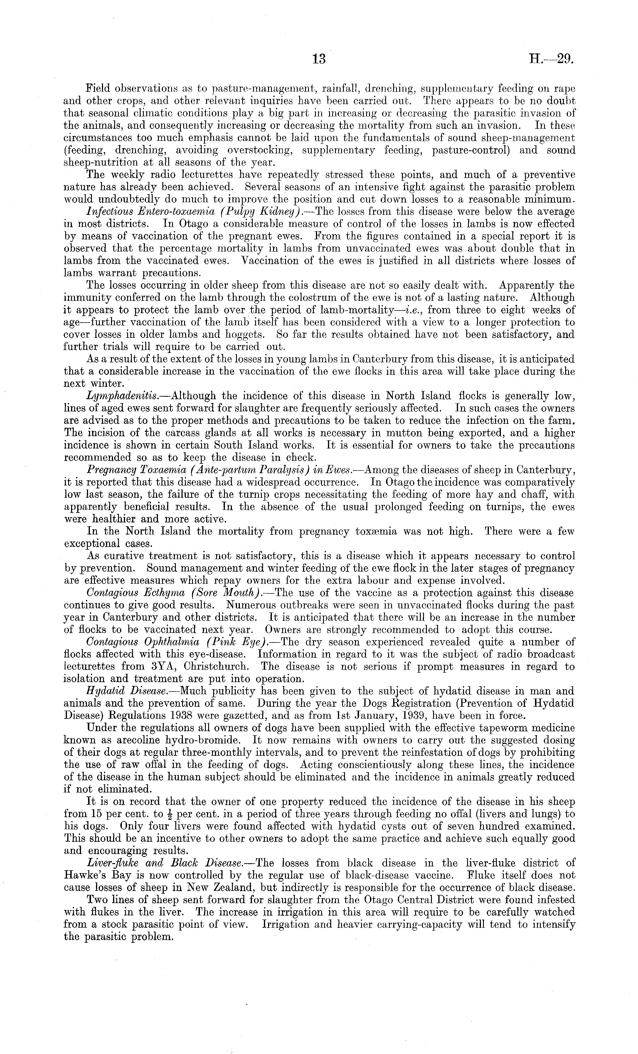 Field observations as to pasture-management, rainfall, drenching, supplementary feeding on rape and other crops, and other relevant inquiries have been carried out. There appears to be no doubt that seasonal climatic conditions play a big part in increasing or decreasing the parasitic invasion of the animals, and consequently increasing or decreasing the mortality from such an invasion. In these circumstances too much emphasis cannot be laid upon the fundamentals of sound sheep-management (feeding, drenching, avoiding overstocking, supplementary feeding, pasture-control) and sound sheep-nutrition at all seasons of the year. The weekly radio lecturettes have repeatedly stressed these points, and much of a preventive nature has already been achieved. Several seasons of an intensive fight against the parasitic problem would undoubtedly do much to improve the position and cut down losses to a reasonable minimum. Infectious Entero-toxaemia (Pulpy Kidney).- The losses from this disease were below the average in most districts. In Otago a considerable measure of control of the losses in lambs is now effected by means of vaccination of the pregnant ewes. From the figures contained in a special report it is observed that the percentage mortality in lambs from unvaccinated ewes was about double that in lambs from the vaccinated ewes. Vaccination of the ewes is justified in all districts where losses of lambs warrant precautions. The losses occurring in older sheep from this disease are not so easily dealt with. Apparently the immunity conferred on the lamb through the colostrum of the ewe is not of a lasting nature. Although it appears to protect the lamb over the period of lamb-mortality—i.e., from three to eight weeks of age —further vaccination of the lamb itself has been considered with a view to a longer protection to cover losses in older lambs and hoggets. So far the results obtained have not been satisfactory, and further trials will require to be carried out. As a result of the extent of the losses in young lambs in Canterbury from this disease, it is anticipated that a considerable increase in the vaccination of the ewe flocks in this area will take place during the next winter. Lymphadenitis.—Although the incidence of this disease in North Island flocks is generally low, lines of aged ewes sent forward for slaughter are frequently seriously affected . In such cases the owners are advised as to the proper methods and precautions to be taken to reduce the infection on the farm. The incision of the carcass glands at all works is necessary in mutton being exported, and a higher incidence is shown in certain South Island works. It is essential for owners to take the precautions recommended so as to keep the disease in check. Pregnancy Toxaemia (Ante-partum Paralysis) in Ewes. —Among the diseases of sheep in Canterbury, it is reported that this disease had a widespread occurrence. In Otago the incidence was comparatively low last season, the failure of the turnip crops necessitating the feeding of more hay and chaff, with apparently beneficial results. In the absence of the usual prolonged feeding on turnips, the ewes were healthier and more active. In the North Island the mortality from pregnancy toxaemia was not high. There were a few exceptional cases. As curative treatment is not satisfactory, this is a disease which it appears necessary to control by prevention. Sound management and winter feeding of the ewe flock in the later stages of pregnancy are effective measures which repay owners for the extra labour and expense involved. Contagious Ecthyma (Sore Mouth). —The use of the vaccine as a protection against this disease continues to give good results. Numerous outbreaks were seen in unvaccinated flocks during the past year in Canterbury and other districts. It is anticipated that there will be an increase in the number of flocks to be vaccinated next year. Owners are strongly recommended to adopt this course. Contagious Ophthalmia (Pink Eye). —The dry season experienced revealed quite a number of flocks affected with this eye-disease. Information in regard to it was the subject of radio broadcast lecturettes from 3YA, Christchurch.. The disease is not serious if prompt measures in regard to isolation and treatment are put into operation. Hydatid Disease. —Much publicity has been given to the subject of hydatid disease in man and animals and the prevention of same. During the year the Dogs Registration (Prevention of Hydatid Disease) Regulations 1938 were gazetted, and as from Ist January, 1939, have been in force. Under the regulations all owners of dogs have been supplied with the effective tapeworm medicine known as arecoline hydro-bromide. It now remains with owners to carry out the suggested dosing of their dogs at regular three-monthly intervals, and to prevent the reinfestation of dogs by prohibiting the use of raw offal in the feeding of dogs. Acting conscientiously along these lines, the incidence of the disease in the human subject should be eliminated and the incidence in animals greatly reduced if not eliminated. It is on record that the owner of one property reduced the incidence of the disease in his sheep from 15 per cent, to per cent, in a period of three years through feeding no offal (livers and lungs) to his dogs. Only four livers were found affected with hydatid cysts out of seven hundred examined. This should be an incentive to other owners to adopt the same practice and achieve such equally good and encouraging results. Liver-fluke and Black Disease.—The losses from black disease in the liver-fluke district of Hawke's Bay is now controlled by the regular use of black-disease vaccine. Fluke itself does not cause losses of sheep in New Zealand, but indirectly is responsible for the occurrence of black disease. Two lines of sheep sent forward for slaughter from the Otago Central District were found infested with flukes in the liver. The increase in irr