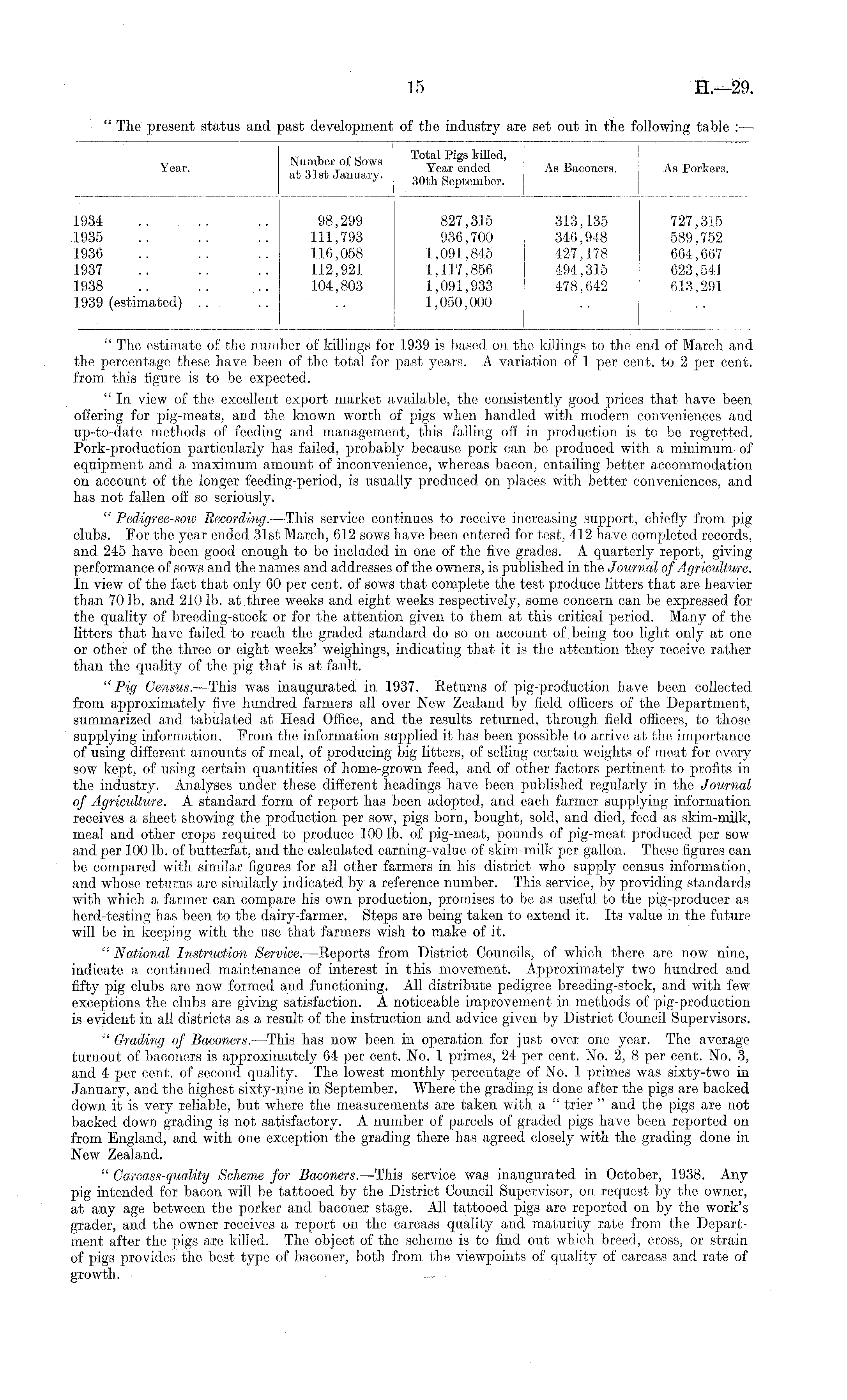 " The estimate of the number of killings for 1939 is based on the killings to the end of March and the percentage these have been of the total for past years. A variation of 1 per cent, to 2 per cent, from this figure is to be expected. " In view of the excellent export market available, the consistently good prices that have been offering for pig-meats, and. the known worth of pigs when handled with modern conveniences and up-to-date methods of feeding and management, this falling off in production is to be regretted. Pork-production particularly has failed, probably because pork can be produced with a minimum of equipment and a maximum amount of inconvenience, whereas bacon, entailing better accommodation on account of the longer feeding-period, is usually produced on places with better conveniences, and has not fallen oft' so seriously. " Pedigree-sow Recording.—This service continues to receive increasing support, chiefly from pig clubs. For the year ended 31st March, 612 sows have been entered for test, 412 have completed records, and 245 have been good enough to be included in one of the five grades. A quarterly report, giving performance of sows and the names and addresses of the owners, is published in the Journal of Agriculture. In view of the fact that only 60 per cent, of sows that complete the test produce litters that are heavier than 70 lb. and 210 lb. at ,three weeks and eight weeks respectively, some concern can be expressed for the quality of breeding-stock or for the attention given to them at this critical period. Many of the litters that have failed to reach the graded standard do so on account of being too light only at one or other of the three or eight weeks' weighings, indicating that it is the attention they receive rather than the quality of the pig that is at fault. "Pig Census. —This was inaugurated in 1937. Returns of pig-production have been collected from approximately five hundred farmers all over New Zealand by field officers of the Department, summarized and tabulated at Head Office, and the results returned, through field officers, to those supplying information. From the information supplied it has been possible to arrive at the importance of using different amounts of meal, of producing big litters, of selling certain weights of meat for every sow kept, of using certain quantities of home-grown feed, and of other factors pertinent to profits in the industry. Analyses under these different headings have been published regularly in the Journal of Agriculture. A standard form of report has been adopted, and each farmer supplying information receives a sheet showing the production per sow, pigs born, bought, sold, and died, feed as skim-milk, meal and other crops required to produce 100 lb. of pig-meat, pounds of pig-meat produced per sow and per 100 11). of butterfat, and the calculated earning-value of skim-milk per gallon. These figures can be compared with similar figures for all other farmers in his district who supply census information, and whose returns are similarly indicated by a reference number. This service, by providing standards with which a farmer can compare his own production, promises to be as useful to the pig-producer as herd-testing has been to the dairy-farmer. Steps are being taken to extend it. Its value in the future will be in keeping with the use that farmers wish to make of it. " National Instruction Service. —Reports from District Councils, of which there are now nine, indicate a continued maintenance of interest in this movement. Approximately two hundred and fifty pig clubs are now formed and functioning. All distribute pedigree breeding-stock, and with few exceptions the clubs are giving satisfaction. A noticeable improvement in methods of pig-production is evident in all districts as a result of the instruction and advice given by District Council Supervisors. " Grading of Baconers. —This has now been in operation for just over one year. The average turnout of baconers is approximately 64 per cent. No. 1 primes, 24 per cent. No. 2, 8 per cent. No. 3, and 4 per cent, of second quality. The lowest monthly percentage of No. 1 primes was sixty-two in January, and the highest sixty-nine in September. Where the grading is done after the pigs are backed down it is very reliable, but where the measurements are taken with a " trier " and the pigs are not backed down grading is not satisfactory. A number of parcels of graded pigs have been reported on from England, and with one exception the grading there has agreed closely with the grading done in Now Zealand. " Carcass-quality Scheme for Baconers. —This service was inaugurated in October, 1938. Any pig intended for bacon will be tattooed by the District Council Supervisor, on request by the owner, at any age between the porker and baconer stage. All tattooed pigs are reported on by the work's grader, and the owner receives a report on the carcass quality and maturity rate from the Department after the pigs are killed. The object of the scheme is to find out which breed, cross, or strain of pigs provides the best type of baconer, both from the viewpoints of quality of carcass and rate of growth.