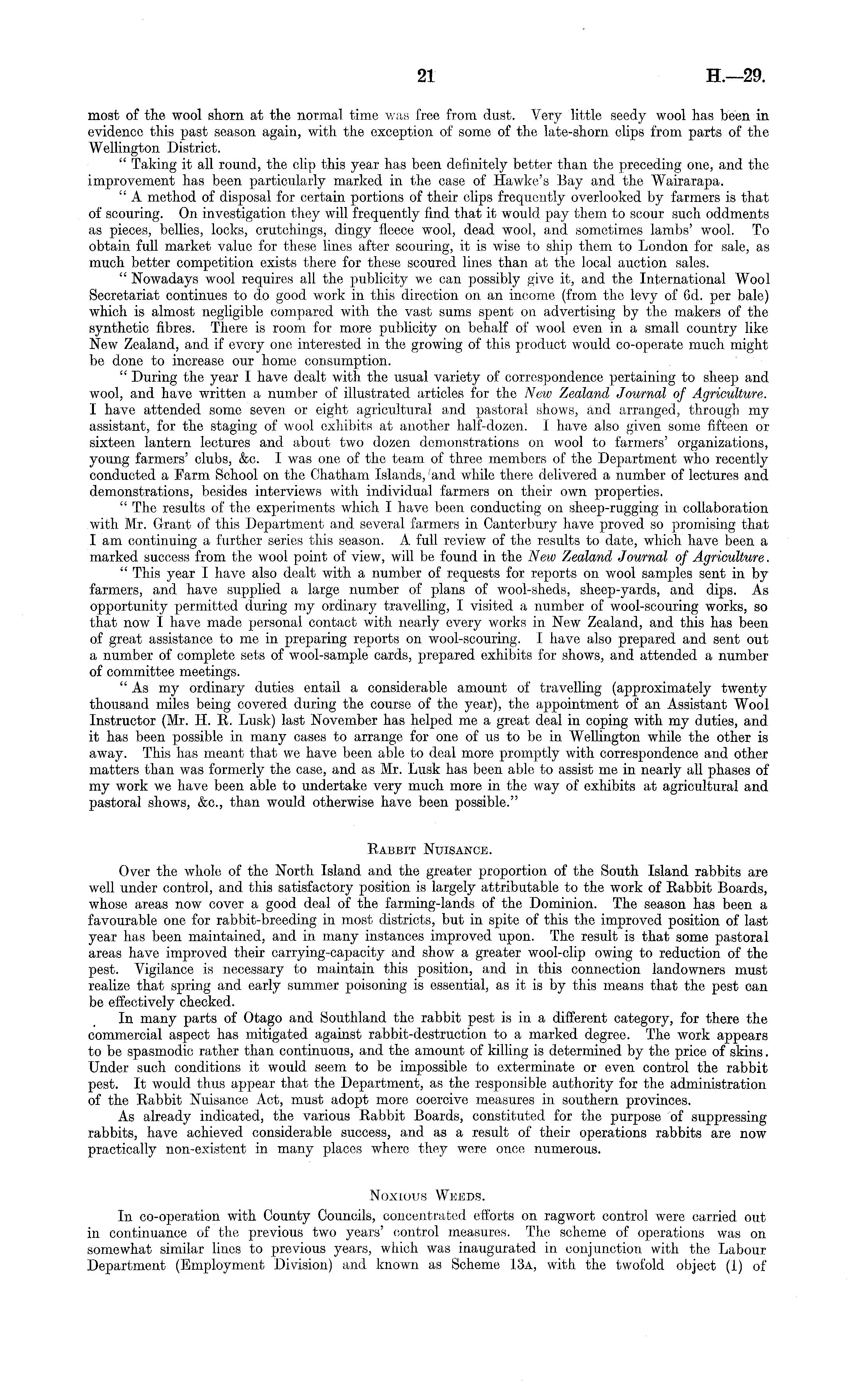 most of the wool shorn at the normal time was free from dust. Very little seedy wool has been in evidence this past season again, with the exception of some of the late-shorn clips from parts of the Wellington District. " Taking it all round, the clip this year has been definitely better than the preceding one, and the improvement has been particularly marked in the case of Hawke's Bay and the Wairarapa. " A method of disposal for certain portions of their clips frequently overlooked by farmers is that of scouring. On investigation they will frequently find that it would pay them to scour such oddments as pieces, bellies, locks, crutchings, dingy fleece wool, dead wool, and sometimes lambs' wool. To obtain full market value for these lines after scouring, it is wise to ship them to London for sale, as much better competition exists there for these scoured lines than at the local auction sales. " Nowadays wool requires all the publicity we can possibly give it, and the International Wool Secretariat continues to do good work in this direction on an income (from the levy of 6d. per bale) which is almost negligible compared with the vast sums spent on advertising by the makers of the synthetic fibres. There is room for more publicity on behalf of wool even in a small country like New Zealand, and if every one interested in the growing of this product would co-operate much might be done to increase our home consumption. " During the year I have dealt with the usual variety of correspondence pertaining to sheep and wool, and have written a number of illustrated articles for the New Zealand Journal of Agriculture. I have attended some seven or eight agricultural and pastoral shows, and arranged, through my assistant, for the staging of wool exhibits at another half-dozen. I have also given some fifteen or sixteen lantern lectures and about two dozen demonstrations on wool to farmers' organizations, young farmers' clubs, &c. I was one of the team of three members of the Department who recently conducted a Farm School on the Chatham Islands, and while there delivered a number of lectures and demonstrations, besides interviews with individual farmers on their own properties. " The results of the experiments which I have been conducting on sheep-rugging in collaboration with Mr. Grant of this Department and several farmers in Canterbury have proved so promising that lam continuing a further series this season. A full review of the results to date, which have been a marked success from the wool point of view, will be found in the New Zealand Journal of Agriculture. " This year I have also dealt with a number of requests for reports on wool samples sent in by farmers, and have supplied a large number of plans of wool-sheds, sheep-yards, and dips. As opportunity permitted during my ordinary travelling, I visited a number of wool-scouring works, so that now I have made personal contact with nearly every works in New Zealand, and this has been of great assistance to me in preparing reports on wool-scouring. I have also prepared and sent out a number of complete sets of wool-sample cards, prepared exhibits for shows, and attended a number of committee meetings. " As my ordinary duties entail a considerable amount of travelling (approximately twenty thousand miles being covered during the course of the year), the appointment of an Assistant Wool Instructor (Mr. H. R. Lusk) last November has helped me a great deal in coping with my duties, and it has been possible in many cases to arrange for one of us to be in Wellington while the other is away. This has meant that we have been able to deal more promptly with correspondence and other matters than was formerly the case, and as Mr. Lusk has been able to assist me in nearly all phases of my work we have been able to undertake very much more in the way of exhibits at agricultural and pastoral shows, &c., than would otherwise have been possible." Rabbit Nuisance. Over the whole of the North Island and the greater proportion of the South Island rabbits are well under control, and this satisfactory position is largely attributable to the work of Rabbit Boards, whose areas now cover a good deal of the farming-lands of the Dominion. The season has been a favourable one for rabbit-breeding in most districts, but in spite of this the improved position of last year has been maintained, and in many instances improved upon. The result is that some pastoral areas have improved their carrying-capacity and show a greater wool-clip owing to reduction of the pest. Vigilance is necessary to maintain this position, and in this connection landowners must realize that spring and early summer poisoning is essential, as it is by this means that the pest can be effectively checked. In many parts of Otago and Southland the rabbit pest is in a different category, for there the commercial aspect has mitigated against rabbit-destruction to a marked degree. The work appears to be spasmodic rather than continuous, and the amount of killing is determined by the price of skins. Under such conditions it would seem to be impossible to exterminate or even control the rabbit pest. It would thus appear that the Department, as the responsible authority for the administration of the Rabbit Nuisance Act, must adopt more coercive measures in southern provinces. As already indicated, the various Rabbit Boards, constituted for the purpose of suppressing rabbits, have achieved considerable success, and as a result of their operations rabbits are now practically non-existent in many places where they were once numerous. Noxious Weeds. In co-operation with County Councils, concentrated efforts on ragwort control were carried out in continuance of the previous two years' control measures. The scheme of operations was on somewhat similar lines to previous years, which was inaugurated in conjunction with the Labour Department (Employment Division) and known as Scheme 13a, with the twofold object (1) of