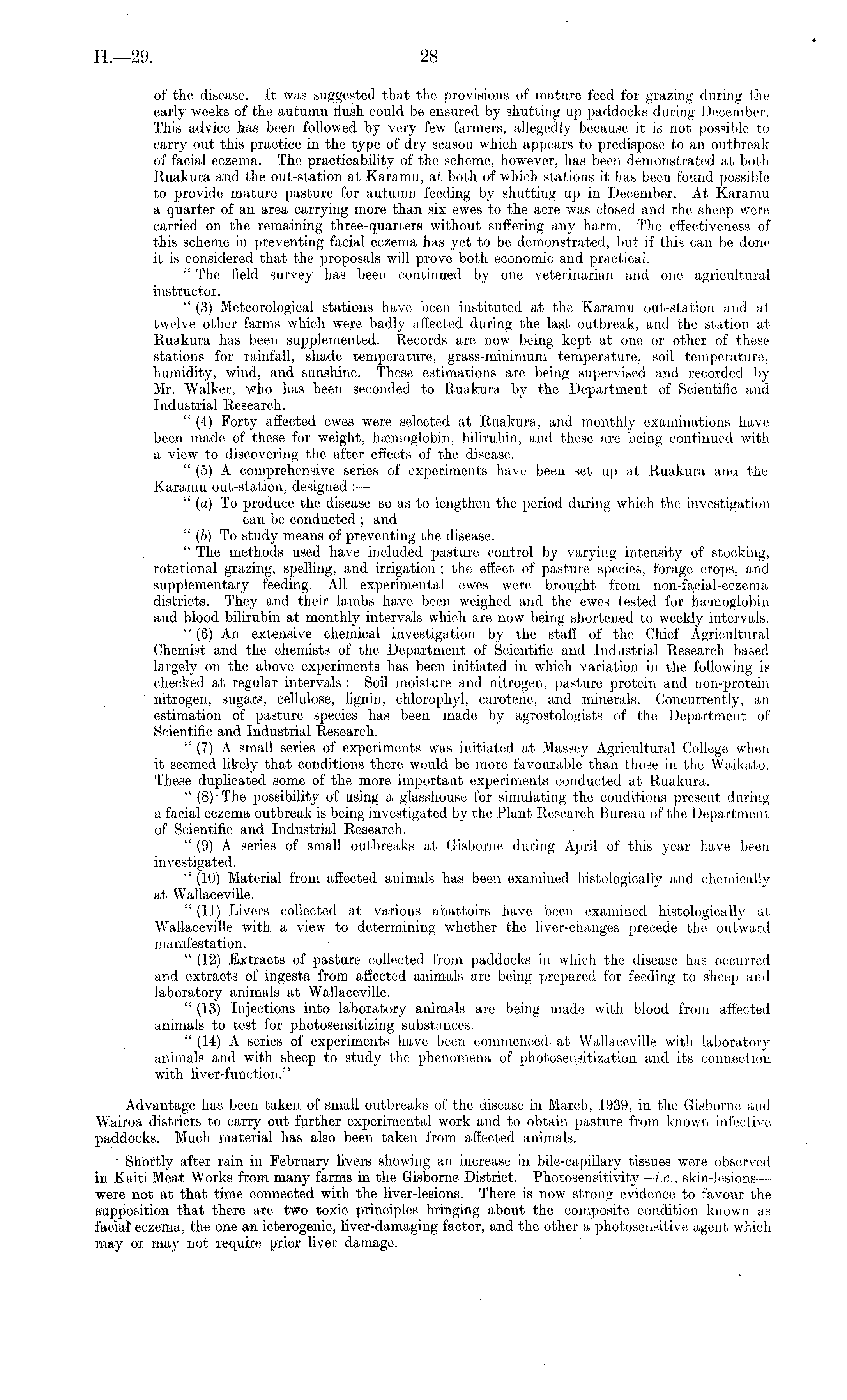 of the disease. It was suggested that the provisions of mature feed for grazing during the early weeks of the autumn flush could be ensured by shutting up paddocks during December. This advice has been followed by very few farmers, allegedly because it is not possible to carry out this practice in the type of dry season which appears to predispose to an outbreak of facial eczema. The practicability of the scheme, however, has been demonstrated at both Ruakura and the out-station at Karamu, at both of which stations it lias been found possible to provide mature pasture for autumn feeding by shutting up in December. At Karamu a quarter of an area carrying more than six ewes to the acre was closed and the sheep were carried on the remaining three-quarters without suffering any harm. The effectiveness of this scheme in preventing facial eczema has yet to be demonstrated, but if this can be done it is considered that the proposals will prove both economic and practical. " The field survey has been continued by one veterinarian and one agricultural instructor. " (3) Meteorological stations have been instituted at the Karamu out-station and at twelve other farms which, were badly affected during the last outbreak, and the station at Ruakura has been supplemented. Records are now being kept at one or other of these stations for rainfall, shade temperature, grass-minimum temperature, soil temperature, humidity, wind, and sunshine. These estimations arc being supervised and recorded by Mr. Walker, who has been seconded to Ruakura by the Department of Scientific and Industrial Research. " (4) Forty affected ewes were selected at Ruakura, and monthly examinations have been made of these for weight, haemoglobin, bilirubin, and these are being continued with a view to discovering the after effects of the disease. " (5) A comprehensive series of experiments have been set up at Ruakura and the Karamu out-station, designed : — " (a) To produce the disease so as to lengthen the period during which the investigation can be conducted ; and " (b) To study means of preventing the disease. " The methods used have included pasture control by varying intensity of stocking, rotational grazing, spelling, and irrigation ; the effect of pasture species, forage crops, and supplementary feeding. All experimental ewes were brought from non-facial-eczema districts. They and their lambs have been weighed and the ewes tested for haemoglobin and blood bilirubin at monthly intervals which are now being shortened to weekly intervals. " (6) An extensive chemical investigation by the staff of the Chief Agricultural Chemist and the chemists of the Department of Scientific and Industrial Research based largely on the above experiments has been initiated in which variation in the following is checked at regular intervals : Soil moisture and nitrogen, pasture, protein and non-protein nitrogen, sugars, cellulose, lignin, chlorophyl, carotene, and minerals. Concurrently, an estimation of pasture species has been made by agrostologists of the Department of Scientific and Industrial Research. " (7) A small series of experiments was initiated at Massey Agricultural College when it seemed likely that conditions there would be more favourable than those in the Waikato. These duplicated some of the more important experiments conducted at Ruakura. " (8) The possibility of using a glasshouse for simulating the conditions present during a facial eczema outbreak is being investigated by the Plant Research Bureau of the Department of Scientific and Industrial Research. " (9) A series of small outbreaks at Gisborne during April of this year have been investigated. " (10) Material from affected animals has been examined histologically and chemically at Wallaceville. " (11) Livers collected at various abattoirs have been examined histologically at Wallaceville with a view to determining whether the liver-changes precede the outward manifestation. " (12) Extracts of pasture collected from paddocks in which the disease has occurred and extracts of ingesta from affected animals are being prepared for feeding to sheep and laboratory animals at Wallaceville. " (13) Injections into laboratory animals are being made with blood from affected animals to test for photosensitizing substances. " (14) A series of experiments have been commenced at Wallaceville with laboratory animals and with sheep to study the phenomena of photosensitization and its connection with liver-function." Advantage has been taken of small outbreaks of the disease in March, .1939, in the Gisborne and "Wairoa districts to carry out further experimental work and to obtain pasture from known infective paddocks. Much material has also been taken from affected animals. Shortly after rain in February livers showing an increase in. bile-capillary tissues were observed in Kaiti Meat Works from many farms in the Gisborne District. Photosensitivity —i.e., skin-lesions — were not at that time connected with the liver-lesions. There is now strong evidence to favour the supposition that there are two toxic principles bringing about the composite condition known as facial eczema, the one an ioterogenic, liver-damaging factor, and the other a photosensitive agent which may or may not require prior liver damage.