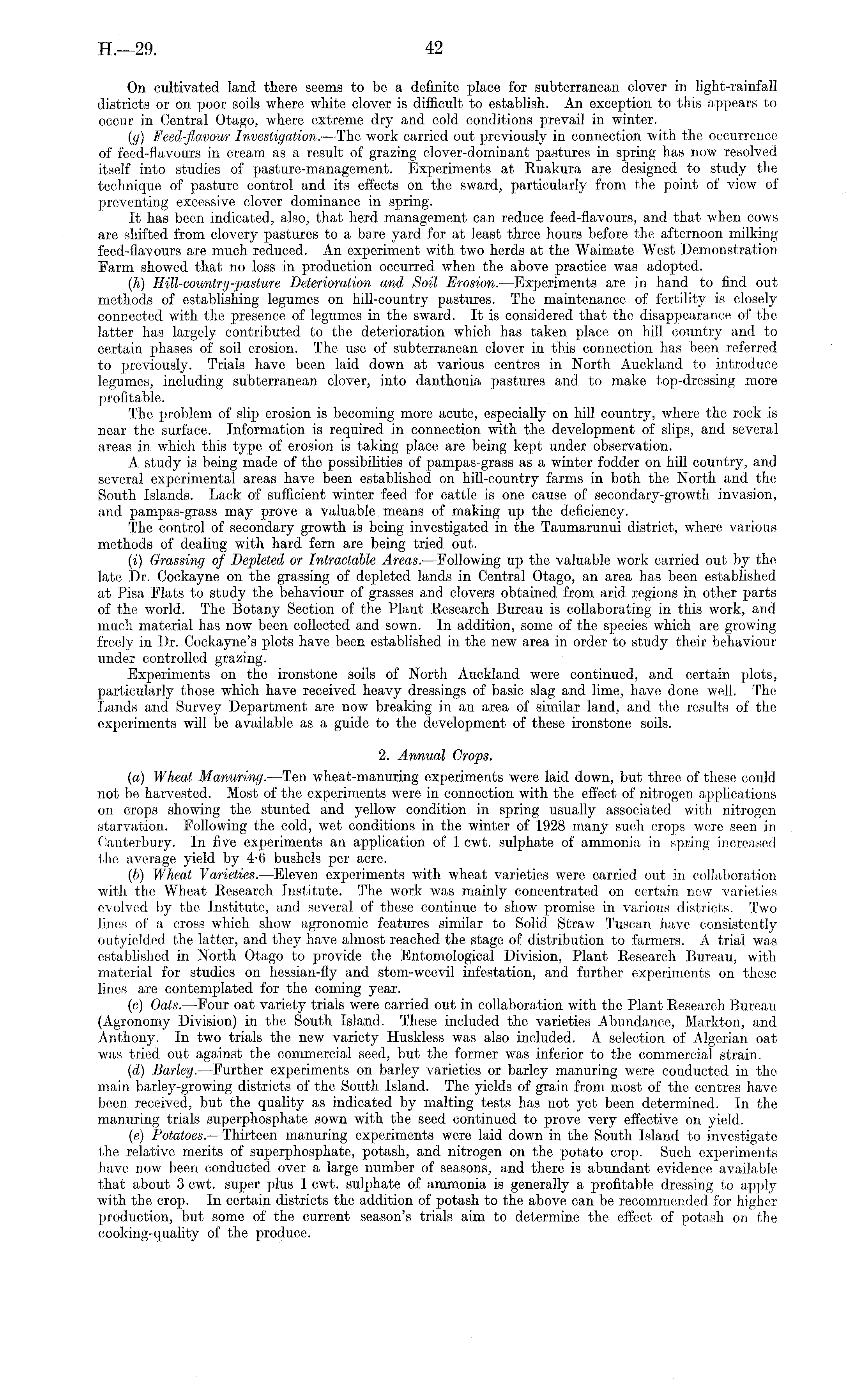 On cultivated land there seems to be a definite place for subterranean clover in light-rainfall districts or on poor soils where white clover is difficult to establish. An exception to this appears to occur in Central Otago, where extreme dry and cold conditions prevail in winter. (g) Feed-flavour Investigation - -The work carried out previously in connection with the occurrence of feed-flavours in cream as a result of grazing clover-dominant pastures in spring has now resolved itself into studies of pasture-management. Experiments at Ruakura are designed to study the technique of pasture control and its effects on the sward, particularly from the point of view of preventing excessive clover dominance in spring. It has been indicated, also, that herd management can reduce feed-flavours, and that when cows are shifted from clovery pastures to a bare yard for at least three hours before the afternoon milking feed-flavours are much reduced. An experiment with two herds at the Waimate West Demonstration Farm showed that no loss in production occurred when the above practice was adopted. (h) Hill-country-pasture Deterioration and Soil Erosion. —Experiments are in hand to find out methods of establishing legumes on hill-country pastures. The maintenance of fertility is closely connected with the presence of legumes in the sward. It is considered that the disappearance of the latter has largely contributed to the deterioration which has taken place on hill country and to certain phases of soil erosion. The use of subterranean clover in this connection has been referred to previously. Trials have been laid down at various centres in North Auckland to introduce legumes, including subterranean clover, into danthonia pastures and to make top-dressing more profitable. The problem of slip erosion is becoming more acute, especially on hill country, where the rock is near the surface. Information is required in connection with the development of slips, and several areas in which this type of erosion is taking place are being kept under observation. A study is being made of the possibilities of pampas-grass as a winter fodder on hill country, and several experimental areas have been established on hill-country farms in both the North and the South Islands. Lack of sufficient winter feed for cattle is one cause of secondary-growth invasion, and pampas-grass may prove a valuable means of making up the deficiency. The control of secondary growth is being investigated in the Taumarunui district, where various methods of dealing with hard fern are being tried out. (i) Grassing of Depleted or Intractable Areas. —Following up the valuable work carried out by the late Dr. Cockayne on the grassing of depleted lands in Central Otago, an area has been established at Pisa Flats to study the behaviour of grasses and clovers obtained from arid regions in other parts of the world. The Botany Section of the Plant Research Bureau is collaborating in this work, and much material has now been collected and sown. In addition, some of the species which are growing freely in Dr. Cockayne's plots have been established in the new area in order to study their behaviour under controlled grazing. Experiments on the ironstone soils of North Auckland were continued, and certain plots, particularly those which have received heavy dressings of basic slag and lime, have done well. The Lands and Survey Department are now breaking in an area of similar land, and the results of the experiments will be available as a guide to the development of these ironstone soils. 2. Annual Crops. (a) Wheat Manuring. —Ten wheat-manuring experiments were laid down, but three of these could not be harvested. Most of the experiments were in connection with the effect of nitrogen applications on crops showing the stunted and yellow condition in spring usually associated with nitrogen starvation. Following the cold, wet conditions in the winter of 1928 many such crops were seen in Canterbury. In five experiments an application of 1 cwt. sulphate of ammonia in spring increased the average yield by 4-6 bushels per acre. (b) Wheat Varieties. —Eleven experiments with wheat varieties were carried out in collaboration with the Wheat Research Institute. The work was mainly concentrated on certain now varieties evolved by the Institute, and several of these continue to show promise in various districts. Two lines of a cross which show agronomic features similar to Solid Straw Tuscan have consistently outyielded the latter, and they have almost reached the stage of distribution to farmers. A trial was established in North Otago to provide the Entomological Division, Plant Research Bureau, with material for studies on hessian-fly and stem-weevil infestation, and further experiments on these lines are contemplated for the coming year. (c) Oats. —Four oat variety trials were carried out in collaboration with the Plant Research Bureau (Agronomy Division) in the South Island. These included the varieties Abundance, Markton, and Anthony. In two trials the new variety Huskless was also included. A selection of Algerian oat was tried out against the commercial seed, but the former was inferior to the commercial strain. (d) Barley. —Further experiments on barley varieties or barley manuring were conducted in the main barley-growing districts of the South Island. The yields of grain from most of the centres have been received, but the quality as indicated by malting tests has not yet been determined. In the manuring trials superphosphate sown with the seed continued to prove very effective on yield. (e) Potatoes. —Thirteen manuring experiments were laid down in the South Island to investigate the relative merits of superphosphate, potash, and nitrogen on the potato crop. Such experiments have now been conducted over a large number of seasons, and there is abundant evidence available that about 3 cwt. super plus I cwt. sulphate of ammonia is generally a profitabl