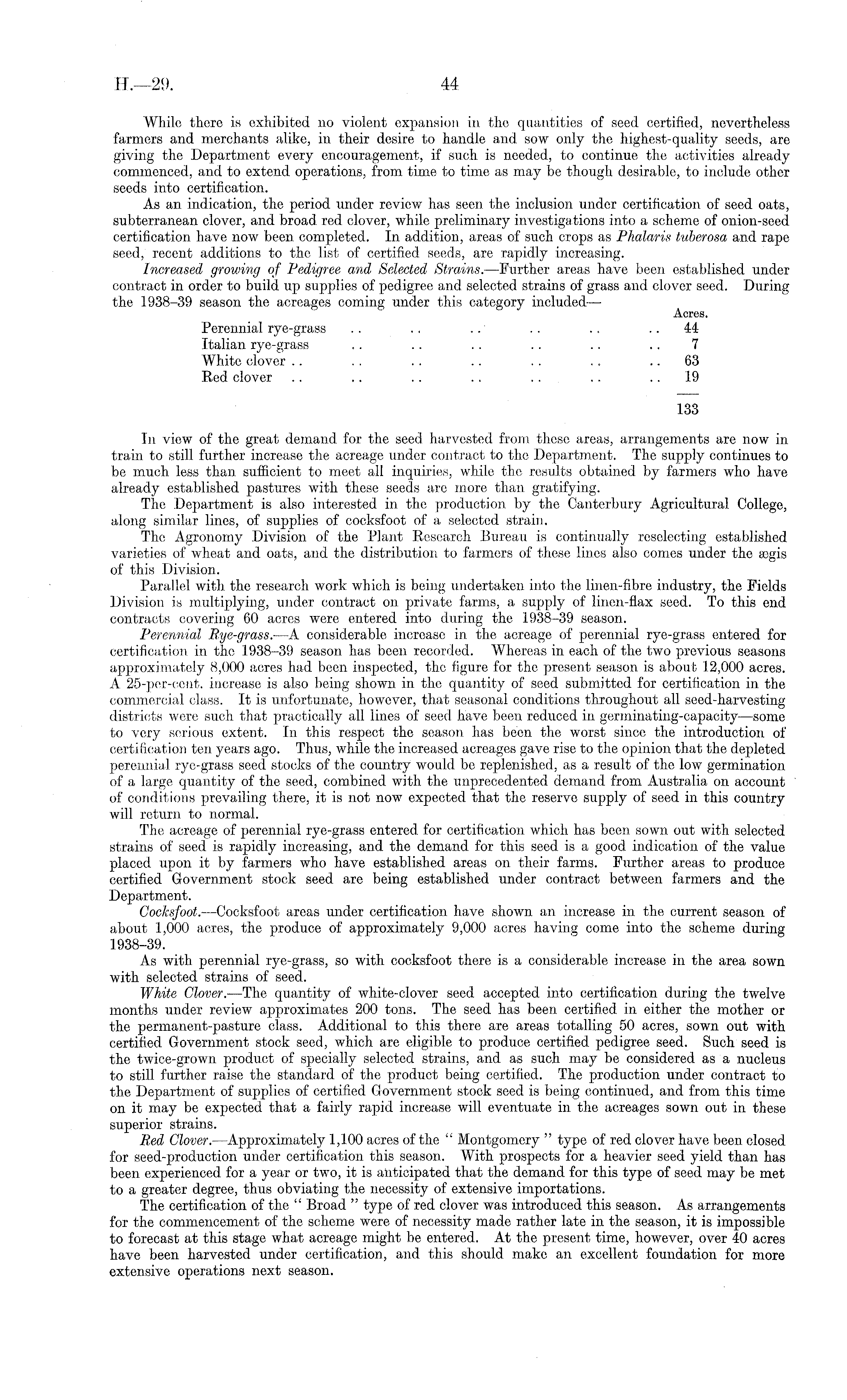While there is exhibited no violent expansion in the quantities of seed certified, nevertheless farmers and merchants alike, in their desire to handle and sow only the highest-quality seeds, are giving the Department every encouragement, if such is needed, to continue the activities already commenced, and to extend operations, from time to time as may be though desirable, to include other seeds into certification. As an indication, the period under review has seen the inclusion under certification of seed oats, subterranean clover, and broad red clover, while preliminary investigations into a scheme of onion-seed certification have now been completed. In addition, areas of such crops as Phalaris tuberosa and rape seed, recent additions to the list of certified seeds, are rapidly increasing. Increased growing of Pedigree and Selected Strains. —Further areas have been established under contract in order to build up supplies of pedigree and selected strains of grass and clover seed. During the 1938-39 season the acreages coming under this category included— Acres. Perennial rye-grass .. .. .. .. .. 44 Italian rye-grass .. .. .. .. .. .. 7 White clover .. .. .. .. .. .. 63 Red clover .. .. .. .. .. .. 19 133 In view of the great demand for the seed harvested from these areas, arrangements are now in train to still further increase the acreage under contract to the Department. The supply continues to be much less than sufficient to meet all inquiries, while the results obtained by farmers who have already established pastures with these seeds are more than gratifying. The Department is also interested in the production by the Canterbury Agricultural College, along similar lines, of supplies of cocksfoot of a selected strain. The Agronomy Division of the Plant Research Bureau is continually reselecting established varieties of wheat and oats, and the distribution to farmers of these lines also comes under the regis of this Division. Parallel with the research work which is being undertaken into the linen-fibre industry, the Fields Division is multiplying, under contract on private farms, a supply of linen-flax seed. To this end contracts covering 60 acres were entered into during the 1938-39 season. Perennial Rye-grass. —A considerable increase in the acreage of perennial rye-grass entered for certification in the 1938-39 season has been recorded. Whereas in each of the two previous seasons approximately 8,000 acres had been inspected, the figure for the present season is about 12,000 acres. A 25-per-cent. increase is also being shown in the quantity of seed submitted for certification in the commercial class. It is unfortunate, however, that seasonal conditions throughout all seed-harvesting districts were such that practically all lines of seed have been reduced iti germinating-capacity—some to very serious extent. In this respect the season has been the worst since the introduction of certification ten years ago. Thus, while the increased acreages gave rise to the opinion that the depleted perennial rye-grass seed stocks of the country would be replenished, as a result of the low germination of a large quantity of the seed, combined with the unprecedented demand from Australia on account of conditions prevailing there, it is not now expected that the reserve supply of seed in this country will return to normal. The acreage of perennial rye-grass entered for certification which has been sown out with selected strains of seed is rapidly increasing, and the demand for this seed is a good indication of the value placed upon it by farmers who have established areas on their farms. Further areas to produce certified Government stock seed are being established under contract between farmers and the Department. Cocksfoot. —Cocksfoot areas under certification have shown an increase in the current season of about 1,000 acres, the produce of approximately 9,000 acres having come into the scheme during 1938-39. As with perennial rye-grass, so with cocksfoot there is a considerable increase in the area sown with selected strains of seed. White Clover. —The quantity of white-clover seed accepted into certification during the twelve months under review approximates 200 tons. The seed has been certified in either the mother or the permanent-pasture class. Additional to this there are areas totalling 50 acres, sown out with certified Government stock seed, which are eligible to produce certified pedigree seed. Such seed is the twice-grown product of specially selected strains, and as such may be considered as a nucleus to still further raise the standard of the product being certified. The production under contract to the Department of supplies of certified Government stock seed is being continued, and from this time on it may be expected that a fairly rapid increase will eventuate in the acreages sown out in these superior strains. Red Clover. —Approximately 1,100 acres of the " Montgomery " type of red clover have been closed for seed-production under certification this season. With prospects for a heavier seed yield than has been experienced for a year or two, it is anticipated that the demand for this type of seed may be met to a greater degree, thus obviating the necessity of extensive importations. The certification of the " Broad " type of red clover was introduced this season. As arrangements for the commencement of the scheme were of necessity made rather late in the season, it is impossible to forecast at this stage what acreage might be entered. At the present time, however, over 40 acres have been harvested under certification, and this should make an excellent foundation for more extensive operations next season.