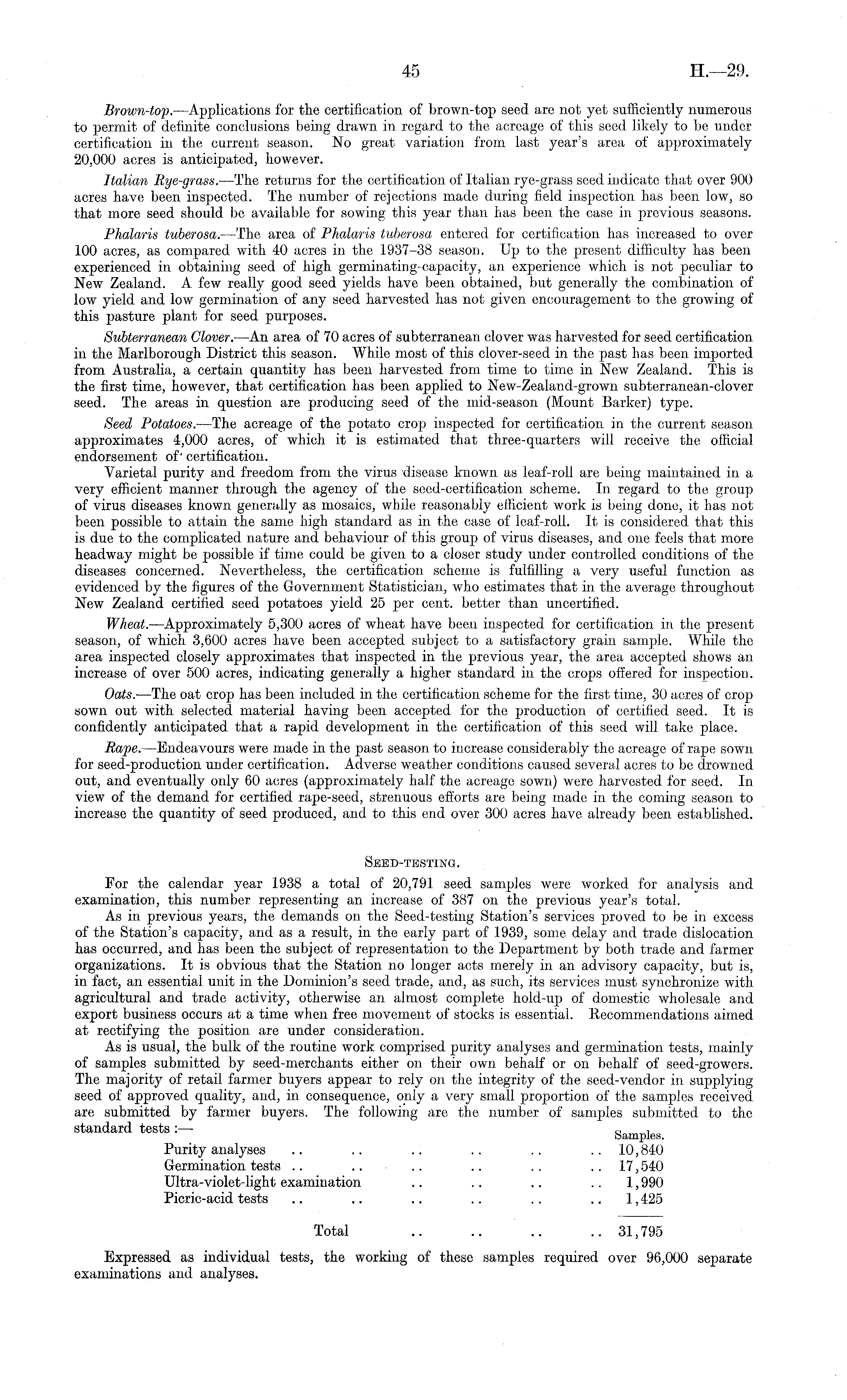 Brown-top. —Applications for the certification of brown-top seed are not yet sufficiently numerous to permit of definite conclusions being drawn in regard to the acreage of this seed likely to be under certification in the current season. No great variation from last year's area of approximately 20,000 acres is anticipated, however. Italian Rye-grass.—The returns for the certification of Italian rye-grass seed indicate that over 900 acres have been inspected. The number of rejections made during field inspection has been low, so that more seed should be available for sowing this year than has been the case in previous seasons. Phalaris tuberosa. —The area of Phalaris tuberosa entered for certification has increased to over 100 acres, as compared with 40 acres in the 1937-38 season. Up to the present difficulty has been experienced in obtaining seed of high germinating-capacity, an experience which is not peculiar to New Zealand. A few really good seed yields have been obtained, but generally the combination of low yield and low germination of any seed harvested has not given encouragement to the growing of this pasture plant for seed purposes. Subterranean Clover. —An area of 70 acres of subterranean clover was harvested for seed certification in the Marlborough District this season. While most of this clover-seed in the past has been imported from Australia, a certain quantity has been harvested from time to time in New Zealand. This is the first time, however, that certification has been applied to New-Zealand-grown subterranean-clover seed. The areas in question are producing seed of the mid-season (Mount Barker) type. Seed Potatoes. —The acreage of the potato crop inspected for certification in the current season approximates 4,000 acres, of which it is estimated that three-quarters will receive the official endorsement of' certification. Varietal purity and freedom from the virus disease known as leaf-roll are being maintained in a very efficient manner through the agency of the seed-certification scheme. In regard to the group of virus diseases known generally as mosaics, while reasonably efficient work is being done, it has not been possible to attain the same high standard as in the case of leaf-roll. It is considered that this is due to the complicated nature and behaviour of this group of virus diseases, and one feels that more headway might be possible if time could be given to a closer study under controlled conditions of the diseases concerned. Nevertheless, the certification scheme is fulfilling a very useful function as evidenced by the figures of the Government Statistician, who estimates that in the average throughout New Zealand certified seed potatoes yield 25 per cent, better than uncertified. Wheat. —Approximately 5,300 acres of wheat have been inspected for certification in the present season, of which 3,600 acres have been accepted subject to a satisfactory grain sample. While the area inspected closely approximates that inspected in the previous year, the area accepted shows an increase of over 500 acres, indicating generally a higher standard in the crops offered for inspection. Oats. —The oat crop has been included in the certification scheme for the first time, 30 acres of crop sown out with selected material having been accepted for the production of certified seed. It is confidently anticipated that a rapid development in the certification of this seed will take place. Rape. —Endeavours were made in the past season to increase considerably the acreage of rape sown for seed-production under certification. Adverse weather conditions caused several acres to be drowned out, and eventually only 60 acres (approximately half the acreage sown) were harvested for seed. In view of the demand for certified rape-seed, strenuous efforts are being made in the coming season to increase the quantity of seed produced, and to this end over 300 acres have already been established. Seed-testing. For the calendar year 1938 a total of 20,791 seed samples were worked for analysis and examination, this number representing an increase of 387 on the previous year's total. As in previous years, the demands on the Seed-testing Station's services proved to be in excess of the Station's capacity, and as a result, in the early part of 1939, some delay and trade dislocation has occurred, and has been the subject of representation to the Department by both trade and farmer organizations. It is obvious that the Station no longer acts merely in an advisory capacity, but is, in fact, an essential unit in the Dominion's seed trade, and, as such, its services must synchronize with agricultural and trade activity, otherwise an almost complete hold-up of domestic wholesale and export business occurs at a time when free movement of stocks is essential. Recommendations aimed at rectifying the position are under consideration. As is usual, the bulk of the routine work comprised purity analyses and germination tests, mainly of samples submitted by seed-merchants either on their own behalf or on behalf of seed-growers. The majority of retail farmer buyers appear to rely on the integrity of the seed-vendor in supplying seed of approved quality, and, in consequence, only a very small proportion of the samples received are submitted by farmer buyers. The following are the number of samples submitted to the standard tests : — Q „ , samples. Purity analyses .. .. .. .. .. .. 10,840 Germination tests .. .. .. .. .. .. 17,540 Ultra-violet-light examination .. .. .. .. 1,990 Picric-acid tests .. .. .. .. .. .. 1,425 Total .. .. .. .. 31,795 Expressed as individual tests, the workiug of these samples required over 96,000 separate examinations and analyses.