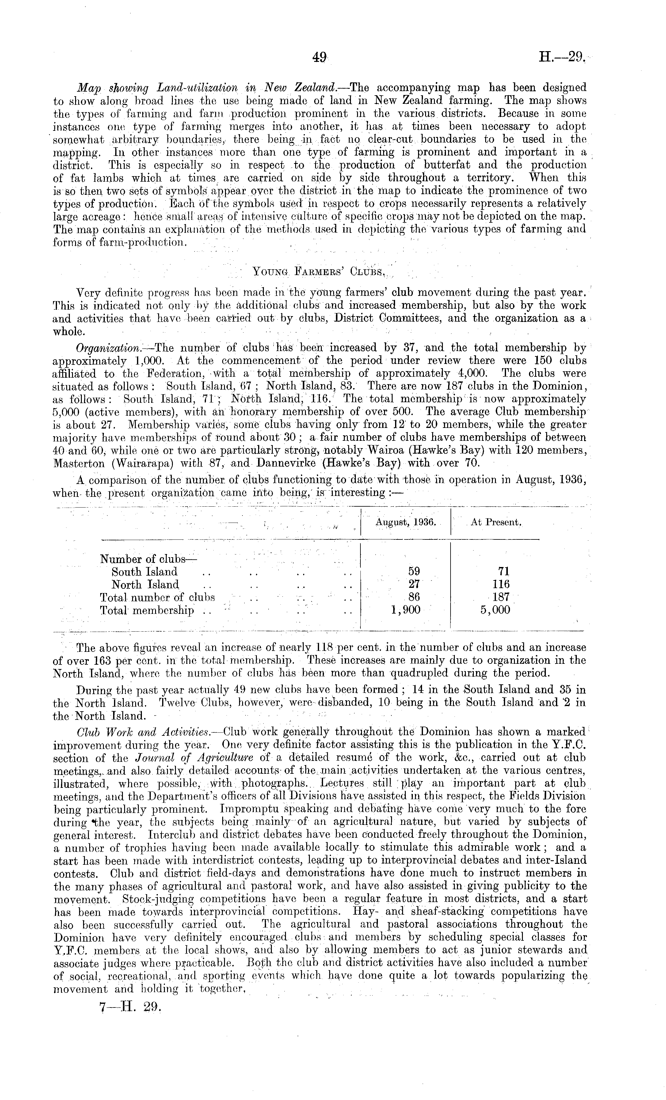 Map showing Land-utilization in New Zealand. -The accompanying map has been designed to show along broad lines the use being made of land in New Zealand farming. The map shows the types of farming and farm production prominent in the various districts. Because in some instances one type of farming merges into another, it has at times been necessary to adopt somewhat arbitrary boundaries, there being in fact no clear-cut boundaries to be used in the mapping. In other instances more than one type of farming is prominent and important in a district. This is especially so in respect to the production of butterfat and the production of fat lambs which at times are carried oil side by side throughout a territory. When this is so then two sets of symbols appear over the district in the map to indicate the prominence of two types of production . Each of the symbols used in respect to crops necessarily represents a relatively large acreage: hence small areas' of intensive culture of specific crops may not be depicted on the map. The map contains an explanation of the methods Used in depicting the various types of farming and forms of farm-production. Young Farmers' Clubs,. , Very definite progress has been made in the yotmg farmers' club movement during the past year. This is indicated not only by the additional clubs and increased membership, but also by the work and activities that have been carried out by clubs, District Committees, and the organization as a whole. Organization. —The number of clubs has been increased by 37, and the total membership by approximately 1,000. At the commencement of the period under review there were 150 clubs affiliated to the Federation, with a total membership of approximately 4,000. The clubs were situated as follows : South Island, 67 ; North Island, 83. There are now 187 clubs in the Dominion, as follows: South Island, 71; North Island, 116. The total membership is now approximately 5,000 (active members), with an honorary membership of over 500. The average Club membership is about 27. Membership varies, some clubs having only from 12 to 20 members, while the greater majority have memberships of round about/30 ; a fair number of clubs have memberships of between 40 and 60, while one or two are particularly strong, notably Wairoa (Hawke's Bay) with 120 members, Masterton (Wairarapa) with 87, and Dannevirke (Hawke's Bay) with over 70. A comparison of the number of clubs functioning to date with those in operation in August, 1936, when the present organization came into being, is interesting : —