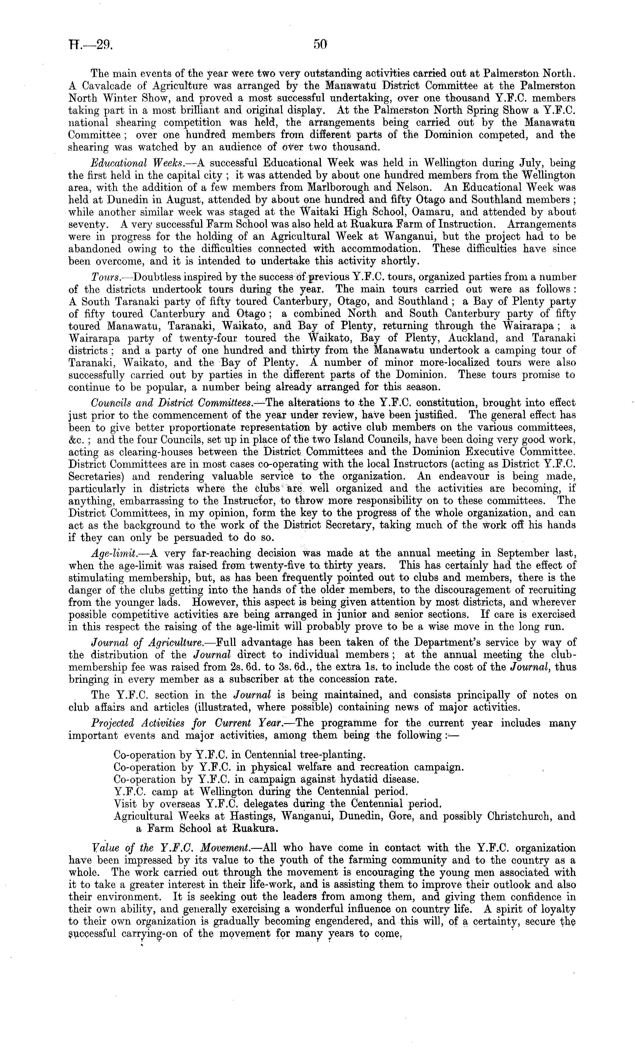 The main events of the year were two very outstanding activities carried out at Palmerston North. A Cavalcade of Agriculture was arranged by the Manawatu District Committee at the Palmerston North Winter Show, and proved a most successful undertaking, over one thousand Y.F.C. members taking part in a most brilliant and original display. At the Palmerston North Spring Show a Y.F.C. national shearing competition was held, the arrangements being carried out by the Manawatu Committee ; over one hundred members from different parts of the Dominion competed, and the shearing was watched by an audience of over two thousand. Educational Weeks. —A successful Educational Week was held in Wellington during July, being the first held in the capital city ; it was attended by about one hundred members from the Wellington area, with the addition of a few members from Marlborough and Nelson. An Educational Week was held at Dunedin in August, attended by about one hundred and fifty Otago and Southland members ; while another similar week was staged at the Waitaki High School, Oamaru, and attended by about seventy. A very successful Farm School was also held at Ruakura Farm of Instruction. Arrangements were in progress for the holding of an Agricultural Week at Wanganui, but the project had to be abandoned owing to the difficulties connected with accommodation. These difficulties have since been overcome, and it is intended to undertake this activity shortly. Tours. —Doubtless inspired by the success of previous Y.F.C. tours, organized parties from a number of the districts undertook tours during the year. The main tours carried out wore as follows : A South Taranaki party of fifty toured Canterbury, Otago, and Southland; a Bay of Plenty party of fifty toured Canterbury and Otago ; a combined North and South Canterbury party of fifty toured Manawatu, Taranaki, Waikato, and Bay of Plenty, returning through the Wairarapa ; a Wairarapa party of twenty-four toured the Waikato, Bay of Plenty, Auckland, and Taranaki districts ; and a party of one hundred and thirty from the Manawatu undertook a camping tour of Taranaki, Waikato, and the Bay of Plenty. A number of minor more-localized tours were also successfully carried out by parties in the different parts of the Dominion. These tours promise to continue to be popular, a number being already arranged for this season. Councils and District Committees.—The alterations to the Y.F.C. constitution, brought into effect just prior to the commencement of the year under review, have been justified. The general effect has been to give better proportionate representation by active club members on the various committees, &c. ; and the four Councils, set up in place of the two Island Councils, have been doing very good work, acting as clearing-houses between the District Committees and the Dominion Executive Committee. District Committees are in most cases co-operating with the local Instructors (acting as District Y.F.C. Secretaries) and rendering valuable service to the organization. An endeavour is being made, particularly in districts where the clubs are well organized and the activities are becoming, if anything, embarrassing to the Instructor, to throw more responsibility on to these committees. The District Committees, in my opinion, form the key to the progress of the whole organization, and can act as the background to the work of the District Secretary, taking much of the work off his hands if they can only be persuaded to do so. Age-limit.—A very far-reaching decision was made at the annual meeting in September last, when the ago-limit was raised from twenty-five to thirty years. This has certainly had the effect of stimulating membership, but, as has been frequently pointed out to clubs and members, there is the danger of the clubs getting into the hands of the older members, to the discouragement of recruiting from the younger lads. However, this aspect is being given attention by most districts, and wherever possible competitive activities are being arranged in junior and senior sections. If care is exercised in this respect the raising of the age-limit will probably prove to be a wise move in the long run. Journal of Agriculture.—Full advantage has been taken of the Department's service by way of the distribution of the Journal direct to individual members ; at the annual meeting the clubmembership fee was raised from 2s. 6d. to 3s. 6d., the extra Is. to include the cost of the Journal, thus bringing in every member as a subscriber at the concession rate. The Y.F.C. section in the Journal is being maintained, and consists principally of notes 011 club affairs and articles (illustrated, where possible) containing news of major activities. Projected Activities for Current Year.—The programme for the current year includes many important events and major activities, among them being the following : — Co-operation by Y.F.C. in Centennial tree-planting. Co-operation by Y.F.C. in physical welfare and recreation campaign. Co-operation by Y.F.C. in campaign against hydatid disease. Y.F.C. camp at Wellington during the Centennial period. Visit by overseas Y.F.C. delegates during the Centennial period. Agricultural Weeks at Hastings, Wanganui, Dunedin, Gore, and possibly Christchurch, and a Farm School at Ruakura. Value of the Y.F.C. Movement.—All who have come in contact with the Y.F.C. organization have been impressed by its value to the youth of the farming community and to the country as a whole. The work carried out through the movement is encouraging the young men associated with it to take a greater interest in their life-work, and is assisting them to improve their outlook and also their environment. It is seeking out the leaders from among them, and giving them confidence in their own ability, and generally exercising a wonderful influence on country life. A spirit of loyalty to their own organization is gradually becoming engendered, and this 