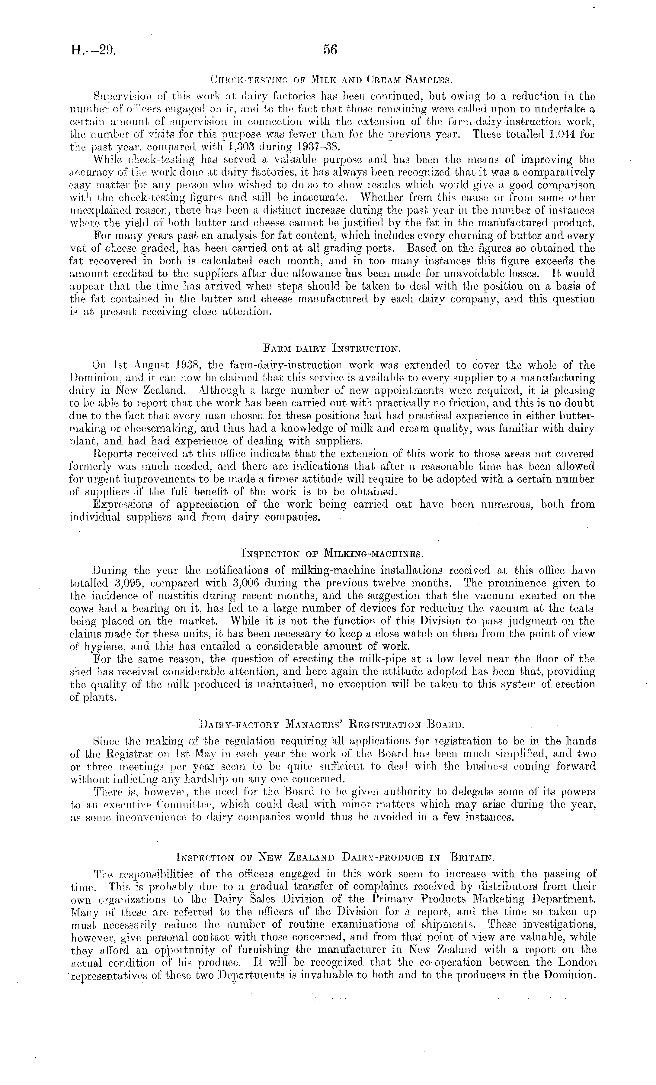 Check-testing op Milk and Cream Samples. Supervision of this work at dairy factories lias been continued, but owing to a reduction in the number of officers engaged on it, and to the fact that those remaining were called upon to undertake a certain amount of supervision in connection with the extension of the farm-dairy-instruction work, the number of visits for this purpose was fewer than for the previous year. These totalled 1,044 for the past year, compared with 1,303 during 1937-38. While check-testing has served a valuable purpose and has been the means of improving the accuracy of the work done at dairy factories, it has always been recognized that it was a comparatively easy matter for any person who wished to do so to show results which would give a good comparison with the check-testing figures and still be inaccurate. Whether from this cause or from some other unexplained reason, there has been a distinct increase during the past year in the number of instances where the yield of both butter and cheese cannot be justified by the fat in the manufactured product. For many years past an analysis for fat content, which includes every churning of butter and every vat of cheese graded, has been carried out at all grading-ports. Based on the figures so obtained the fat recovered in both is calculated each month, and in too many instances this figure exceeds the amount credited to the suppliers after due allowance has been made for unavoidable losses. It would appear that the time has arrived when steps should be taken to deal with the position on a basis of the fat contained in the butter and cheese manufactured by each dairy company, and this question is at present receiving close attention. Farm-dairy Instruction. On Ist August 1938, the farm-dairy-instruction work was extended to cover the whole of the Dominion, and. it can now be claimed that this service is available to every supplier to a manufacturing dairy in New Zealand. Although a large number of new appointments were required, it is pleasing to be able to report that the work has been carried out with practically no friction, and this is no doubt due to the fact that every man chosen for these positions had had practical experience in either buttermaking or cheesemaking, and thus had a knowledge of milk and cream quality, was familiar with dairy plant, and had had experience of dealing with suppliers. Reports received at this office indicate that the extension of this work to those areas not covered formerly was much needed, and there are indications that after a reasonable time has been allowed for urgent improvements to be made a firmer attitude will require to be adopted with a certain number of suppliers if the full benefit of the work is to be obtained. Expressions of appreciation of the work being carried out have been numerous, both from individual suppliers and from, dairy companies. Inspection of Milking-machines. During the year the notifications of milking-machine installations received at this office have totalled 3,095, compared with 3,006 during the previous twelve months. The prominence given to the incidence of mastitis during recent months, and the suggestion that the vacuum exerted on the cows had a bearing on it, has led to a large number of devices for reducing the vacuum at the teats being placed on the market. While it is not the function of this Division to pass judgment on the claims made for these units, it has been necessary to keep a close watch on them from the point of view of hygiene, and this has entailed a considerable amount of work. For the same reason, the question of erecting the milk-pipe at a low level near the floor of the shed has received considerable attention, and here again the attitude adopted has been that, providing the quality of the milk produced is maintained, no exception will be taken to this system of erection of plants. Dairy-factory Managers' Registration Board. Since the making of the regulation requiring all applications for registration to be in the hands of the Registrar on. Ist May in each year the work of the Board has been much simplified, and two or three meetings per year seem to be quite sufficient to deal with the business coming forward without inflicting any hardship on any one concerned. There is, however, the need for the Board to be given authority to delegate some of its powers to an executive Committee, which could deal with minor matters which may arise during the year, as some inconvenience to dairy companies would thus be avoided in a few instances. Inspection of New Zealand Dairy-produce in Britain. The responsibilities of the officers engaged, in this work seem to increase with the passing of time. This is probably due to a gradual transfer of complaints received by distributors from their own organizations to the Dairy Sales Division of the Primary Products Marketing Department. Many of these are referred to the officers of the Division for a report, and the time so taken up must necessarily reduce the number of routine examinations of shipments. These investigations, however, give personal contact with those concerned, and from that point of view are valuable, while they afford an opportunity of furnishing the manufacturer in New Zealand with a report on the actual condition of his produce. It will be recognized that the co-operation between the London 'representatives of these two Departments is invaluable to both and to the producers in the Dominion,