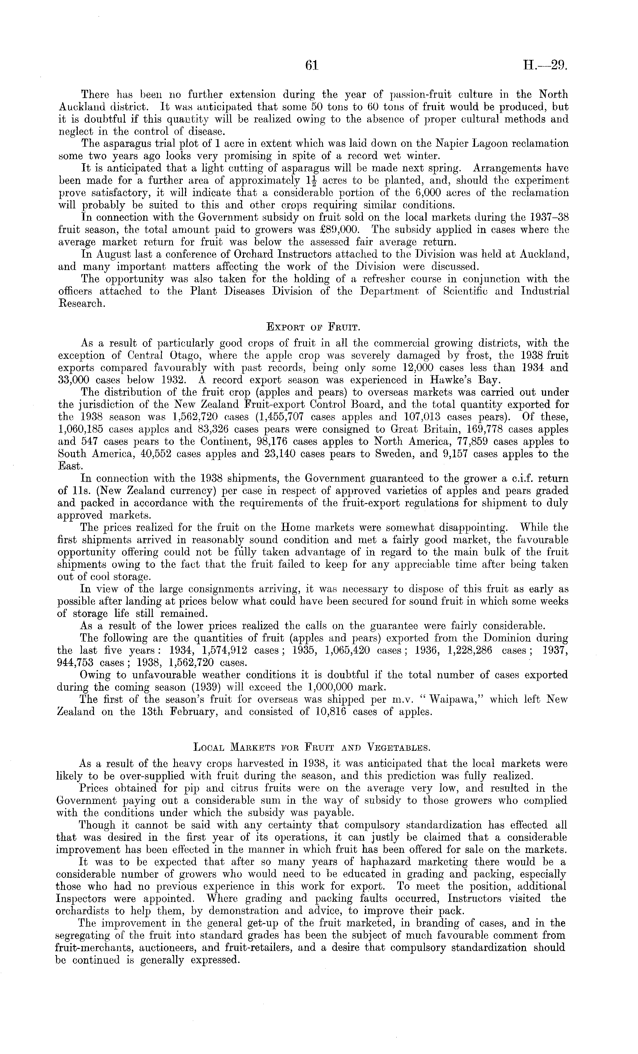 There has been no further extension during the year of passion-fruit culture in the North Auckland district. It was anticipated that some 50 tons to 60 tons of fruit would be produced, but it is doubtful if this quantity will be realized owing to the absence of proper cultural methods and neglect in the control of disease. The asparagus trial plot of 1 acre in extent which was laid down on the Napier Lagoon reclamation some two years ago looks very promising in spite of a record wet winter. It is anticipated that a light cutting of asparagus will be made next spring. Arrangements have been made for a further area of approximately H acres to be planted, and, should the experiment prove satisfactory, it will indicate that a considerable portion of the 6,000 acres of the reclamation will probably be suited to this and other crops requiring similar conditions. In connection with the Government subsidy on fruit sold on the local markets during the 1937-38 fruit season, the total amount paid to growers was £89,000. The subsidy applied in cases where the average market return for fruit was below the assessed fair average return. In August last a conference of Orchard Instructors attached to the Division was held at Auckland, and many important matters affecting the work of the Division were discussed. The opportunity was also taken for the holding of a refresher course in conjunction with the officers attached to the Plant Diseases Division of the Department of Scientific and Industrial Research. Export of Fruit. As a result of particularly good crops of fruit in all the commercial growing districts, with the exception of Central Otago, where the apple crop was severely damaged by frost, the 1938 fruit exports compared favourably with past records, being only some 12,000 cases less than 1934 and 33,000 cases below 1932. A record export season was experienced in Hawke's Bay. The distribution of the fruit crop (apples and pears) to overseas markets was carried out under the jurisdiction of the New Zealand Fruit-export Control Board, and the total quantity exported for the 1938 season was 1,562,720 cases (1,4-55,707 cases apples and 107,013 cases pears). Of these, 1,060,185 cases apples and 83,326 cases pears were consigned to Great Britain, 169,778 cases apples and 547 cases pears to the Continent, 98,176 cases apples to North America, 77,859 cases apples to South America, 40,552 cases apples and 23,140 cases pears to Sweden, and 9,157 cases apples to the Bast. In connection with the 1938 shipments, the Government guaranteed to the grower a c.i.f. return of lis. (New Zealand currency) per case in respect of approved varieties of apples and pears graded and packed in accordance with the requirements of the fruit-export regulations for shipment to duly approved markets. The prices realized for the fruit on the Home markets were somewhat disappointing. While the first shipments arrived in reasonably sound condition and met a fairly good market, the favourable opportunity offering could not be fully taken advantage of in regard to the main bulk of the fruit shipments owing to the fact that the fruit failed to keep for any appreciable time after being taken out of cool storage. In view of the large consignments arriving, it was necessary to dispose of this fruit as early as possible after landing at prices below what could have been secured for sound fruit in which some weeks of storage life still remained. As a result of the lower prices realized the calls on the guarantee were fairly considerable. The following are the quantities of fruit (apples and pears) exported from the Dominion during the last five years: 1934, 1,574,912 cases; 1935, 1,065,420 cases; 1936, 1,228,286 cases ; 1937, 944,753 cases ; 1938, 1,562,720 cases. Owing to unfavourable weather conditions it is doubtful if the total number of cases exported during the coming season (1939) will exceed the 1,000,000 mark. The first of the season's fruit for overseas was shipped per m.v. " Waipawa," which left New Zealand on the 13th February, and consisted of 10,816 cases of apples. Local Markets for Fruit and Vegetables. As a result of the heavy crops harvested in 1938, it was anticipated that the local markets were likely to be over-supplied with fruit during the season, and this prediction was fully realized. Prices obtained for pip and citrus fruits were on the average very low, and resulted in the Government paying out a considerable sum in the way of subsidy to those growers who complied with the conditions under which the subsidy was payable. Though it cannot be said with any certainty that compulsory standardization has effected all that was desired in the first year of its operations, it can justly be claimed that a considerable improvement has been effected in the manner in which fruit has been offered for sale on the markets. It was to be expected that after so many years of haphazard marketing there would be a considerable number of growers who would need to be educated in grading and packing, especially those who had no previous experience in this work for export. To meet the position, additional Inspectors were appointed. Where grading and packing faults occurred, Instructors visited the orchardists to help them, by demonstration and advice, to improve their pack. The improvement in the general get-up of the fruit marketed, in branding of cases, and in the segregating of the fruit into standard grades has been the subject of much favourable comment from fruit-merchants, auctioneers, and fruit-retailers, and a desire that compulsory standardization should be continued is generally expressed.