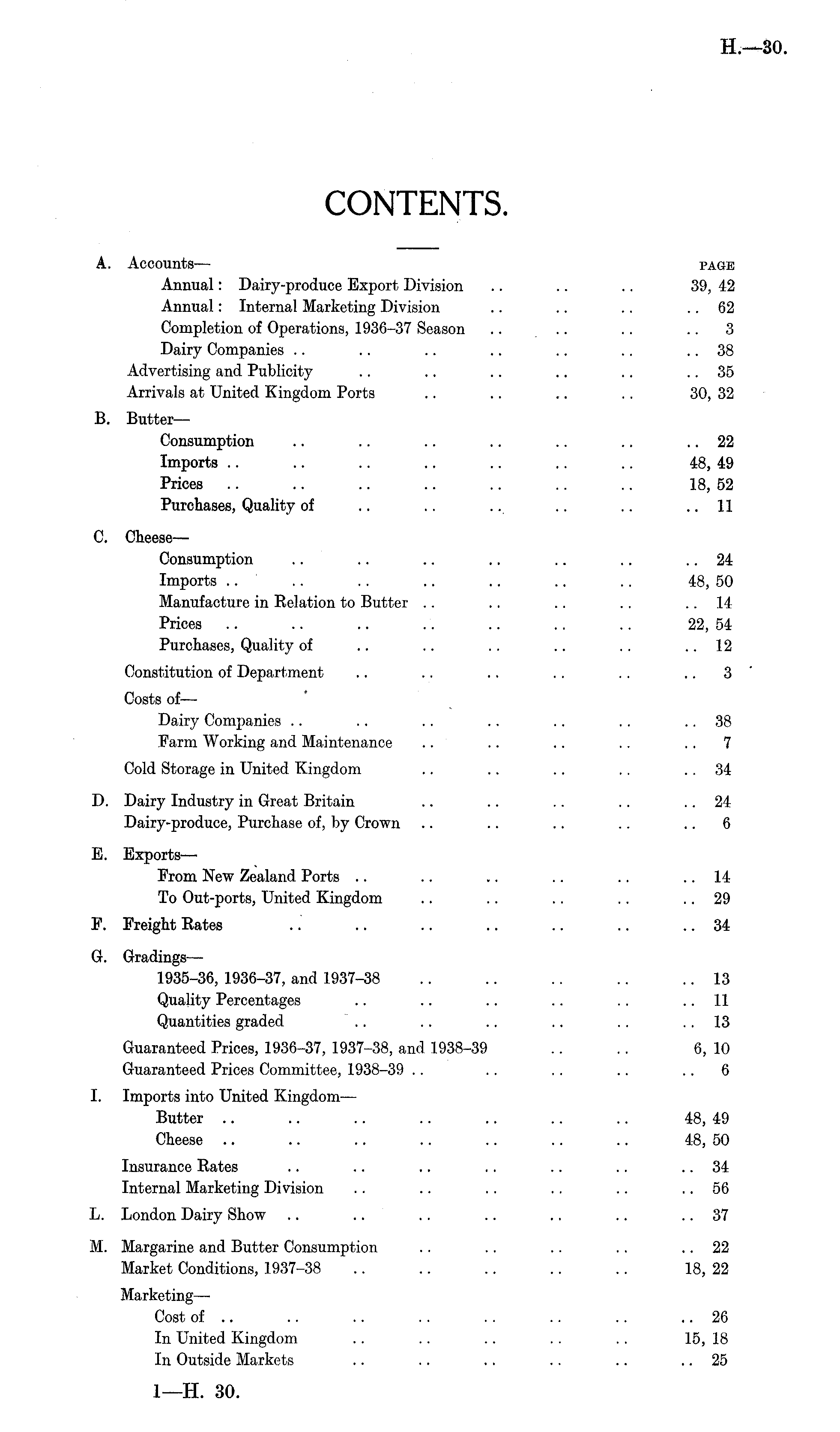 A. Accounts — page Annual: Dairy-produce Export Division .. .. .. 39, 42 Annual: Internal Marketing Division .. .. .. 62 Completion of Operations, 1936-37 Season .. .. .. 3 Dairy Companies .. .. .. .. .. .. .. 38 Advertising and Publicity .. .. .. .. .. .. 35 Arrivals at United Kingdom Ports .. .. .. .. 30, 32 B. Butter — Consumption .. .. .. .. .. .. .. 22 Imports .. .. .. .. .. .. .. 48, 49 Prices .. .. .. .. .. .. .. 18, 52 Purchases, Quality of .. .. .. .. .. ..11 C. Cheese — Consumption .. .. .. .. .. .. .. 24 Imports .. .. .. .. .. .. .. 48, 50 Manufacture in Relation to Butter .. .. .. .. 14 Prices .. .. .. .. .. .. .. 22, 54 Purchases, Quality of .. .. .. .. .. 12 Constitution of Department .. .. .. .. .. 3 Costs of — Dairy Companies .. .. .. .. .. .. 38 Farm Working and Maintenance .. .. .. .. 7 Cold Storage in United Kingdom .. .. .. .. 34 D. Dairy Industry in Great Britain .. .. .. .. .. 24 Dairy-produce, Purchase of, by Crown .. .. .. .. 6 E. Exports— From New Zealand Ports .. .. .. .. .. 14 To Out-ports, United Kingdom .. .. .. .. .. 29 F. Freight Rates .. .. .. .. .. .. .. 34 G. Gradings— 1935-36, 1936-37, and 1937-38 .. .. .. .. 13 Quality Percentages .. .. .. .. .. 11 Quantities graded .. .. .. .. .. 13 Guaranteed Prices, 1936-37, 1937-38, and 1938-39 .. .. 6, 10 Guaranteed Prices Committee, 1938-39 .. .. .. .. 6 I. Imports into United Kingdom— Butter .. .. .. .. .. .. .. 48, 49 Cheese .. .. .. .. .. .. .. 48, 50 Insurance Rates .. .. .. .. .. .. .. 34 Internal Marketing Division .. .. .. .. .. .. 56 L. London Dairy Show .. .. .. .. .. .. .. 37 M. Margarine and Butter Consumption .. .. .. .. .. 22 Market Conditions, 1937-38 .. .. .. .. .. 18, 22 Marketing— Cost of .. .. .. .. .. .. .. .. 26 In United Kingdom .. .. .. . . . . 15, 18 In Outside Markets .. .. .. .. .. .. 25