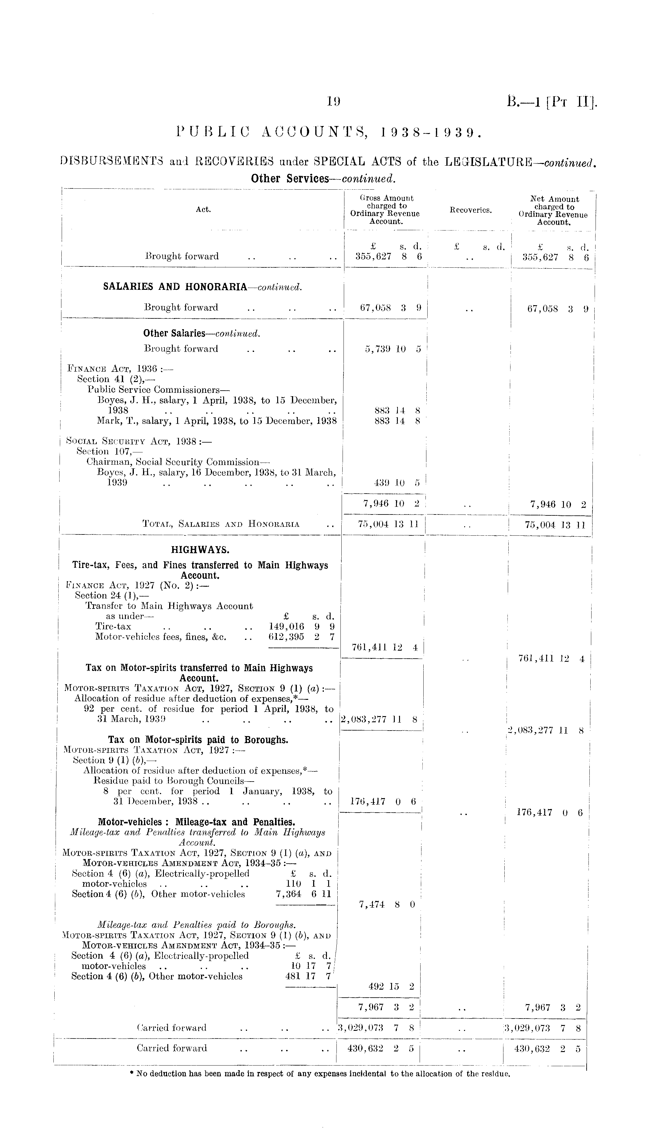 Gross Amount Set Amount Ai>t charged to Rcnverina charged to Act - Ordinary Revenue Recoveries. Ordinary Revenue Account. Account. £ s. d. £ s. d. £ s. d. Brought forward .. .. .. 355,627 8 6 i .. 355,627 8 6 SALARIES AND HONORARIA— continued. Brought forward .. .. .. 67,058 3 9 .. 67,058 3 9 Other Salaries — continued. Brought forward .. .. .. 5,739 10 5 Finance Act, 1936 :— Section 41 (2),— Public Service Commissioners— Boyes, J. BL, salary, 1 April, 1938, to 15 December, 1938 .. .. .. .. .. 883 14 8 Mark, T., salary, 1 April, 1938, to 15 December, 1938 883 14 8 Social Security Act, 1938 :— Section 107, — Chairman, Social Security Commission— Boyes, J. H., salary, 16 December, 1938, to 31 March, 1939 .. .. .. .. .. 439 10 5 7,946 10 2 j .. 7,946 10 2 Total, Salaries and Honoraria .. 75,004 13 11 .. 75,004 13 11 HIGHWAYS. Tire-tax, Fees, and Fines transferred to Main Highways Account. Finance Act, 1927 (No. 2) :— Section 24 (1),— Transfer to Main Highways Account as under— £ s. d. Tire-tax .. .. .. 149,016 9 9 Motor-vehicles fees, fines, &c. .. 612,395 2 7 761,411 12 4 .. 761,411 12 4 Tax on Motor-spirits transferred to Main Highways Account. Motor-spirits Taxation Act, 1927, Section 9 (1) (a) : — Allocation of residue after deduction of expenses,*— 92 per cent, of residue for period 1 April, 1938, to 31 March, 1939 .. .. .. .. 2,083,277 11 8 .. 12,083,277 11 8 Tax on Motor-spirits paid to Boroughs. Motor-spirits Taxation Act, 1927 : — Section 9(1) (ft),— Allocation of residue after deduction of expenses,*— Residue paid to Borough Councils— 8 per cent, for period 1 January, 1938, to 31 December, 1938 .. .. .. .. 176,417 0 6 .. 176,417 0 6 Motor-vehicles : Mileage-tax and Penalties. Mileage-tax and Penalties transferred to Main Highways Account. Motob-spieits Taxation Act, 1927, Section 9(1) (a), and MOTOR-VEHICLES AMENDMENT ACT, 1934-35 :— Section 4 (6) (a), Electrically-propelled £ s. d. motor-vehicles .. .. .. 110 1 1 Section4 (6) (b), Other motor-vehicles 7,364 6 11 ■ 7,474 8 0 Mileage-tax and Penalties paid to Boroughs. Motor-spirits Taxation Aot, 1927, Section 9(1) (b), and Motor-vehicles Amendment Act, 1934-35 : —■ Section 4 (6) (a), Electrically-propelled £ s. d. I motor-vehicles .. .. .. 10 17 7 Section 4 (6) (b), Other motor-vehicles 481 17 7 492 15 2 7,967 3 2 .. 7,967 3 2 Carried forward .. .. .. 3,029,073 7 8 .. 13,029,073 7 8 Carried forward .. .. .. 430,632 2 5 .. 430,632 2 5 * No deduction has been made in respect of any expenses incidental to the allocation of the residue.