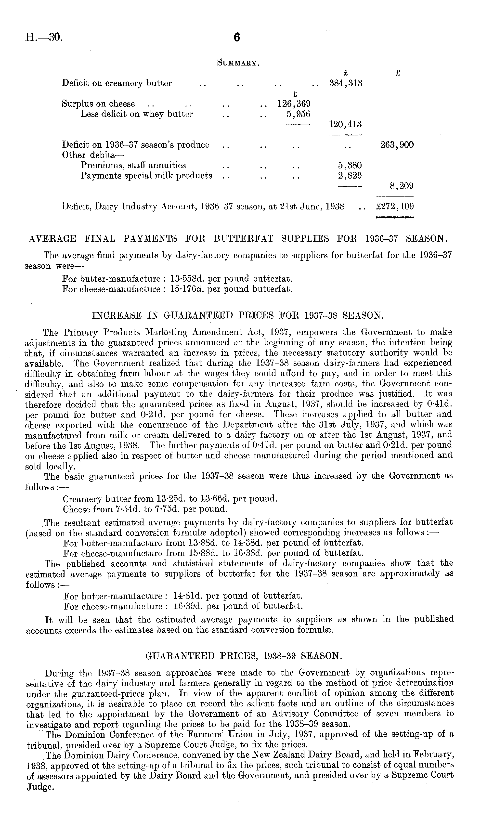 Summary. £ £ Deficit on creamery butter .. .. .. .. 384,313 £ Surplus on cheese .. .. .. .. 126,369 Less deficit on whey butter .. .. 5,956 120,413 Deficit on 1936-37 season's produce .. .. .. .. 263,900 Other debits — Premiums, stall annuities .. .. .. 5,380 Payments special milk products .. .. .. 2,829 8,209 Deficit, Dairy Industry Account, 1936-37 season, at 21st June, 1938 .. £272,109 AVERAGE FINAL PAYMENTS FOR BUTTERFAT SUPPLIES FOR 1936-37 SEASON. The average final payments by dairy-factory companies to suppliers for butterfat for the 1936-37 season were — For butter-manufacture : 13-558 d. per pound butterfat. For cheese-manufacture : 15-176 d. per pound butterfat. INCREASE IN GUARANTEED PRICES FOR 1937-38 SEASON. The Primary Products Marketing Amendment Act, 1937, empowers the Government to make adjustments in the guaranteed prices announced at the beginning of any season, the intention being that, if circumstances warranted an increase in prices, the necessary statutory authority would be available. The Government realized that during the 1937-38 season dairy-farmers had experienced difficulty in obtaining farm labour at the wages they could afford to pay, and in order to meet this difficulty, and also to make some compensation for any increased farm costs, the Government considered that an additional payment to the dairy-farmers for their produce was justified. It was therefore decided that the guaranteed prices as fixed in August, 1937, should be increased by 0-41 d. per pound for butter and 0-21 d. per pound for cheese. These increases applied to all butter and cheese exported with the. concurrence of the Department after the 31st July, 1937, and which was manufactured from milk or cream delivered to a dairy factory on or after the Ist August, 1937, and before the Ist August, 1938. The further payments of 0-41 d. per pound on butter and 0-21 d. per pound on cheese applied also in respect of butter and cheese manufactured during the period mentioned and sold locally. The basic guaranteed prices for the 1937-38 season were thus increased by the Government as follows:— Creamery butter from 13-25 d. to 13-66 d. per pound. Cheese from 7-54 d. to 7-75 d. per pound. The resultant estimated average payments by dairy-factory companies to suppliers for butterfat (based on the standard conversion formulae adopted) showed corresponding increases as follows : —■ For butter-manufacture from 13-88 d. to 14-38 d. per pound of butterfat. For cheese-manufacture from 15-88 d. to 16-38 d. per pound of butterfat. The published accounts and statistical statements of dairy-factory companies show that the estimated average payments to suppliers of butterfat for the 1937-38 season are approximately as follows:— For butter-manufacture : 14-81 d. per pound of butterfat. For cheese-manufacture : 16-39 d. per pound of butterfat. It will be seen that the estimated average payments to suppliers as shown in the published accounts exceeds the estimates based on the standard conversion formulae. GUARANTEED PRICES, 1938-39 SEASON. During the 1937-38 season approaches were made to the Government by orgariizations representative of the dairy industry and farmers generally in regard to the method of price determination under the guaranteed-prices plan. In view of the apparent conflict of opinion among the different organizations, it is desirable to place on record the salient facts and an outline of the circumstances that led to the appointment by the Government of an Advisory Committee of seven members to investigate and report regarding the prices to be paid for the 1938-39 season. The Dominion Conference of the Farmers' Union in July, 1937, approved of the setting-up of a tribunal, presided over by a Supreme Court Judge, to fix the prices. The Dominion Dairy Conference, convened by the New Zealand Dairy Board, and held in February, 1938, approved of the setting-up of a tribunal to fix the prices, such tribunal to consist of equal numbers of assessors appointed by the Dairy Board and the Government, and presided over by a Supreme Court Judge.