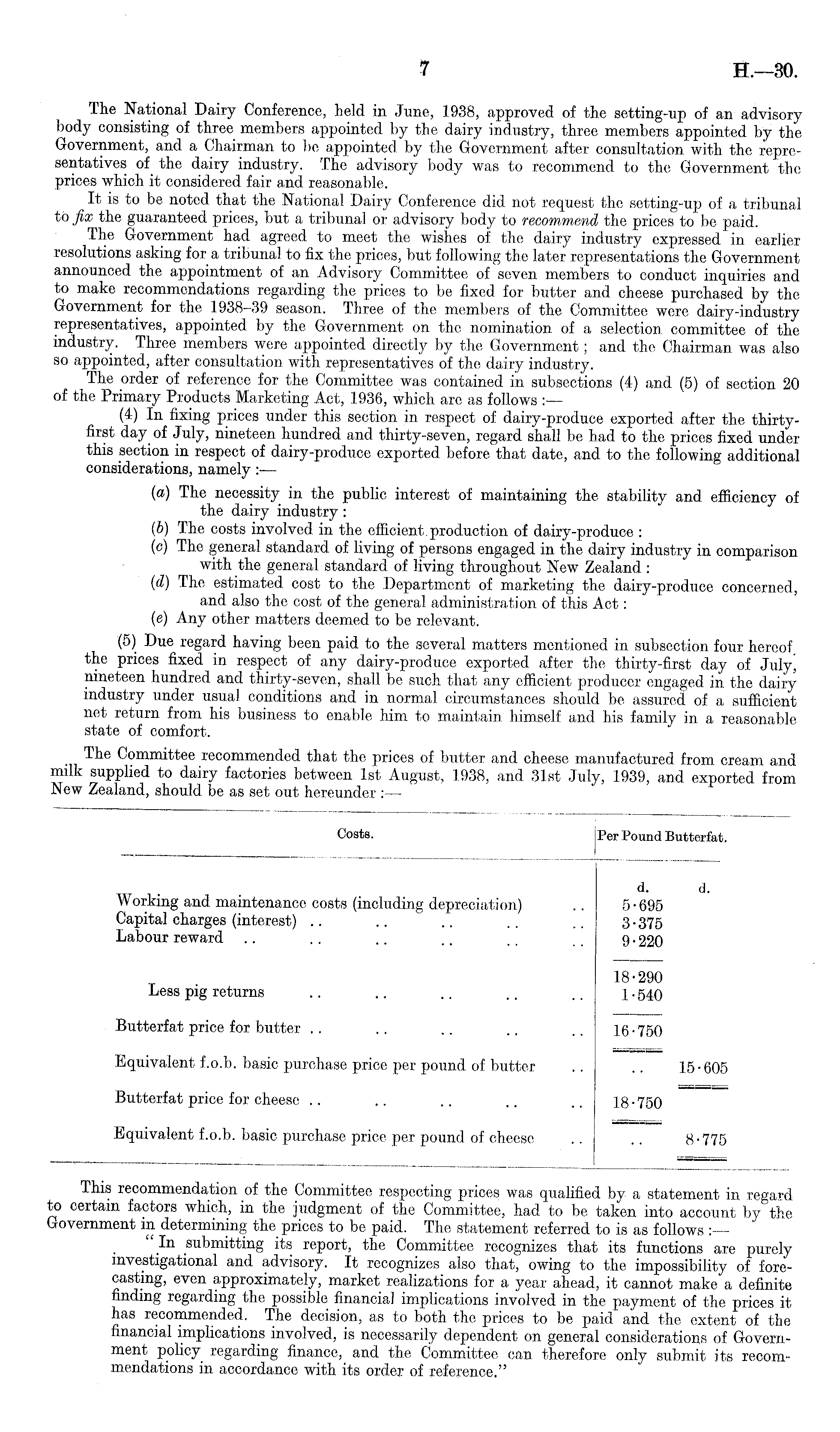 The National Dairy Conference, held in June, 1938, approved of the setting-up of an advisory body consisting of three members appointed by the dairy industry, three members appointed by the Government, and a Chairman to be appointed by the Government after consultation with the representatives of the dairy industry. The advisory body was to recommend to the Government the prices which it considered fair and reasonable. It is to be noted that the National Dairy Conference did not request the setting-up of a tribunal to fix the guaranteed prices, but a tribunal or advisory body to recommend the prices to be paid. Ihe Government had agreed to meet the wishes of the dairy industry expressed in earlier resolutions asking for a tribunal to fix the prices, but following the later representations the Government announced the appointment of an Advisory Committee of seven members to conduct inquiries and to make recommendations regarding the prices to be fixed for butter and cheese purchased by the Government for the 1938-39 season. Three of the members of the Committee were dairy-industry representatives, appointed by the Government on the nomination of a selection committee of the industry. Three members were appointed directly by the Government; and the Chairman was also so appointed, after consultation with representatives of the dairy industry. The order of reference for the Committee was contained in subsections (4) and (5) of section 20 of the Primary Products Marketing Act, 1936, which are as follows — (4) In fixing prices under this section in respect of dairy-produce exported after the thirtyfirst day of July, nineteen hundred and thirty-seven, regard shall be had to the prices fixed under this section in respect of dairy-produce exported before that date, and to the following additional considerations, namely:— (a) The necessity in the public interest of maintaining the stability and efficiency of the dairy industry : (b) The costs involved in the efficient, production of dairy-produce : (c) The general standard of living of persons engaged in the dairy industry in comparison with the general standard of living throughout New Zealand : (d) The estimated cost to the Department of marketing the dairy-produce concerned, and also the cost of the general administration of this Act: (e) Any other matters deemed to be relevant. (5) Due regard having been paid to the several matters mentioned in subsection four hereof, the prices fixed in respect of any dairy-produce exported after the thirty-first day of Julyj nineteen hundred and thirty-seven, shall be such that any efficient producer engaged in the dairy industry under usual conditions and in normal circumstances should be assured of a sufficient net return from his business to enable him to maintain himself and his family in a reasonable state of comfort. The Committee recommended that the prices of butter and cheese manufactured from cream and milk supplied to dairy factories between Ist August, 1938, and 31st July, 1939, and exported from New Zealand, should be as set out hereunder :—
