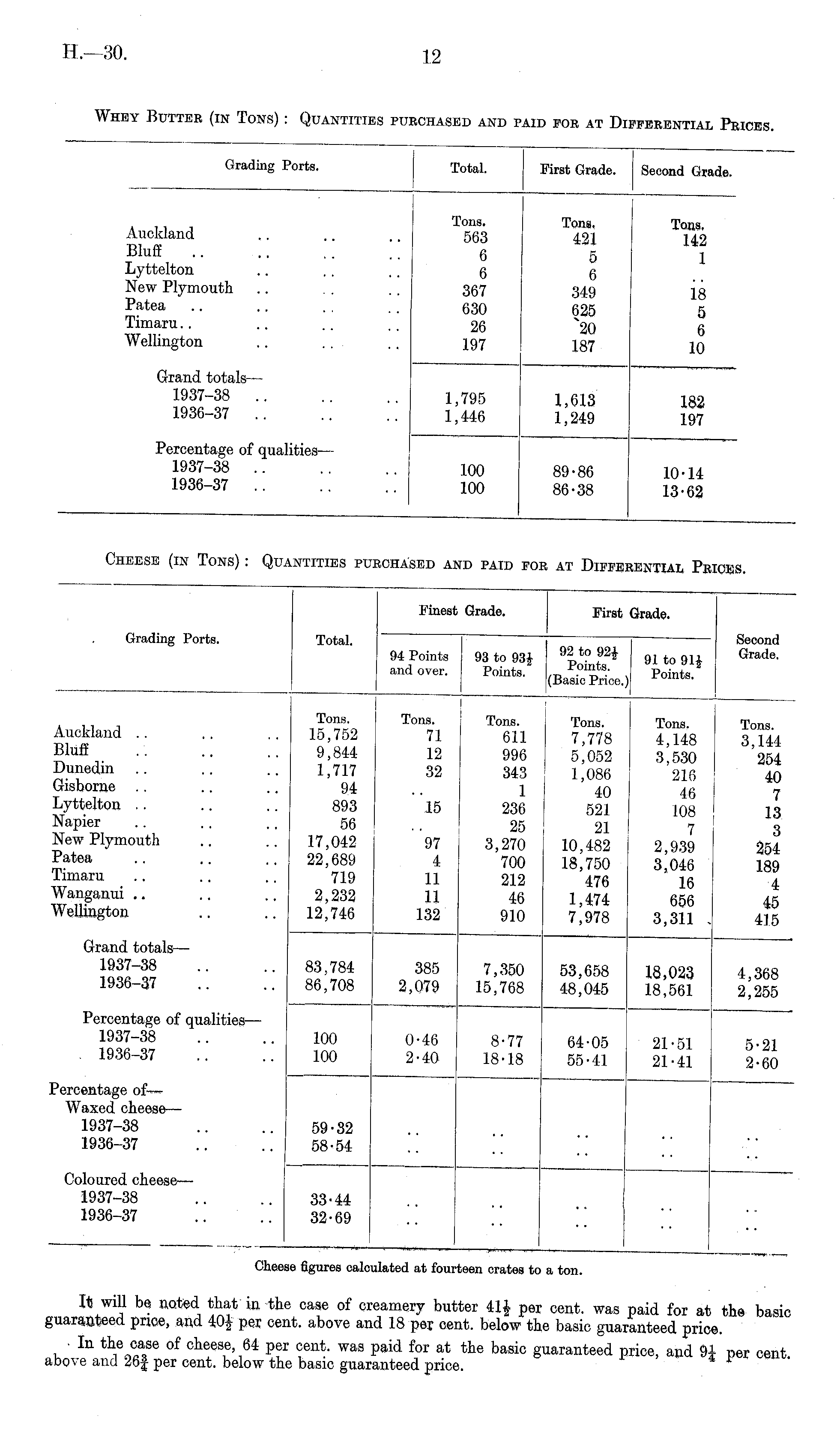 Grading Ports. Total. First Grade. Second Grade. Tons. Tons. Tons. Auckland .. .. .. 563 421 142 Bluff 6 5 1 Lyttelton .. . . . . g g New Plymouth .. . . .. 367 349 18 Pat ea .. .. . . .. 630 625 5 Timaru.. .. .. .. 26 6 Wellington .. .. 197 187 10 Grand totals— 1937-38 .. .. 1,795 1,613 182 1936-37 .. .. .. l ; 446 1 j 249 197 Percentage of qualities— 1937-38 .. .. .. 100 89-86 10-14 1936-37 .. .. 100 86-38 13-62