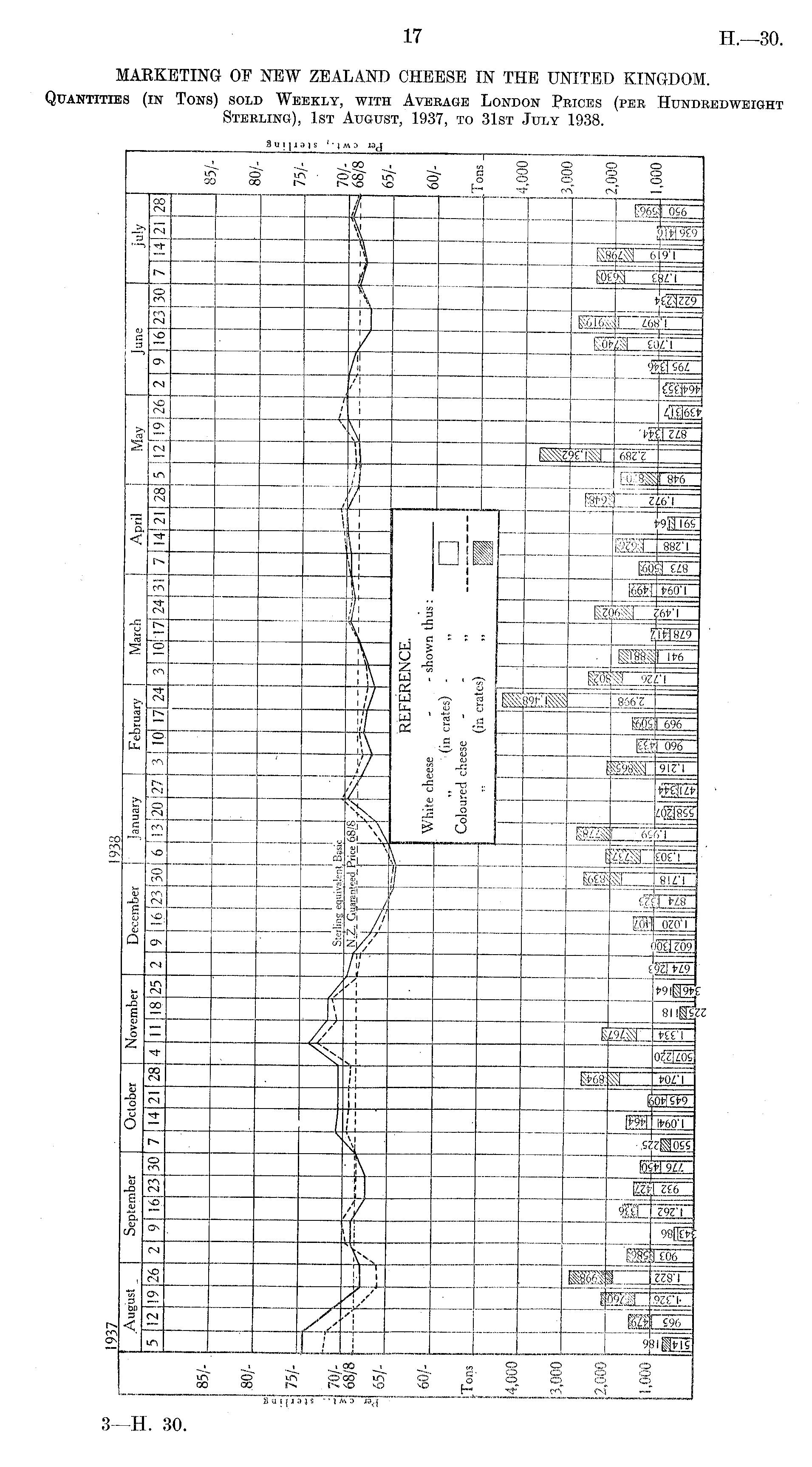 MARKETING OF NEW ZEALAND CHEESE IN THE UNITED KINGDOM. Quantities (in Tons) sold Weekly, with Average London Prices (per Hundredweight Sterling), 1st August, 1937, to 31st July 1938.