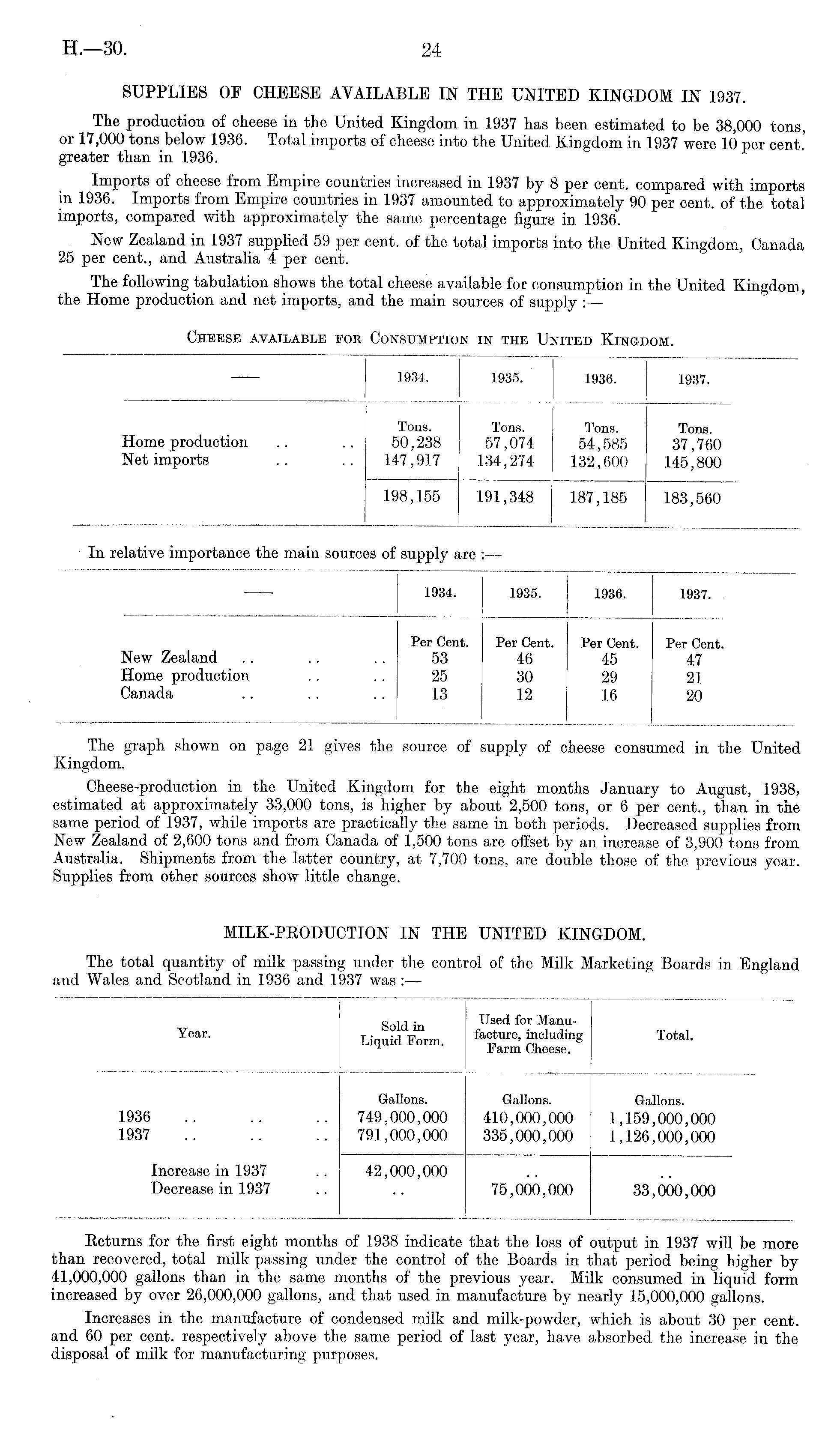 The graph shown on page 21 gives the source of supply of cheese consumed in the United Kingdom. Cheese-production in the United Kingdom for the eight months January to August, 1938, estimated at approximately 33,000 tons, is higher by about 2,500 tons, or 6 per cent., than in the same period of 1937, while imports are practically the same in both periods. Decreased supplies from New Zealand of 2,600 tons and from Canada of 1,500 tons are offset by an increase of 3,900 tons from Australia. Shipments from the latter country, at 7,700 tons, are double those of the previous year. Supplies from other sources show little change. MILK-PRODUCTION IN THE UNITED KINGDOM. The total quantity of milk passing under the control of the Milk Marketing Boards in England and Wales and Scotland in 1936 and 1937 was :—•