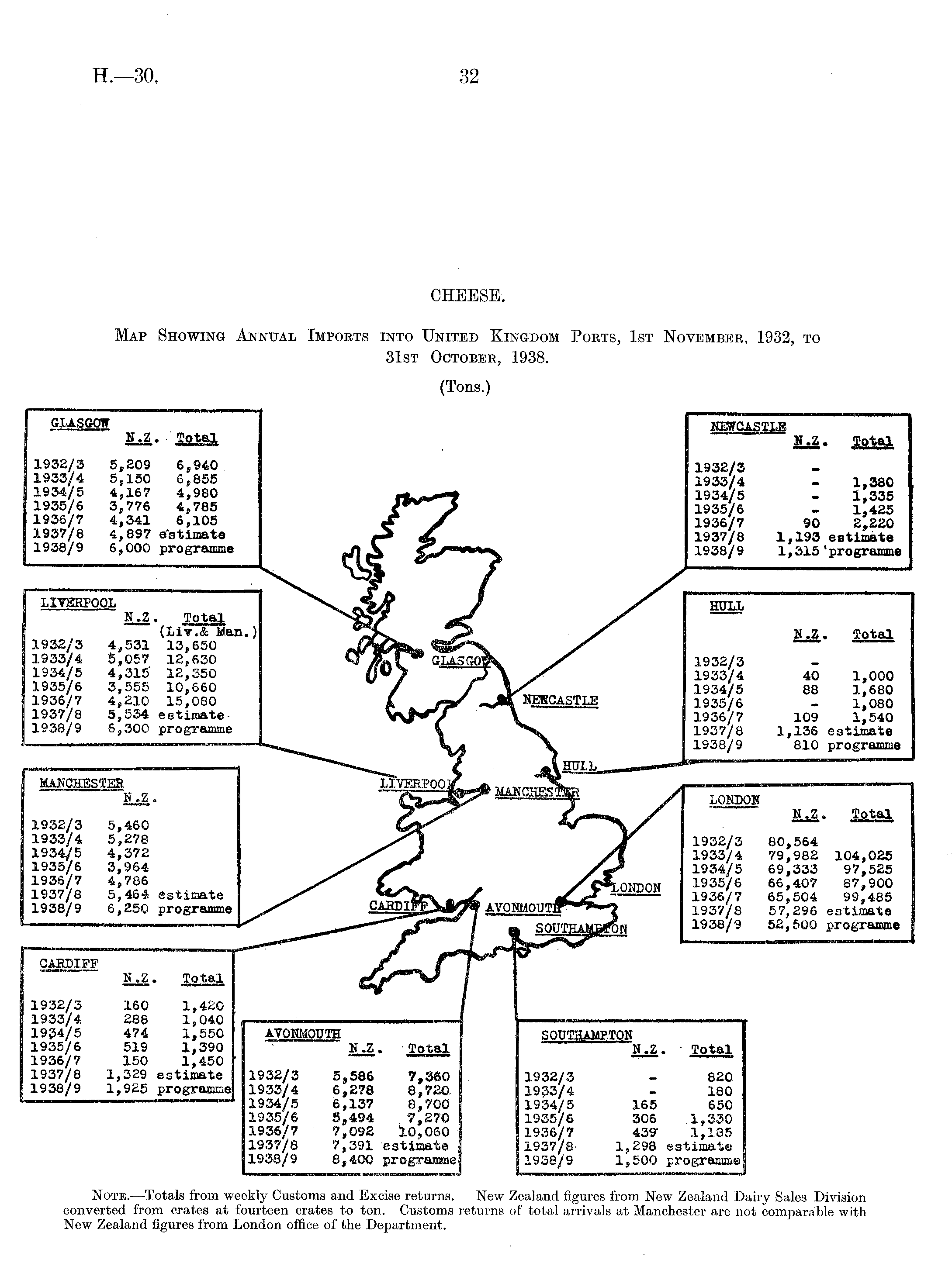 Note. —Totals from weekly Customs and Excise returns. New Zealand figures from Now Zealand Dairy Sale 3 Division converted from crates at fourteen crates to ton. Customs returns of total arrivals at Manchester are not comparable with New Zealand figures from London office of the Department.
