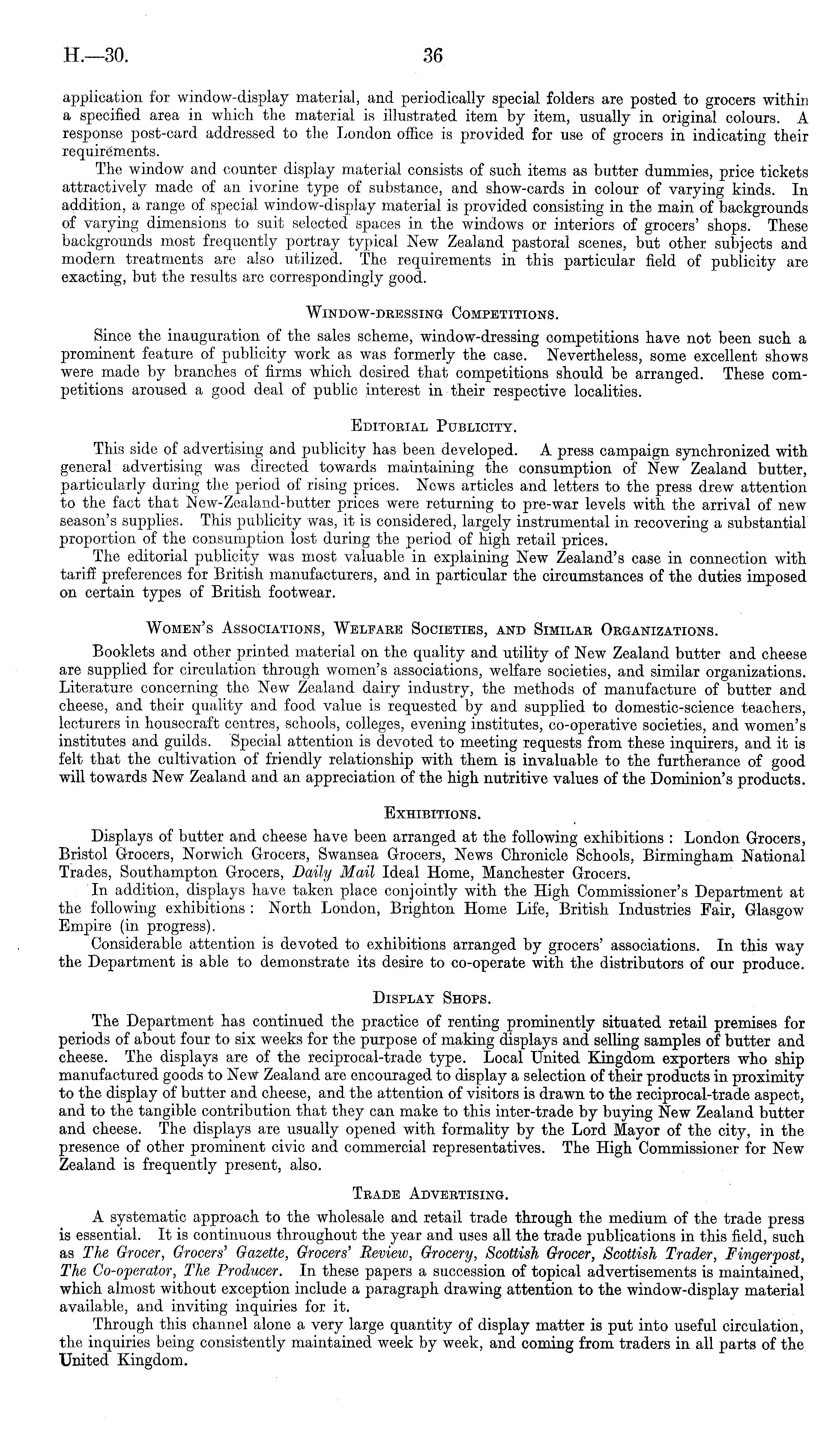 application for window-display material, and periodically special folders are posted to grocers within a specified area in which the material is illustrated item by item, usually in original colours. A response post-card addressed to the London office is provided for use of grocers in indicating their requirements. The window and counter display material consists of such items as butter dummies, price tickets attractively made of an ivorine type of substance, and show-cards in colour of varying kinds. In addition, a range of special window-display material is provided consisting in the main of backgrounds of varying dimensions to suit selected spaces in the windows or interiors of grocers' shops. These backgrounds most frequently portray typical New Zealand pastoral scenes, but other subjects and modern treatments are also utilized. The requirements in this particular field of publicity are exacting, but the results are correspondingly good. Window-dressing Competitions. Since the inauguration of the sales scheme, window-dressing competitions have not been such a prominent feature of publicity work as was formerly the case. Nevertheless, some excellent shows were made by branches of firms which desired that competitions should be arranged. These competitions aroused a good deal of public interest in their respective localities. Editorial Publicity. This side of advertising and publicity lias been developed. A press campaign synchronized with general advertising was directed towards maintaining the consumption of New Zealand butter, particularly during the period of rising prices. News articles and letters to the press drew attention to the fact that New-Zealand-butter rices were returning to pre-war levels with the arrival of new season's supplies. This publicity was, it is considered, largely instrumental in recovering a substantial proportion of the consumption lost during the period of high retail prices. The editorial publicity was most valuable in explaining New Zealand's case in connection with tariff preferences for British manufacturers, and in particular the circumstances of the duties imposed on certain types of British footwear. Women's Associations, Welfare Societies, and Similar Organizations. Booklets and other printed material on the quality and utility of New Zealand butter and cheese are supplied for circulation through women's associations, welfare societies, and similar organizations. Literature concerning the New Zealand dairy industry, the methods of manufacture of butter and cheese, and their quality and food value is requested by and supplied to domestic-science teachers, lecturers in housecraft centres, schools, colleges, evening institutes, co-operative societies, and women's institutes and guilds. Special attention is devoted to meeting requests from these inquirers, and it is felt that the cultivation of friendly relationship with them is invaluable to the furtherance of good will towards New Zealand and an appreciation of the high nutritive values of the Dominion's products. Exhibitions. Displays of butter and cheese have been arranged at the following exhibitions : London Grocers, Bristol Grocers, Norwich Grocers, Swansea Grocers, News Chronicle Schools, Birmingham National Trades, Southampton Grocers, Daily Mail Ideal Home, Manchester Grocers. In addition, displays have taken place conjointly with the High Commissioner's Department at the following exhibitions : North London, Brighton Home Life, British Industries Fair, Glasgow Empire (in progress). Considerable attention is devoted to exhibitions arranged by grocers' associations. In this way the Department is able to demonstrate its desire to co-operate with the distributors of our produce. Display Shops. The Department has continued the practice of renting prominently situated retail premises for periods of about four to six weeks for the purpose of making displays and selling samples of butter and cheese. The displays are of the reciprocal-trade type. Local United Kingdom exporters who ship manufactured goods to New Zealand arc cncouraged to display a selection of their products in proximity to the display of butter and cheese, and the attention of visitors is drawn to the reciprocal-trade aspect, and to the tangible contribution that they can make to this inter-trade by buying New Zealand butter and cheese. The displays are usually opened with formality by the Lord Mayor of the city, in the presence of other prominent civic and commercial representatives. The High Commissioner for New Zealand is frequently present, also. Trade Advertising. A systematic approach to the wholesale and retail trade through the medium of the trade press is essential. It is continuous throughout the year and uses all the trade publications in this field, such as The Grocer, Grocers' Gazette, Grocers' Review, Grocery, Scottish Grocer, Scottish Trader, Fingerpost, The Co-operator, The Producer. In these papers a succession of topical advertisements is maintained, which almost without exception include a paragraph drawing attention to the window-display material available, and inviting inquiries for it. Through this channel alone a very large quantity of display matter is put into useful circulation, the inquiries being consistently maintained week by week, and coming from traders in all parts of the United Kingdom.