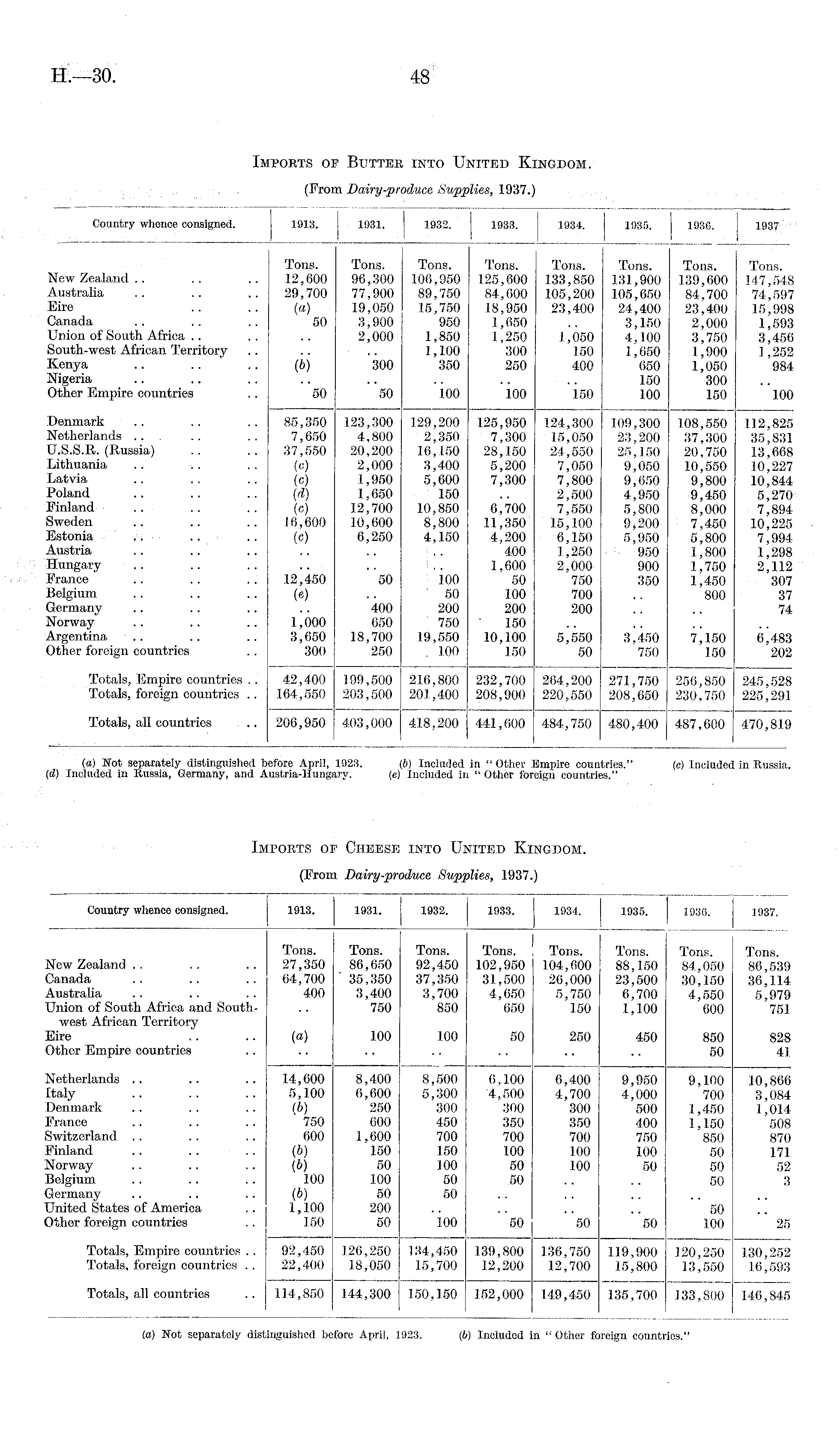 (From Dairy-produce Supplies, 1937.) Country whence consigned. 1918. 1931. 1932. 1933. 1984. I 1935. 193G. ] 1937 L ' ] _M_ Tone. Tons. Tons. Tons. Tons. Tons. Tons. Tons. New Zealand.. .. .. 12,600 96,300 106,950 125,600 133,850 131,900 139,600 147,548 Australia .. .. .. 29,700 77,900 89,750 84,600 105,200 105,650 84,700 74,597 Eire .. .. (a) 19,050 15,750 18,950 23,400 24,400 23,400 15,998 Canada .. .. .. 50 3,900 950 1,650 .. 3,150 2,000 1,593 Union of South Africa .. .. .. 2,000 1,850 1,250 1,050 4,100 3,750 3,456 South-west African Territory .. .. .. 1,100 300 150 1,650 1,900 1,252 Kenya .. .. .. (b) 300 350 250 400 650 1,050 984 Nigeria .. .. .. .. .. .. .. .. 150 300 Other Empire countries .. 50 50 100 100 150 100 150 100 Denmark .. .. .. 85,350 123,300 129,200 125,950 124,300 109,300 108,550 112,825 Netherlands .. .. .. 7,650 4,800 2,350 7,300 15,050 23,200 37,300 35,831 U.S.S.R. (Russia) .. .. 37,550 20,200 16,150 28,150 24,550 25,150 20,750 13,668 Lithuania .. .. (c) 2,000 3,400 5,200 7,050 9,050 10,550 10,227 Latvia .. .. .. (c) 1,950 5,600 7,300 7,800 9,650 9,800 10,844 Poland .. .. .. (A) 1,650 150 .. 2,500 4,950 9,450 5,270 Finland .. .. .. (c) 1.2,700 10,850 6,700 7,550 5,800 8,000 7,894 Sweden .. .. .. 16,600 10,600 8,800 11,350 15,100 9,200 7,450 10,225 Estonia .. .. .. (c) 6,250 4,150 4,200 6,150 5,950 5,800 7,994 Austria .. .. .. .. .. .. 400 1,250 950 1,800 1,298 Hungary .. .. .. .. .. .. 1,600 2,000 900 1,750 2,112 France .. .. .. 12,450 50 100 50 750 350 1,450 307 Belgium . . .. .. (e) .. 50 100 700 .. 800 37 Germany .. .. .. .. 400 200 200 200 .. .. 74 Norway .. .. .. 1,000 650 750 150 Argentina .. .. .. 3,650 18,700 19,550 10,100 5,550 3,450 7,150 6,483 Other foreign countries .. 300 250 ; 100 150 50 750 150 202 Totals, Empire countries .. 42,400 199,500 216,800 232,700 264,200 271,750 256,850 245,528 Totals, foreign countries .. 164,550 203,500 20.1,400 208,900 220,550 208,650 230,750 225,291 Totals, all countries , 206,950 403,000 418,200 441,600 484,750 480,400 487,600 470,819 (a) Not separately distinguished before April, 1923. (b) Included in " Other Empire countries." (e) Included in Russia. (d) Included in Russia, Germany, and Austria-Hungary. (e) Included in " Other foreign countries."
