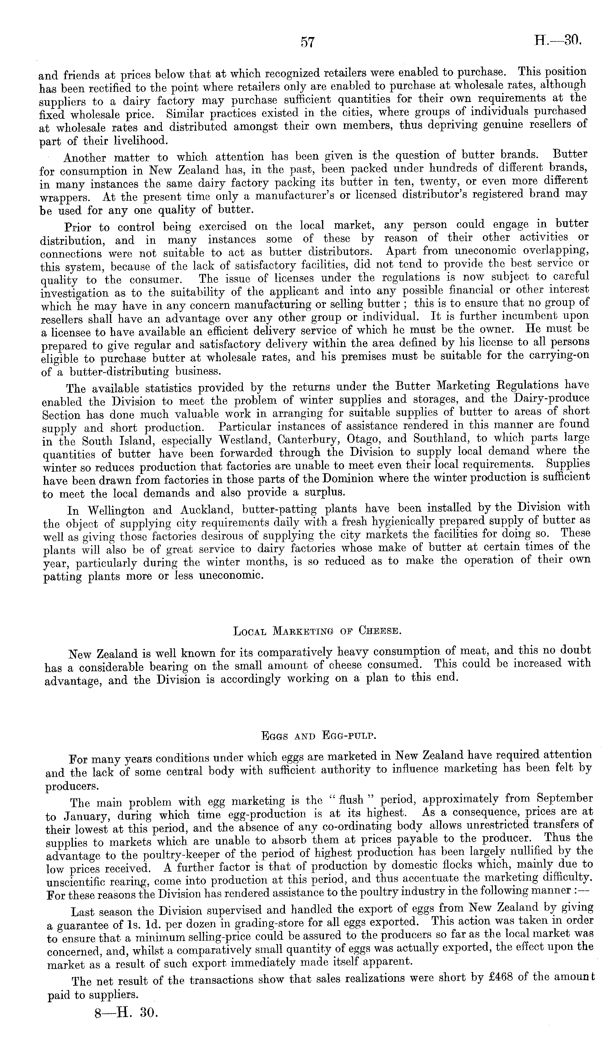 and friends at prices below that at which recognized retailers were enabled to purchase. This position has been rectified to the point where retailers only are enabled to purchase at wholesale rates, although suppliers to a dairy factory may purchase sufficient quantities for their own requirements at the fixed wholesale price. Similar practices existed in the cities, where groups of individuals purchased at wholesale rates and distributed amongst their own members, thus depriving genuine resellers of part of their livelihood. Another matter to which attention has been given is the question of butter brands. Butter for consumption in New Zealand has, in the past, been packed under hundreds of different brands, in many instances the same dairy factory packing its butter in ten, twenty, or even more different wrappers. At the present time only a manufacturer's or licensed distributor's registered brand may be used for any one quality of butter. Prior to control being exercised on the local market, any person could engage in butter distribution, and in many instances some of these by reason of their other or connections were not suitable to act as butter distributors. Apart from uneconomic overlapping, this system, because of the lack of satisfactory facilities, did not tend to provide the best service or quality to the consumer. The issue of licenses under the regulations is now subject to careful investigation as to the suitability of the applicant and into any possible financial or other interest which he may have in any concern manufacturing or selling butter ; this is to ensure that no group oi resellers shall have an advantage over any other group or individual. It is further incumbent upon a licensee to have available an efficient delivery service of which he must be the owner. He must be prepared to give regular and satisfactory delivery within the area defined by his license to all persons eligible to purchase butter at wholesale rates, and his premises must be suitable for the carrying-on of a butter-distributing business. The available statistics provided by the returns under the Butter Marketing Regulations have enabled the Division to meet the problem of winter supplies and storages, and the Dairy-produce Section has done much valuable work in arranging for suitable supplies of butter to areas of short supply and short production. Particular instances of assistance rendered in this manner are found in the South Island, especially Westland, Canterbury, Otago, and Southland, to which parts large quantities of butter have been forwarded through the Division to supply local demand where the winter so reduces production that factories are unable to meet even their local requirements. Supplies have been drawn from factories in those parts of the Dominion where the winter production is sufficient to meet the local demands and also provide a surplus. In Wellington and Auckland, butter-patting plants have been installed by the Division with the object of supplying city requirements daily with a fresh hygienically prepared supply of butter as well as giving those factories desirous of supplying the city markets the facilities for doing so. These plants will also be of great service to dairy factories whose make of butter at certain times of the year, particularly during the winter months, is so reduced as to make the operation of their own patting plants more or less uneconomic. Local Marketing op Cheese. New Zealand is well known for its comparatively heavy consumption of meat, and this no doubt has a considerable bearing on the small amount of cheese consumed. This could be increased with advantage, and the Division is accordingly working on a plan to this end. Eggs and Egg-pulp. For many years conditions under which eggs are marketed in New Zealand have required attention and the lack of some central body with sufficient authority to influence marketing has been felt by producers. The main problem with egg marketing is the " flush " period, approximately from September to January, during which time egg-production is at its highest. As a consequence, prices are at their lowest at this period, and the absence of any co-ordinating body allows unrestricted transfers of supplies to markets which are unable to absorb them at prices payable to the producer. Thus the advantage to the poultrv-keeper of the period of highest production has been largely nullified by the low prices received. A further factor is that of production by domestic flocks which, mainly due to unscientific rearing, come into production at this period, and thus accentuate the marketing difficulty. For these reasons the Division has rendered assistance to the poultry industry in the following manner Last season the Division supervised and handled the export of eggs from New Zealand by giving a guarantee of Is. Id. per dozen in grading-store for all eggs exported. This action was taken m order to ensure that a minimum selling-price could be assured to the producers so far as the local market was concerned, and, whilst a comparatively small quantity of eggs was actually exported, the effect upon the market as a result of such export immediately made itself apparent. The net result of the transactions show that sales realizations were short by £468 of the amount paid to suppliers.