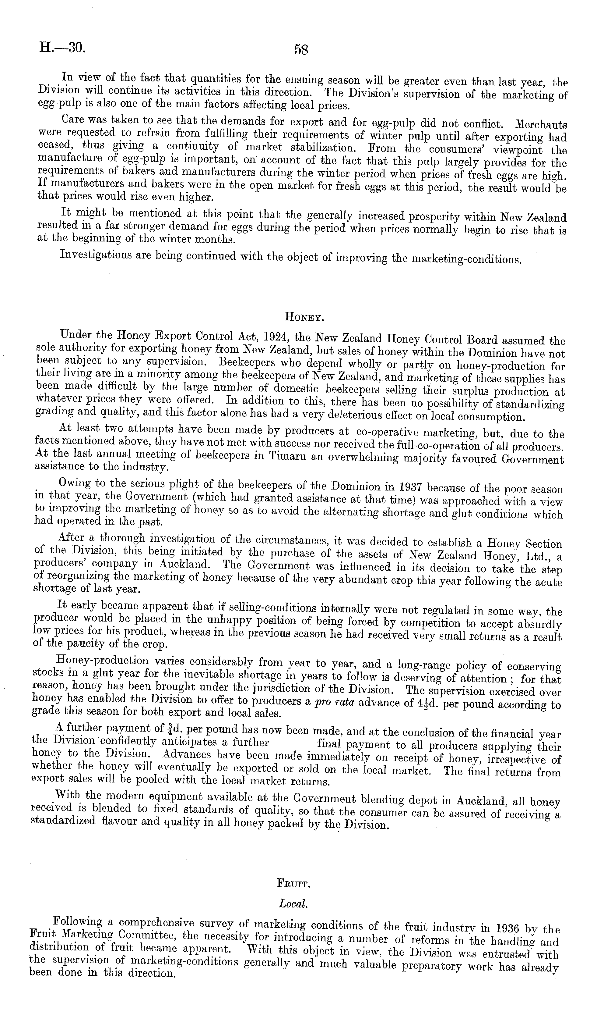 , y iew the fact, that quantities for the ensuing season will be greater even than last year, the Division will continue its activities in this direction. The Division's supervision of the marketing of egg-pulp is also one of the main factors affecting local prices. Care was taken to see that the demands for export and for egg-pulp did not conflict. Merchants were requested to refrain from fulfilling their requirements of winter pulp until after exporting had ceased, thus giving a continuity of market stabilization. From the consumers' viewpoint the manufacture of egg-pulp is important, on account of the fact that this pulp largely provides for the requirements of bakers and manufacturers during the winter period when prices of fresh eggs are hio'h. If manufacturers and bakers were in the open market for fresh eggs at this period, the result would be that prices would rise even higher. It might be mentioned at this point that the generally increased prosperity within New Zealand resulted in a far stronger demand for eggs during the period when prices normally begin to rise that is at the beginning of the winter months. Investigations are being continued with the object of improving the marketing-conditions. Honey. Under the Honey Export Control Act, 1924, the New Zealand Honey Control Board assumed the sole authority for exporting honey from New Zealand, but sales of honey within the Dominion have not been subject to any supervision. Beekeepers who depend wholly or partly on honey-production for their living are m a minority among the beekeepers of New Zealand, and marketing of these supplies has been made difficult by the large number of domestic beekeepers selling their surplus production at whatever prices they were offered. In addition to this, there has been no possibility of standardizing grading and quality, and this factor alone has had a very deleterious effect on local consumption. At least two attempts have been made by producers at co-operative marketing, but, due to the tacts mentioned above, they have not met with success nor received the full-co-operation of all producers At the last annual meeting of beekeepers in Timaru an overwhelming majority favoured Government assistance to the industry. . °7 mg to t he serious plight the beekeepers of the Dominion in 1937 because of the poor season m that year, the Government (which had granted assistance at that time) was approached with a view to improving the marketing of honey so as to avoid the alternating shortage and glut conditions which had operated in the past. After a thorough investigation of the circumstances, it was decided to establish a Honey Section of the Division, this being initiated by the purchase of the assets of New Zealand Honey Ltd. a producers company in Auckland. The Government was influenced in its decision to take 'the step ot reorganizing the marketing of honey because of the very abundant crop this year following the acute shortage of last year. 6 It early became apparent that if selling-conditions internally were not regulated in some way, the producer would be placed in the unhappy position of being forced by competition to accept absurdly low prices for his product, whereas in the previous season he had received very small returns as a result ot the paucity of the crop. Honey-production varies considerably from year to year, and a long-range policy of conserving stocks m a glut year for the inevitable shortage in years to follow is deserving of attention ; for that reason honey has been brought under the jurisdiction of the Division. The supervision exercised over honey has enabled the Division to offer to producers a pro rata advance of Ud. per pound according to grade this season for both export and local sales. " 5 ~ further Parent of fd. per pound has now been made, and at the conclusion of the financial year the Division confidently anticipates a further final payment to all producers supplying their honey to the Division Advances have been made immediately on receipt of honey, irrespective of whether the honey will eventually be exported or sold on the local market. The final returns from export sales will be pooled with the local market returns. With the modern equipment available at the Government blending depot in Auckland, all honey received is blended to fixed standards of quality, so that the consumer can be assured of receiving a standardized flavour and quality m all honey packed by the Division. Fruit. Local. Following a comprehensive survey of marketing conditions of the fruit industry in 1936 by the Frmt Marketing Committee, the necessity for introducing a number of reforms in the handling and distribution of fruit became apparent. With this object in view, the Division was entrusted w£h fiT.rr^dTS" 8 ' 00 "^ 0 ™ S " erally ™ lU » We »T work h„ already