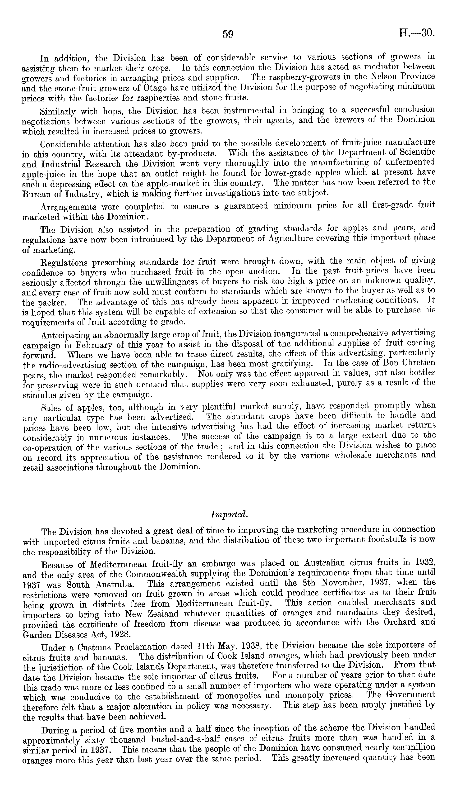In addition, the Division has been of considerable service to various sections of growers in assisting them to market thr ; r crops. In this connection the Division has acted as mediator between growers and factories in arranging prices and supplies. The raspberry-growers in the Nelson Province and the stone-fruit growers of Otago have utilized the Division for the purpose of negotiating minimum prices with the factories for raspberries and stone-fruits. Similarly with hops, the Division has been instrumental in bringing to a successful conclusion negotiations between various sections of the growers, their agents, and the brewers of the Dominion which resulted in increased prices to growers. Considerable attention has also been paid to the possible development of fruit-juice manufacture in this country, with its attendant by-products. With the assistance of the Department of Scientific and Industrial Research the Division went very thoroughly into the manufacturing of unfermented apple-juice in the hope that an outlet might be found for lower-grade apples which at present have such a depressing effect on the apple-market in this country. The matter has now been referred to the Bureau of Industry, which is making further investigations into the subject. Arrangements were completed to ensure a guaranteed minimum price for all first-grade fruit marketed within the Dominion. The Division also assisted in the preparation of grading standards for apples and pears, and regulations have now been introduced by the Department of Agriculture covering this important phase of marketing. Regulations prescribing standards for fruit were brought down, with the main object of giving confidence to buyers who purchased fruit in the open auction. In the past fruit-prices have been seriously affected through the unwillingness of buyers to risk too high a price on an unknown quality, and every case of fruit now sold must conform to standards which are known to the buyer as well as to the packer. The advantage of this has already been apparent in improved marketing conditions. It is hoped that this system will be capable of extension so that the consumer will be able to purchase his requirements of fruit according to grade. Anticipating an abnormally large crop of fruit, the Division inaugurated a comprehensive advertising campaign in February of this year to assist in the disposal of the additional supplies of fruit coming forward. Where we have been able to trace direct results, the effect of this advertising, particularly the radio-advertising section of the campaign, has been most gratifying. In the case of Bon Chretien pears, the market responded remarkably. Not only was the effect apparent in values, but also bottles for preserving were in such demand that supplies were very soon exhausted, purely as a result of the stimulus given by the campaign. Sales of apples, too, although in very plentiful market supply, have responded promptly when any particular type has been advertised. The abundant crops have been difficult to handle and prices have been low, but the intensive advertising has had the effect of increasing market returns considerably in numerous instances. The success of the campaign is to a large extent due to the co-operation of the various sections of the trade ; and in this connection the Division wishes to place on record its appreciation of the assistance rendered to it by the various wholesale merchants and retail associations throughout the Dominion. Imported. The Division has devoted a great deal of time to improving the marketing procedure in connection with imported citrus fruits and bananas, and the distribution of these two important foodstuffs is now the responsibility of the Division. Because of Mediterranean fruit-fly an embargo was placed 011 Australian citrus fruits in 1932, and the only area of the Commonwealth supplying the Dominion's requirements from that time ixntil 1937 was South Australia. This arrangement existed until the Bth November, 1937, when the restrictions were removed on fruit grown in areas which could produce certificates as to their fruit being grown in districts free from Mediterranean fruit-fly. This action enabled merchants and importers to bring into New Zealand whatever quantities of oranges and mandarins they desired, provided the certificate of freedom from disease was produced in accordance with the Orchard and Garden Diseases Act, 1928. Under a Customs Proclamation dated 11th May, 1938, the Division became the sole importers of citrus fruits and bananas. The distribution of Cook Island oranges, which had previously been under the jurisdiction of the Cook Islands Department, was therefore transferred to the Division. From that date the Division became the sole importer of citrus fruits. For a number of years prior to that date this trade was more or less confined to a small number of importers who were operating under a system which was conducive to the establishment of monopolies and monopoly prices. The Government therefore felt that a major alteration in policy was necessary. This step has been amply justified by the results that have been achieved. During a period of five months and a half since the inception of the scheme the Division handled approximately sixty thousand bushel-and-a-half cases of citrus fruits more than was handled in a similar period in 1937. This means that the people of the Dominion have consumed nearly ten million oranges more this year than last year over the same period. This greatly increased quantity has been