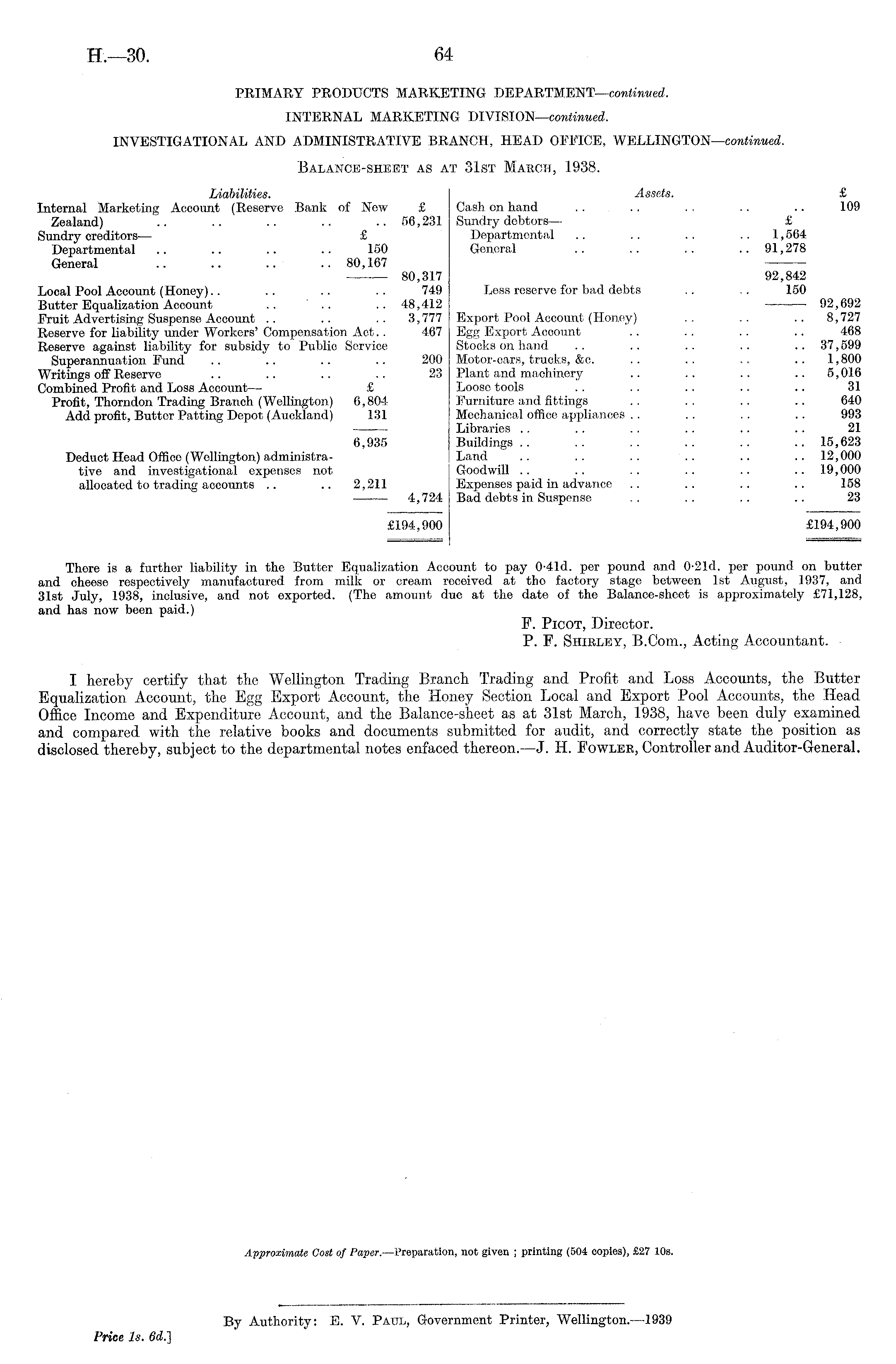 PRIMARY PRODUCTS MARKETING DEPARTMENT- —continued. INTERNAL MARKETING DlVlSlON—continued. INVESTIGATIONAL AND ADMINISTRATIVE BRANCH, HEAD OFFICE, WELLlNGTON—continued. Balance-sheet as at 31st March, 1938. Liabilities. Assets. £ Internal Marketing Account (Reserve Bank of New £ Cash on hand . . . . . , .. .. 109 Zealand) .. .. .. .. .. 56,231 Sundry debtors— £ Sundry creditors — £ Departmental .. .. .. .. 1,564 Departmental .. .. .. .. 150 General .. .. .. .. 91,278 General .. .. .. .. 80,167 80,317 92,842 Local Pool Account (Honey).. .. .. .. 749 Less reserve for bad debts .. . . 150 Butter Equalization Account .. .. .. 48,412 92,692 Fruit Advertising Suspense Account .. .. .. 3,777 Export Pool Account (Honey) .. .. .. 8,727 Reserve for liability under Workers' Compensation Act.. 467 Egg Export Account .. .. .. .. 468 Reserve against liability for subsidy to Publio Service Stocks on hand .. .. .. . . 37,599 Superannuation Fund .. .. .. .. 200 Motor-cars, trucks, &c. .. .. .. .. 1,800 Writings off Reserve .. .. .. .. 23 Plant and machinery .. .. .. .. 5,016 Combined Profit and Loss Account — £ Loose tools .. .. .. .. .. 31 Profit, Thorndon Trading Branch (Wellington) 6,804 Furniture and fittings .. .. .. .. 640 Add profit, Butter Patting Depot (Auckland) 131 Mechanical office appliances .. .. .. .. 993 Libraries .. .. .. .. .. .. 21 6,935 Buildings .. .. .. .. .. .. 15,623 Deduct Head Office (Wellington) administra- Land .. .. .. .. .. .. 12,000 tive and investigational expenses not Goodwill .. .. .. .. .. .. 19,000 allocated to trading accounts .. .. 2,211 Expenses paid in advance .. .. .. .. 158 4,724 Bad debts in Suspense .. .. .. .. 23 £194,900 £194,900 Thore is a further liability in the Butter Equalization Account to pay 0-41 d. per pound and 0-21 d. per pound on butter and cheese respectively manufactured from milk or cream received at the factory stage between Ist August, 1937, and 31st July, 1938, inclusive, and not exported. (The amount due at the date of the Balance-sheet is approximately £71,128, and has now been paid.) F. Picot, Director. P. F. Shirley, 8.C0m., Acting Accountant. I hereby certify that the Wellington Trading Branch Trading and Profit and Loss Accounts, the Butter Equalization Account, the Egg Export Account, the Honey Section Local and Export Pool Accounts, the Head Office Income and Expenditure Account, and the Balance-sheet as at 31st March, 1938, have been duly examined and compared with the relative books and documents submitted for audit, and correctly state the position as disclosed thereby, subject to the departmental notes enfaced thereon. —J. H. Fowler, Controller and Auditor-General.