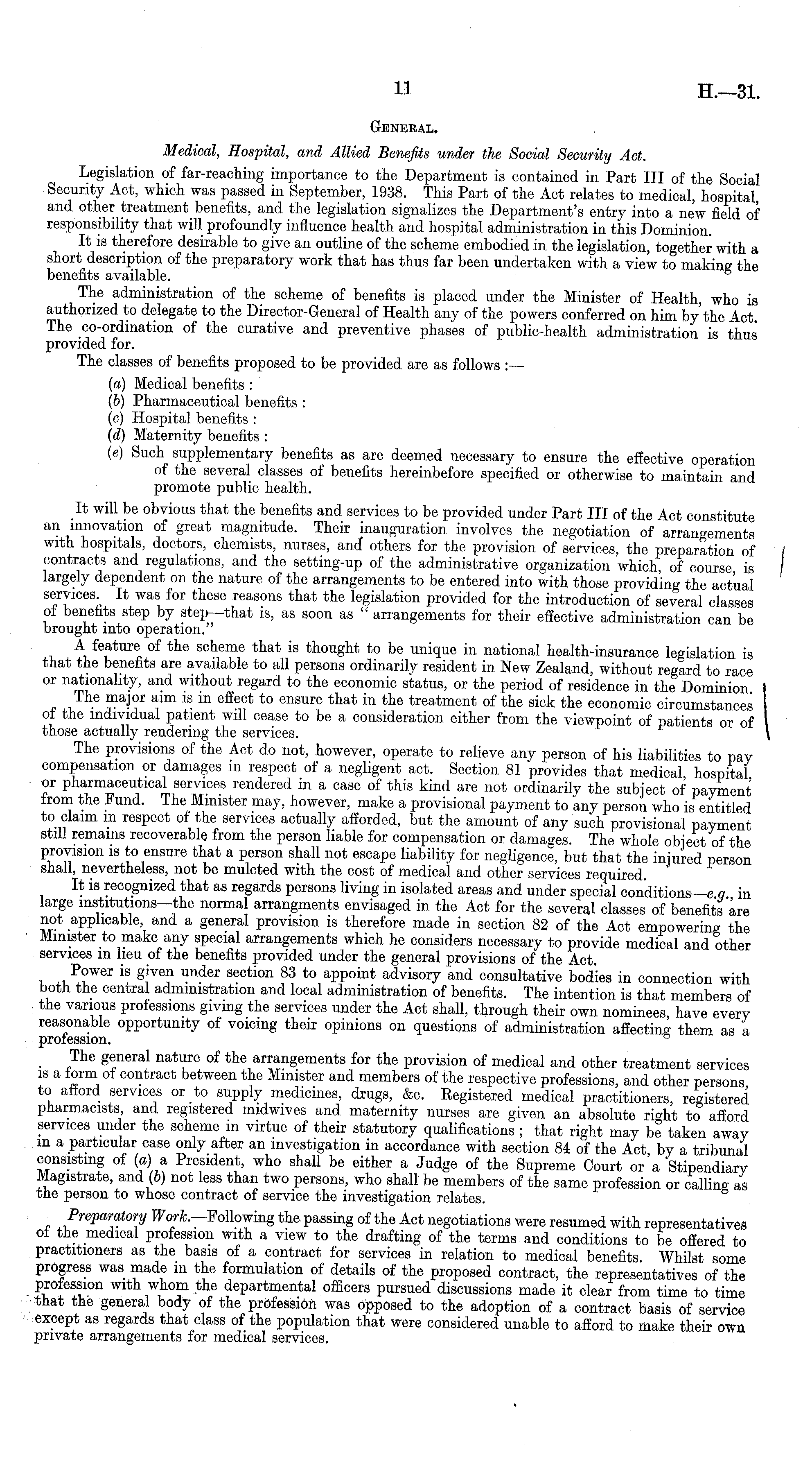 General. Medical, Hospital, and Allied Benefits under the Social Security Act. Legislation of far-reaching importance to the Department is contained in Part 111 of the Social Security Act, which was passed in September, 1938. This Part of the Act relates to medical, hospital, and other treatment benefits, and the legislation signalizes the Department's entry into a new field of responsibility that will profoundly influence health and hospital administration in this Dominion. It is therefore desirable to give an outline of the scheme embodied in the legislation, together with a short description of the preparatory work that has thus far been undertaken with a view to making the benefits available. The administration of the scheme of benefits is placed under the Minister of Health, who is authorized to delegate to the Director-General of Health any of the powers conferred on him by the Act. The co-ordination of the curative and preventive phases of public-health administration is thus provided for. The classes of benefits proposed to be provided are as follows :— (а) Medical benefits : (б) Pharmaceutical benefits : (c) Hospital benefits : (d) Maternity benefits : (e) supplementary benefits as are deemed necessary to ensure the effective operation of the several classes of benefits hereinbefore specified or otherwise to maintain and promote public health. It will be obvious that the benefits and services to be provided under Part 111 of the Act constitute an innovation of great magnitude. Their inauguration involves the negotiation of arrangements with hospitals, doctors, chemists, nurses, and others for the provision of services, the preparation of contracts and regulations, and the setting-up of the administrative organization which, of course is I largely dependent on the nature of the arrangements to be entered into with those providing the actual services. It was for these reasons that the legislation provided for the introduction of several classes of benefits step by step—that is, as soon as " arrangements for their effective administration can be brought into operation." A feature of the scheme that is thought to be unique in national health-insurance legislation is that the benefits are available to all persons ordinarily resident in New Zealand, without regard to race or nationality, and without regard to the economic status, or the period of residence in the Dominion. | The major aim is in effect to ensure that in the treatment of the sick the economic circumstances I ot the individual patient will cease to be a consideration either from the viewpoint of patients or of 1 those actually rendering the services. \ The provisions of the Act do not, however, operate to relieve any person of his liabilities to pay compensation or damages in respect of a negligent act. Section 81 provides that medical, hospital or pharmaceutical services rendered in a case of this kind are not ordinarily the subject of payment from the Fund. The Minister may, however, make a provisional payment to any person who is entitled to claim in respect of the services actually afforded, but the amount of any such provisional payment still remains recoverable from the person liable for compensation or damages. The whole object of the provision is to ensure that a person shall not escape liability for negligence, but that the injured person shall, nevertheless, not be mulcted with the cost of medical and other services required. It is recognized that as regards persons living in isolated areas and under special conditions—e q in large institutions—the normal arrangments envisaged in the Act for the several classes of benefits are not applicable and a general provision is therefore made in section 82 of the Act empowering the Minister to make any special arrangements which he considers necessary to provide medical and other services in lieu of the benefits provided under the general provisions of the Act. ,i, P ° wcr 18 gj ve ? under section 83 to appoint advisory and consultative bodies in connection with both the central administration and local administration of benefits. The intention is that members of the various professions giving the services under the Act shall, through their own nominees, have every reasonable opportunity of voicing their opinions on questions of administration affecting them as a protession. ° The general nature of the arrangements for the provision of medical and other treatment services is a term of contract between the Minister and members of the respective professions, and other persons to afford services or to supply medicines, drugs, &c. Registered medical practitioners, registered pharmacists, and registered midwives and maternity nurses are given an absolute right to afford services under the scheme m virtue of their statutory qualifications ; that right may be taken away m a particular case only after an investigation in accordance with section 84 of the Act by a tribunal consisting of (a) a President, who shall be either a Judge of the Supreme Court or a Stipendiary Magistrate, and (b) not less than two persons, who shall be members of the same profession or calling as the person to whose contract of service the investigation relates. Preparatory Work.—Following the passing of the Act negotiations were resumed with representatives o the medical profession with a view to the drafting of the terms and conditions to be offered to practitioners as the basis of a contract for services in relation to medical benefits. Whilst some progress was made in the formulation of details of the proposed contract, the representatives of the profession with whom the departmental officers pursued discussions made it clear from time to time that the general body of the profession was opposed to the adoption of a contract basis of service except as regards that class of the population that were considered unable to afford to make their own private arrangements for medical services.