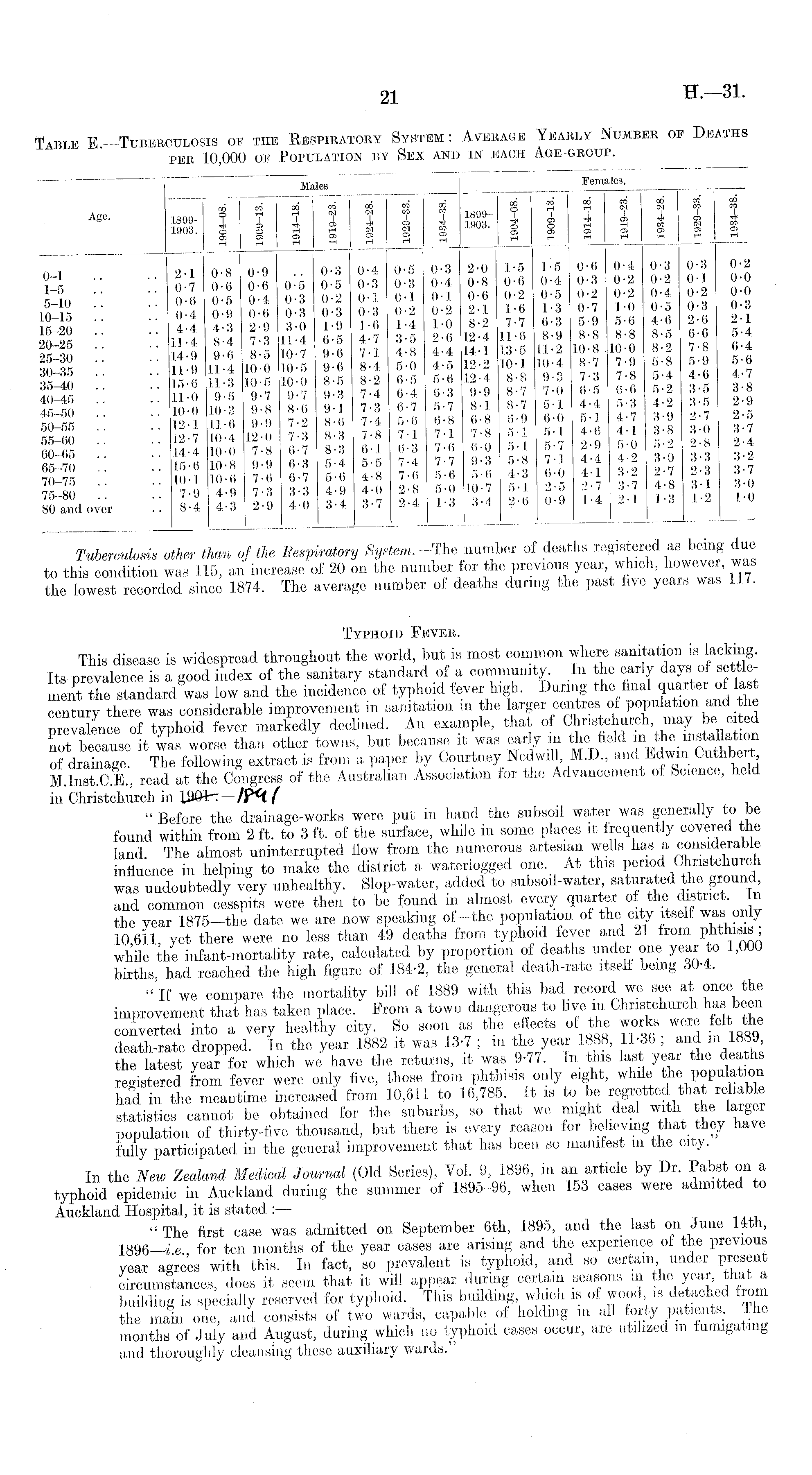 Tuberculosis other than of the Respiratory System.-The number of deaths registered as being due to this condition was 115, ail increase of 20 on the number for the previous year which, however, was the lowest recorded since 1874. The average number of deaths during the past five years was 117. Typhoid Fever. This disease is widespread throughout the world, but is most common where sanitation is lacking. Its prevalence is a good index of the sanitary standard of a community. In the early days of settlement the standard was low and the incidence of typhoid fever high. During the_final quart;ei-of last century there was considerable improvement m sanitation in the larger centres of population and the prevalence of typhoid fever markedly declined. An example, that of Christchurch may be cited not because it was worse than other towns, but because it was early m of drainage. The following extract is from a paper by Courtney Nedwil, M.D., and Edwm Cuthbert, M.lnst.C.E., read at the Congress of the Australian Association for the Advancement of Science, he. in Christchurch in !?H( " Before the drainage-works were put in hand the subsoil water was generally to be found within from 2 ft. to 3 ft. of the surface, while m some places it frequently covered the land The almost uninterrupted How from the numerous artesian wells has a considerable influence in helping to make the district a waterlogged one. At this period Christchurch was undoubtedly very unhealthy. Slop-water, added to subsoil-water, saturated the ground, and common cesspits were then to be found m almost every quarter of the district. In the year 1875—the date we are now speaking of—the population of the city itself was only 10 611 yet there were no less than 49 deaths from typhoid fever and 21 from phthisis, while the infant-mortality rate, calculated by proportion of deaths under one year to 1,000 births, had reached the high figure of 184-2, the general death-rate itself being . "If we compare the mortality bill of 1889 with this bad record we see at once the improvement that has taken place. From a town dangerous to live m Christchurch has been converted into a very healthy city. So soon as the eflects of the works were felt the death-rate dropped. In the year 1882 it was 13-7 ; m the year 1888, 11-36 , and in 1889, the latest year for which we have the returns, it was 9-77. In this last year the deaths registered from fever were only five, those from phthisis only eight, while the population had in the meantime increased from 10,611 to 16,785. It is to be regretted that reliable statistics cannot, be obtained for the suburbs, so that we might deal with the iarger population of thirty-five thousand, but there is every reason for believing that they have fully participated in the general improvement that has been so manifest in the city. In the New Zealand Medical Journal (Old Series), Vol. 9, 1896 in an article by Dr. Pabst on a typhoid epidemic in Auckland during the summer of 1895-96, when 153 cases were admitted to Auckland Hospital, it is stated : — " The first case was admitted on September 6th, 1895, and the last on June 14th, 1896 —i e ., for ten months of the year cases are arising and the experience of the previous year agrees with this. In fact, so prevalent is typhoid, and so certain, under present circumstances, does it seem that it will appear during certain seasons in the year that a building is specially reserved for typhoid. This building which is of wood is detached from the main one, and consists of two wards, capable of holding in all loity patients. . months of July and August, during which no typhoid cases occur, are utilized m fumigating and thoroughly cleansing these auxiliary wards.