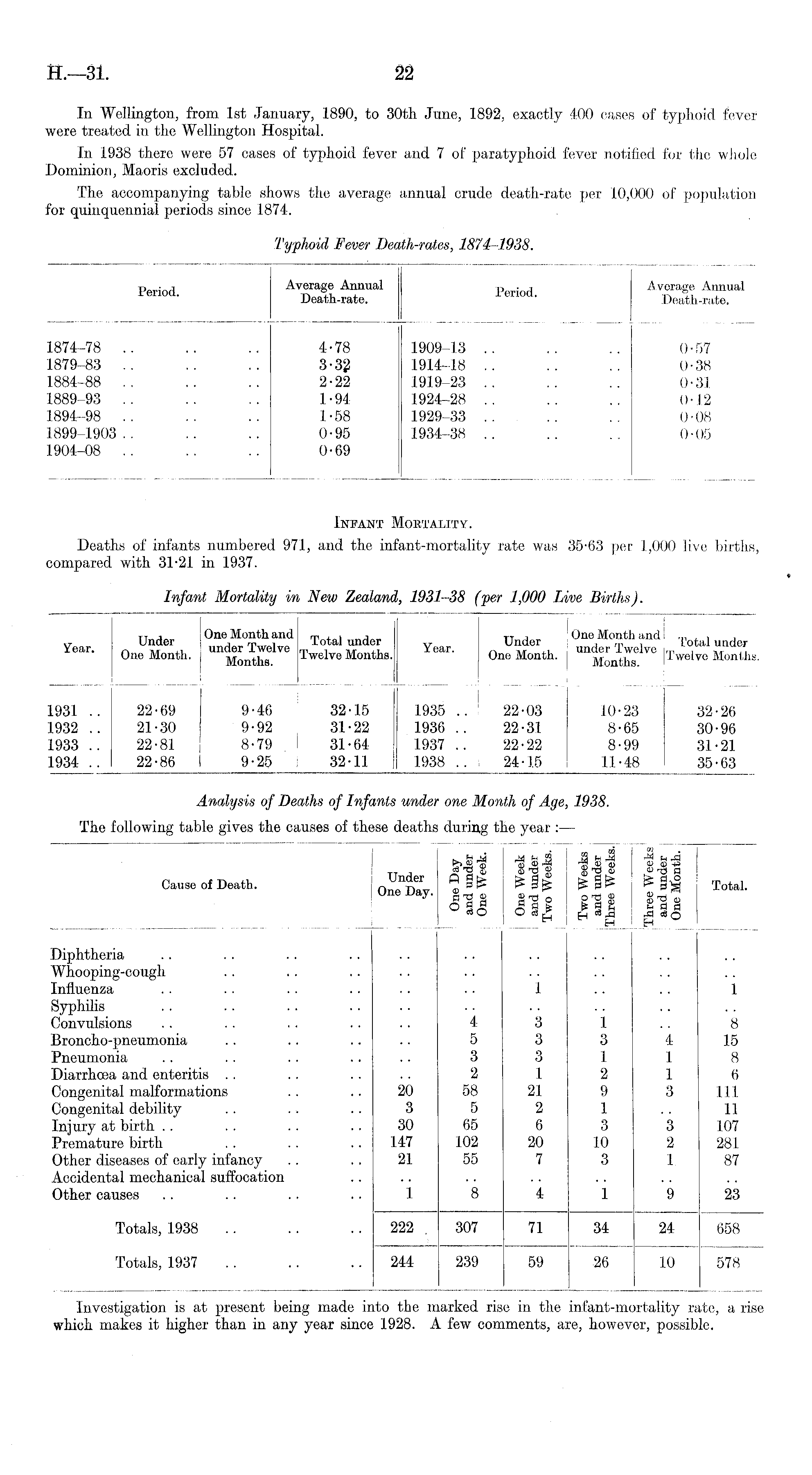 In Wellington, from Ist January, 1890, to 30th June, 1892, exactly 400 cases of typhoid fever were treated in the Wellington Hospital. In 1938 there were 57 cases of typhoid fever and 7 of paratyphoid fever notified for the whole Dominion, Maoris excluded. The accompanying table shows the average annual crude death-rate per 10,000 of population for quinquennial periods since 1874.