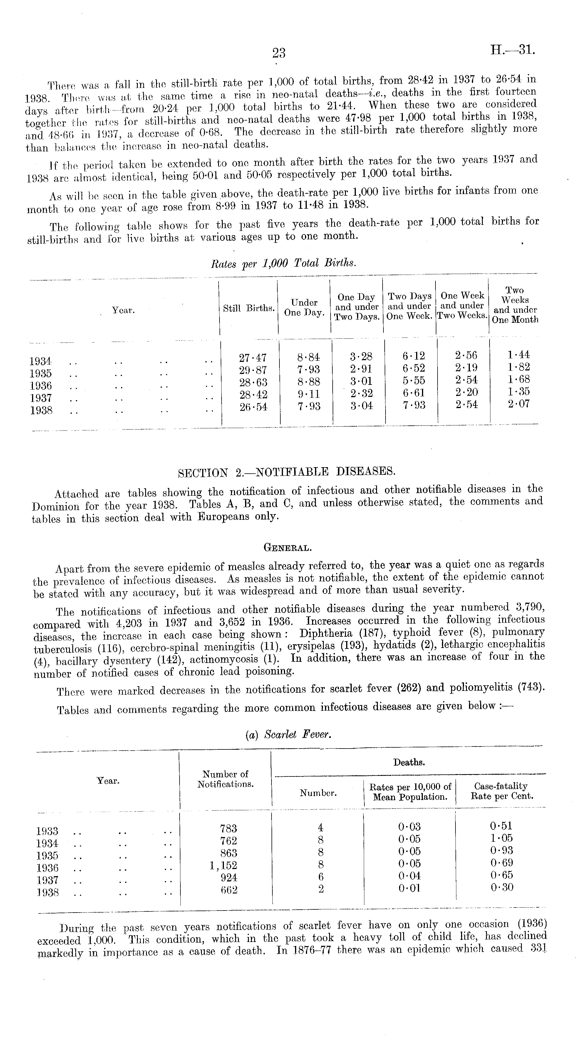 There was a fall in the still-birth rate per 1,000 of total births, from 28-42 in 1937 to 26-54 in 1938. There was at the same time a rise in neo-natal deaths —i.e., deaths in the first fourteen davs after birth—from 20-24- per 1,000 total births to 21-44. When these two are considered together the ratee for still-births and neo-natal deaths were 47-98 per 1,000 total births m 1938, and 48-66 in 1937, a decrease of 0-68. The decrease in the still-birth rate therefore slightly more than balances the increase in neo-natal deaths. If the period taken be extended to one month after birth the rates for the two years 1937 and 1938 arc almost identical, being 50-01 and 50-05 respectively per 1,000 total births. As will be seen in the table given above, the death-rate per 1,000 live births for infants from one month to one year of age rose from 8-99 in 1937 to 11-48 in 1938. The following table shows for the past five years the death-rate per 1,000 total births for still-births and for live births at various ages up to one month.